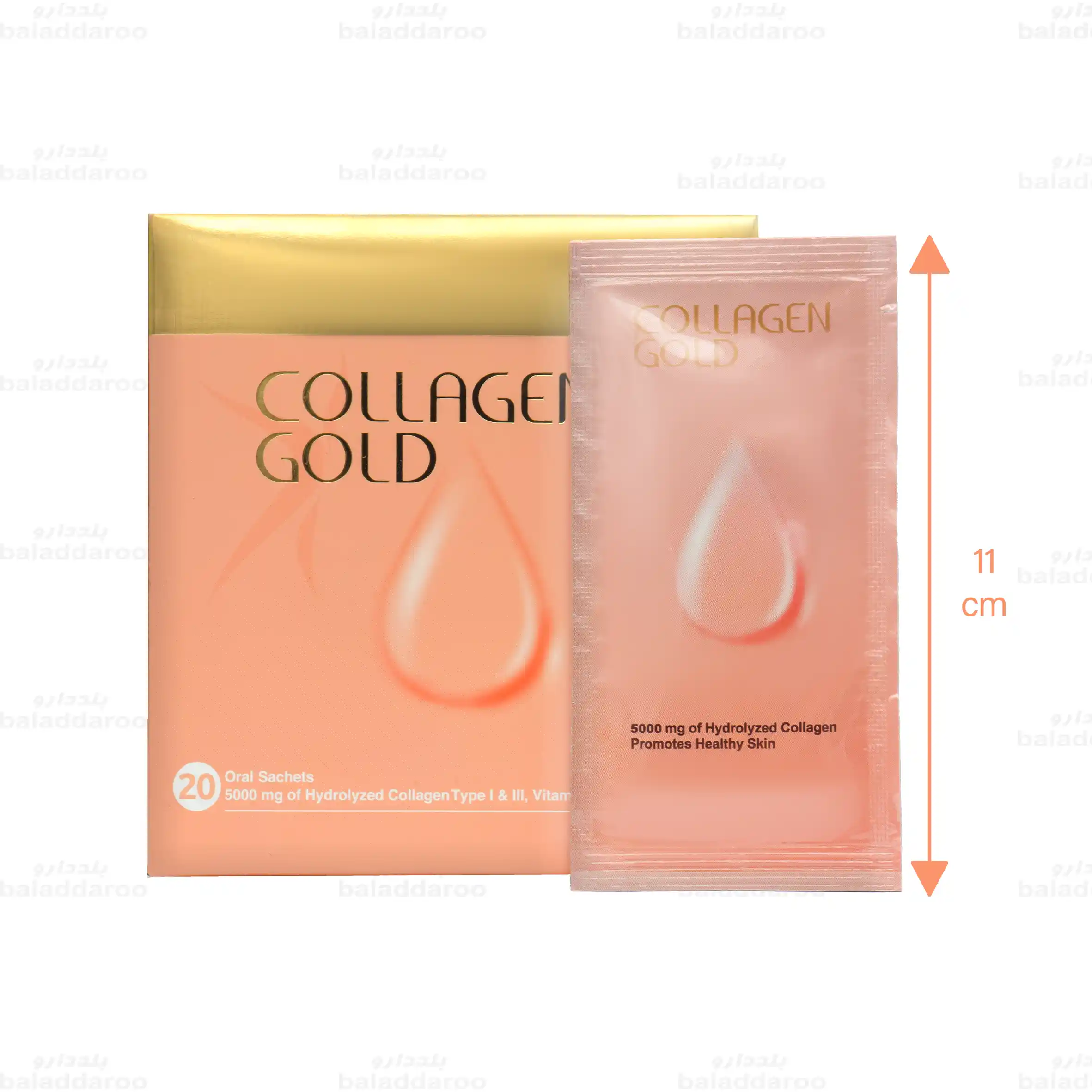 پودر کلاژن گلد حاوی 5000 میلی گرم کلاژن هیدرولیز شده از نوع 1 و 3، هیالورونیک اسید و ویتامین سی است که به افزایش سنتز کلاژن، تامین کلاژن و آبرسانی پوست کمک می کند. همچنین اثر ضد پیری دارد.