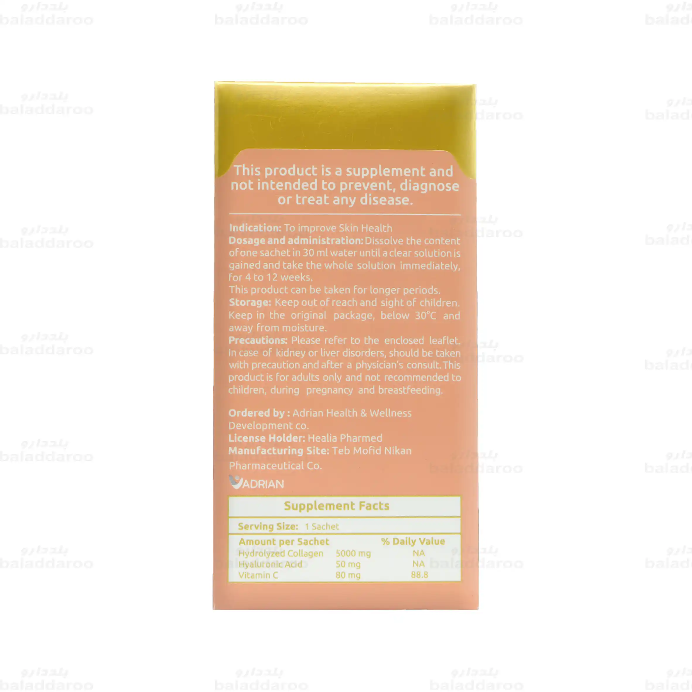 این مکمل حاوی 5000 میلی گرم کلاژن هیدرولیز شده از نوع 1 و 3، هیالورونیک اسید و ویتامین سی است که به افزایش سنتز کلاژن، تامین کلاژن و آبرسانی پوست کمک می کند. همچنین اثر ضد پیری دارد. برند آدریان این فرآورده را برای افرادی که در بلع قرص کلاژن گلد دچار مشکل می شوند، تولید کرده است.