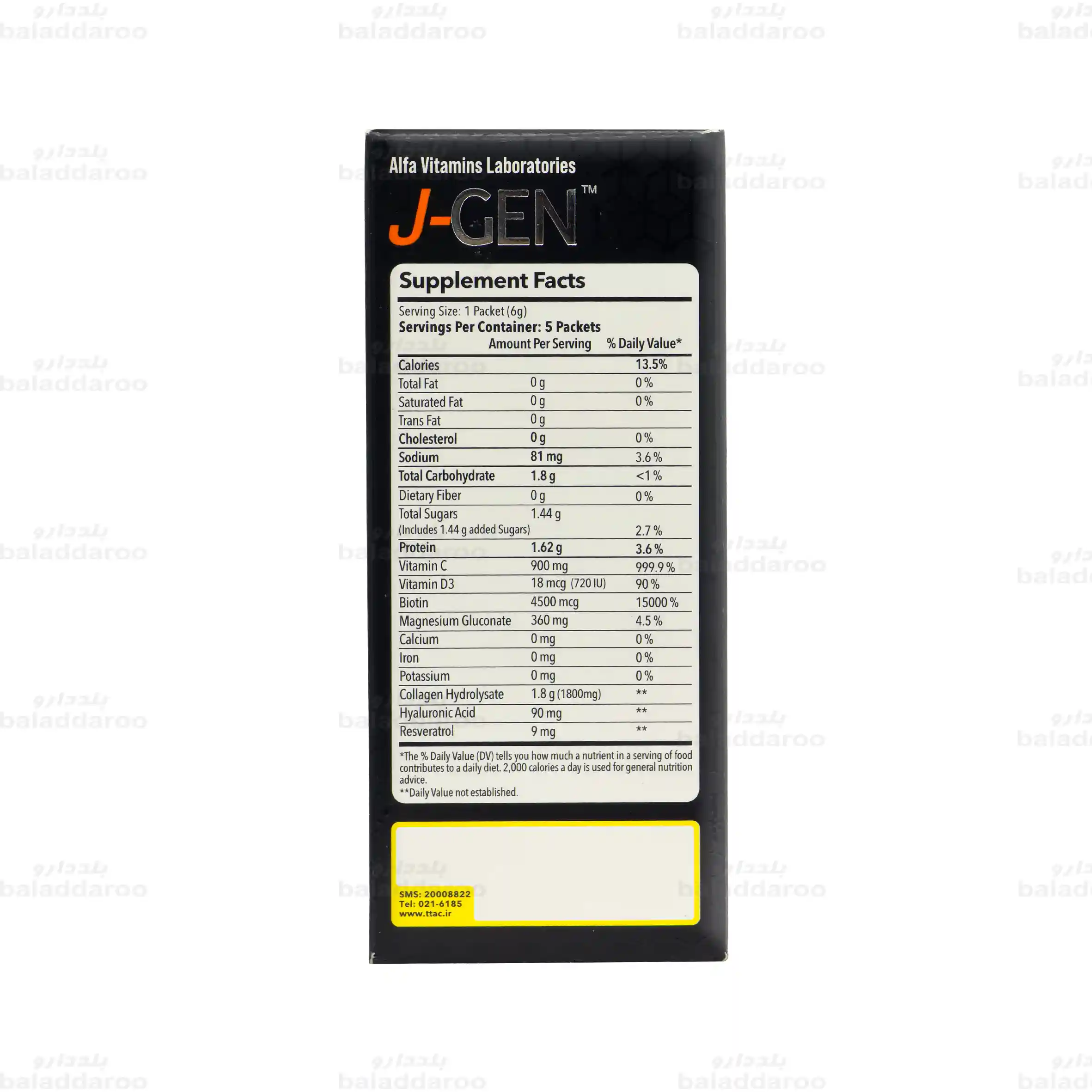 پودر جی جن آلفا با طعم پرتقال منبعی سرشار از آنتی اکسیدان ها و مواد مغذی مانند کلاژن هیدرولیز شده، هیالورونیک اسید، بیوتین و … است که در سلامت پوست، مو و ناخن، تامین کلاژن و کاهش علائم پیری پوست نقش دارد.