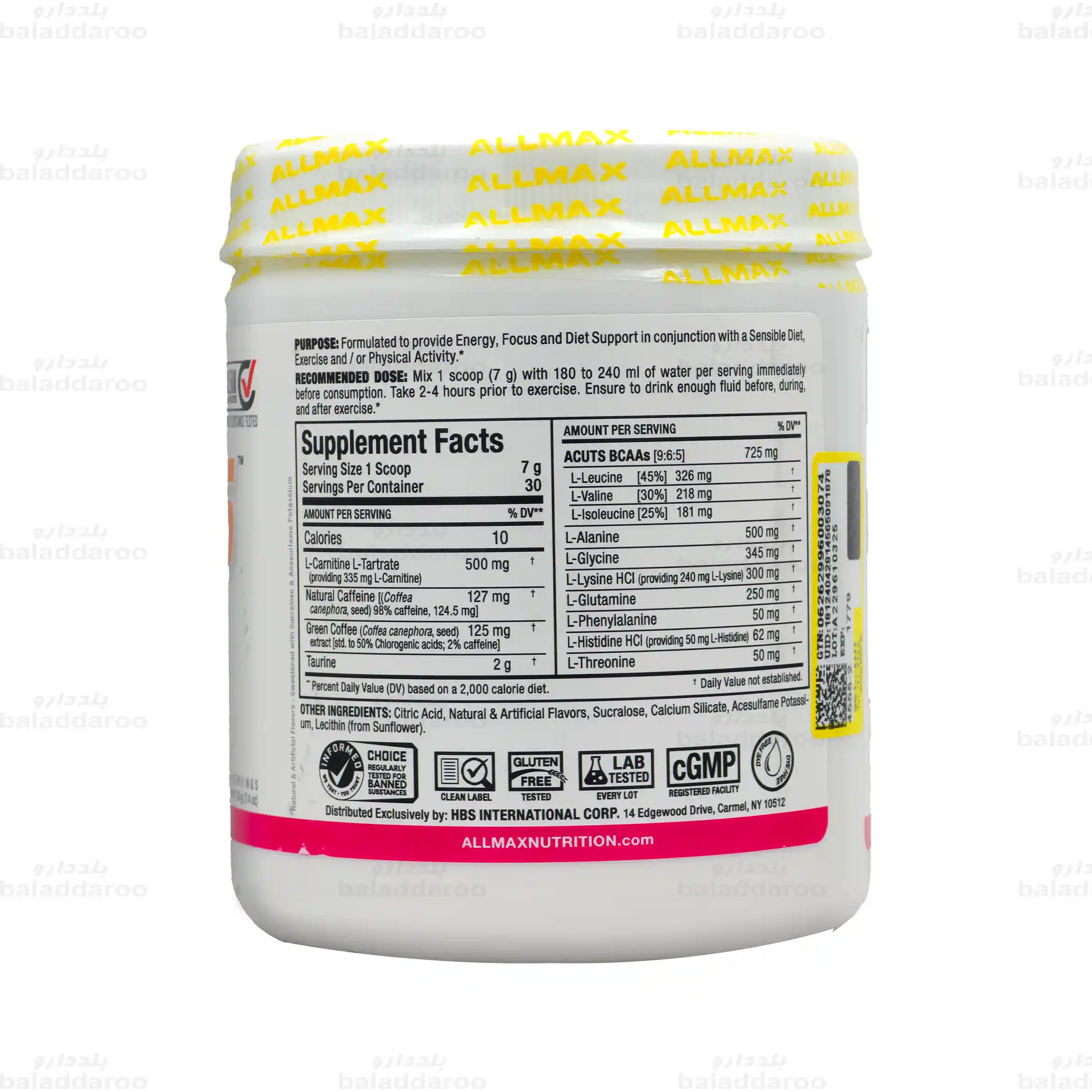 این مکمل حاوی کافئین طبیعی، قهوه سبز و سرشار از اسید آمینه های ضروری است که یکی از مکمل های محبوب پیش از تمرین میان ورزشکاران است. این محصول به کاهش وزن، چربی سوزی، افزایش انرژی، کاهش خستگی و تسریع روند ریکاوری عضلات کمک می کند و نقش اساسی در بهبود عملکرد ورزشی، بازسازی عضلات و عضله سازی دارد. این پودر فاقد شکر و گلوتن می باشد که تحت لیسانس شرکت آلمکس نوتریشن کانادا توسط شرکت ویستا رادین آپادانا تهیه می گردد.