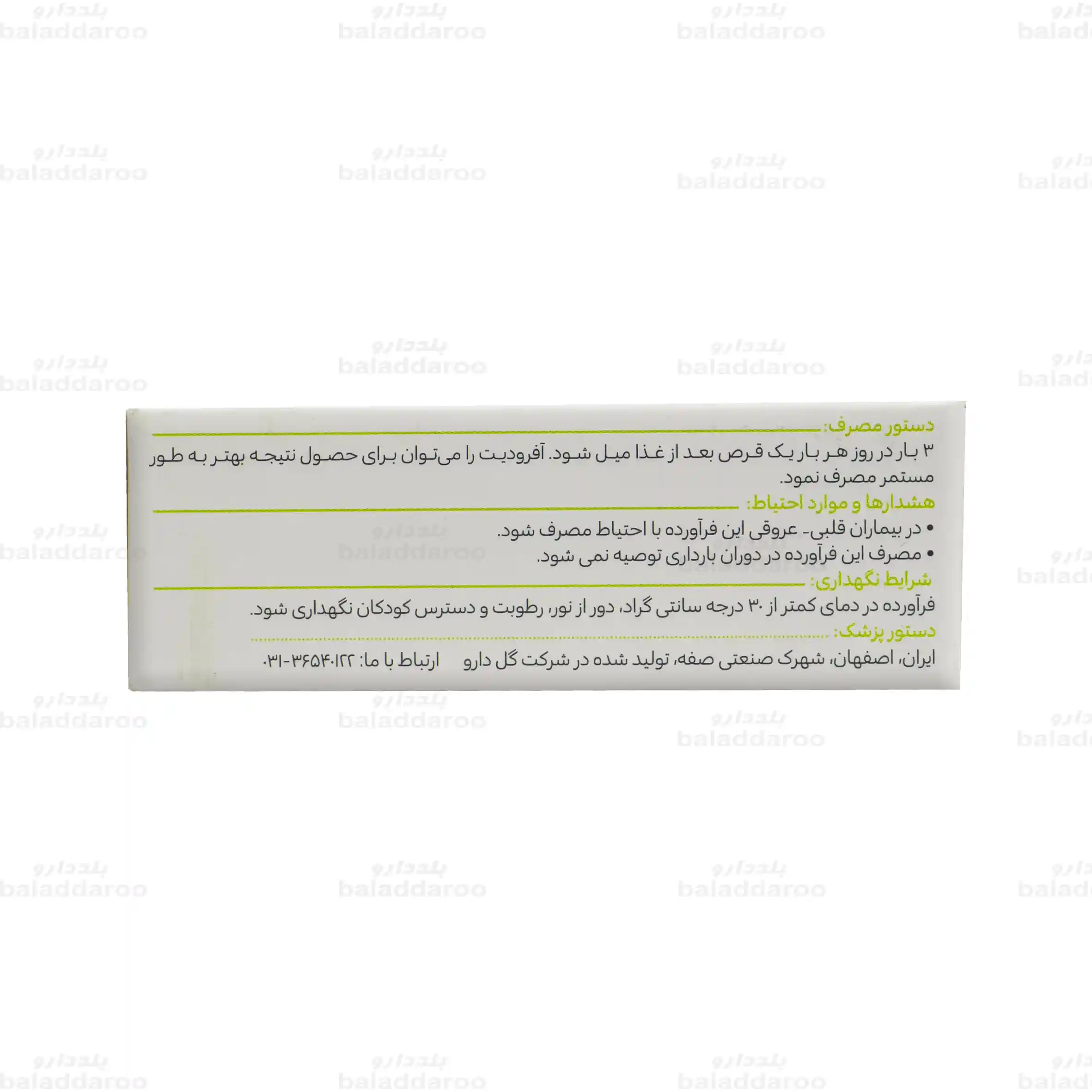 قرص آفرودیت گل دارو، مکملی گیاهی حاوی عصاره میوه خارخاسک (تریبولوس)، زنجبیل، دارچین و پودر زعفران است که در بهبود اختلالات جنسی مردان و زنان نقش دارد. این فرآورده با افزایش جریان خون در ناحیه تناسلی و تقویت هورمون های جنسی، به افزایش میل جنسی، رفع اختلالات نعوظ، کاهش زود انزالی و بهبود کیفیت روابط زناشویی کمک می کند. این فرآورده در بسته های 30 عددی توسط شرکت داروسازی گل دارو تهیه می شود.