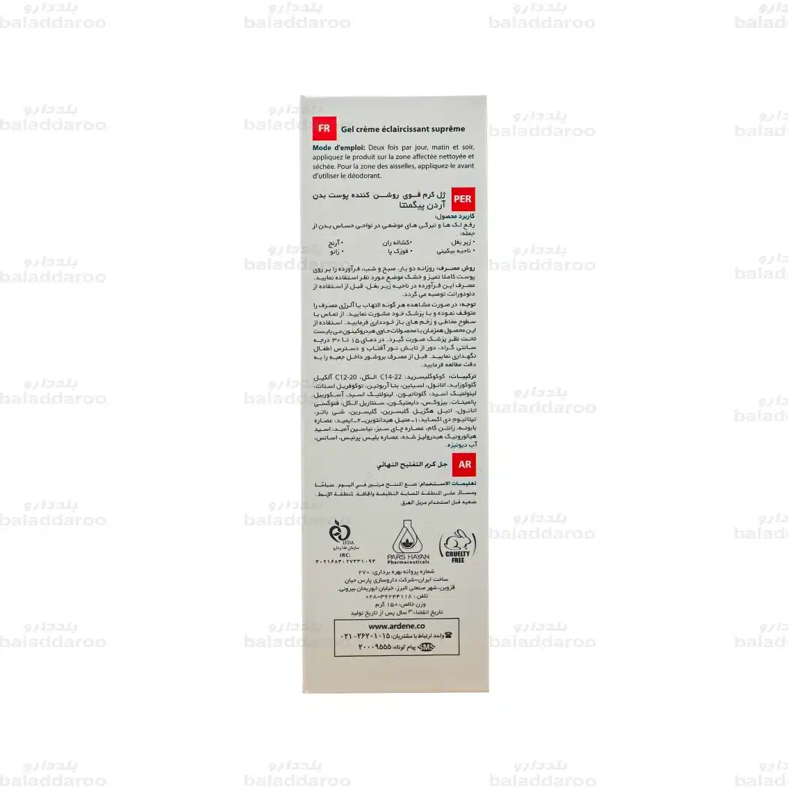 با خرید ژل کرم روشن کننده قوی بدن پیگمنتا آردن از داروخانه آنلاین بلد دارو، از اصالت کالا و تاریخ انقضای معتبر اطمینان کامل داشته باشید. تمامی محصولات ما با تضمین کیفیت عرضه می شوند تا شما تجربه ای ایمن و مطمئن از خرید داشته باشید. علاوه بر این، می توانید از تخفیف های ویژه و پیشنهادات مناسبتی بهرهمند شده و خریدی مقرون به صرفه را تجربه کنید.