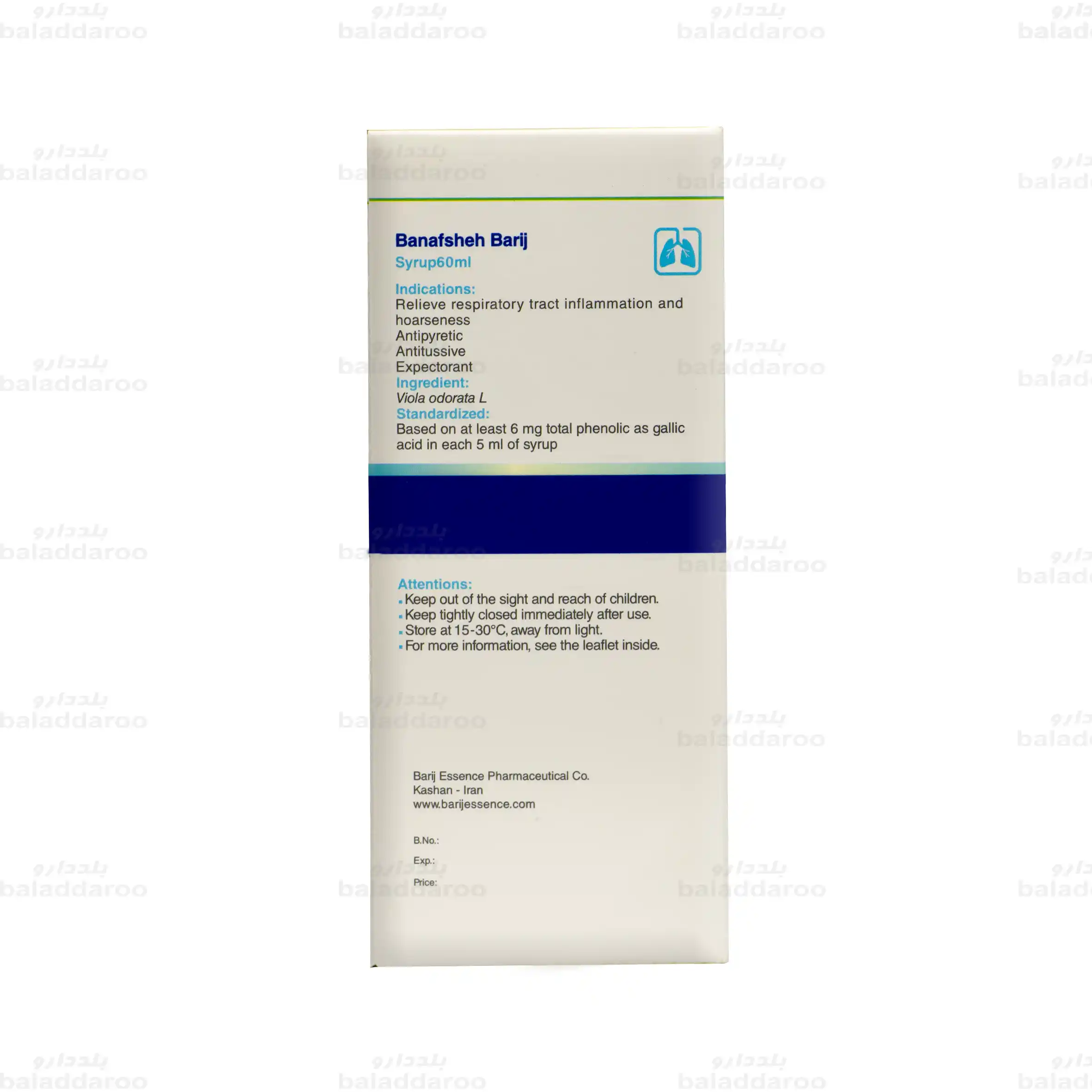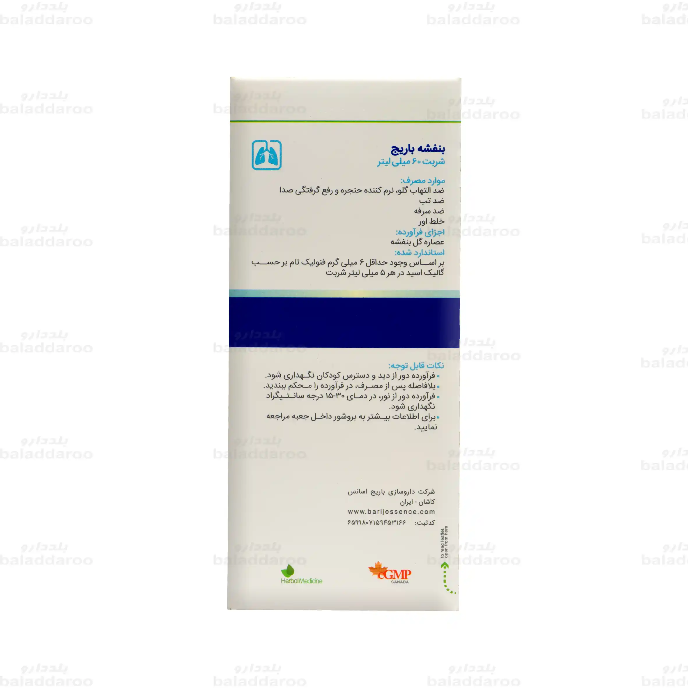 برای خرید شربت بنفشه باریج می توانید به سایت داروخانه آنلاین بلد دارو مراجعه نمایید و پس از کسب اطلاعات درباره فرآورده و تاریخ انقضای آن، سفارش خود را ثبت نمایید. بلد دارو علاوه بر تضمین اصالت کالاها و ارسال با بسته بندی مناسب، امکان دریافت مشاوره رایگان از کارشناسان علمی و داروسازان را برای شما فراهم آورده تا تجربه خریدی مطمئن و با اطمینان خاطر را برای شما فراهم سازد.