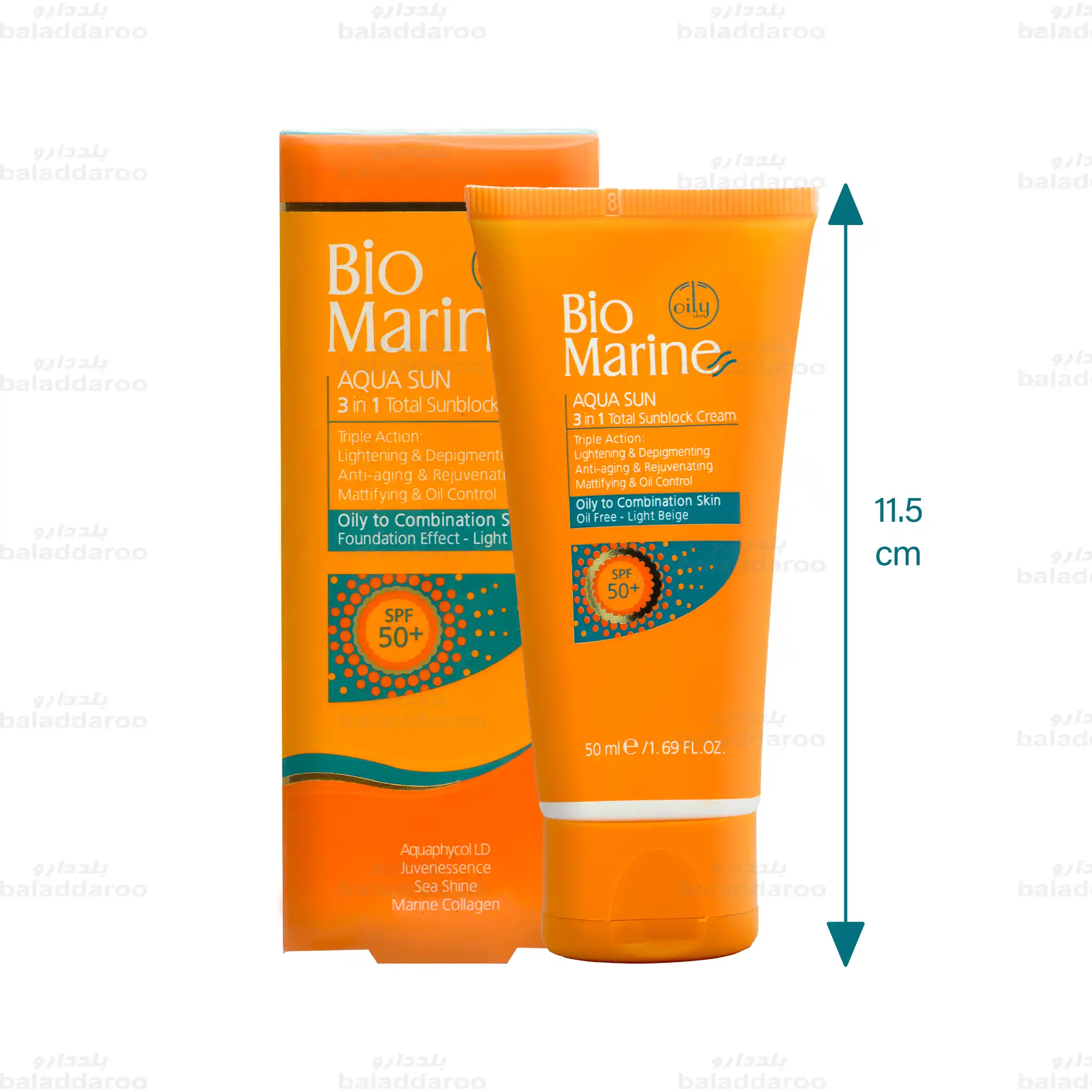 کرم ضد آفتاب روشن کننده و ضد چروک بایومارین پوست چرب SPF50 حجم 50 میلی لیتر