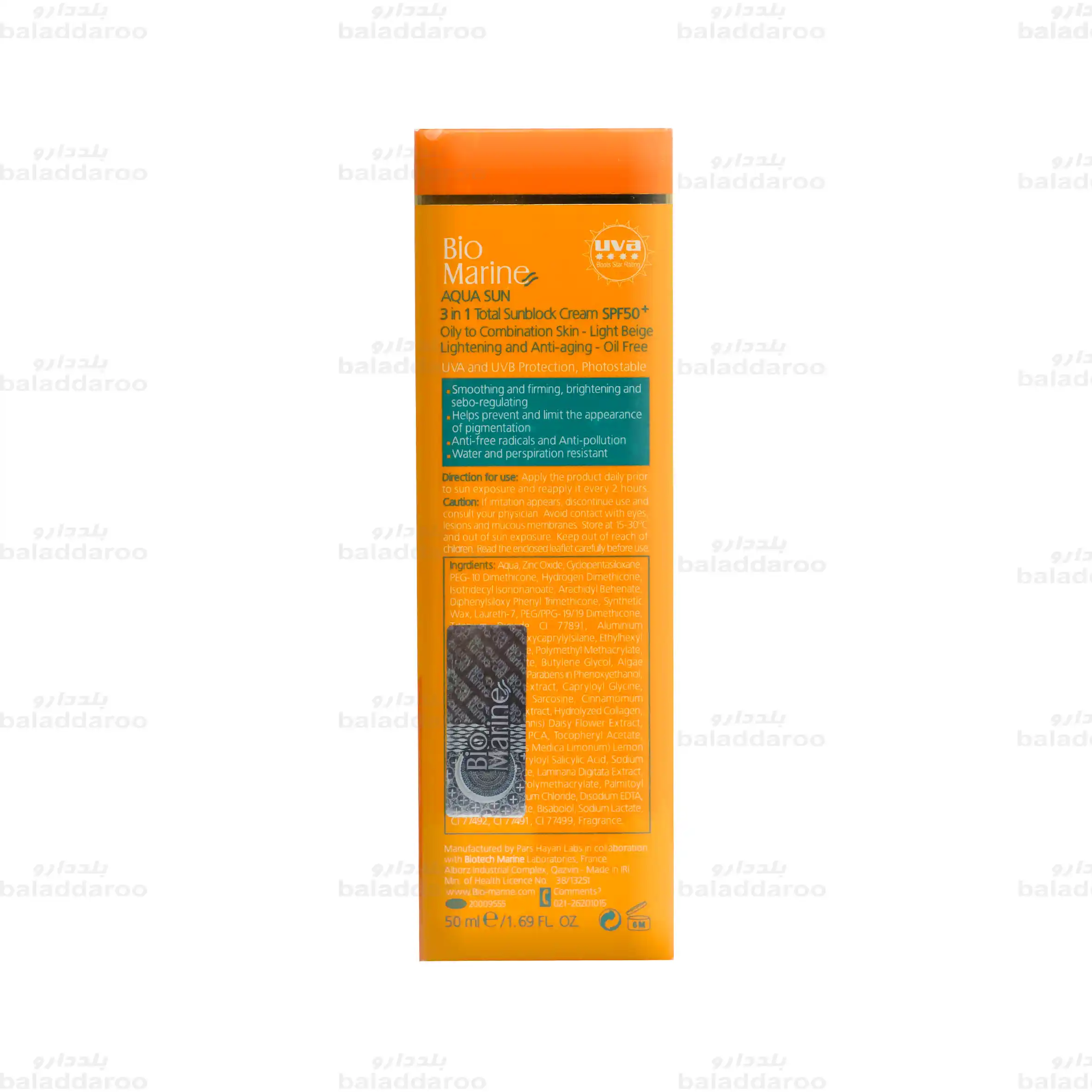 این محصول با رنگ بژ روشن، حاوی عصاره جلبک های دریایی، فاقد چربی و مقاوم در برابر تعریق و شستشو است. این فرآورده علاوه بر محافظت طولانی مدت در برابر اشعه های مضر نور خورشید با SPF50، در جلوگیری و رفع تدریجی لک های پوست، روشن شدن و کاهش چین و چروک نقش دارد و پوستی شاداب، جوان و یکنواخت را برای شما به ارمغان می آورد.