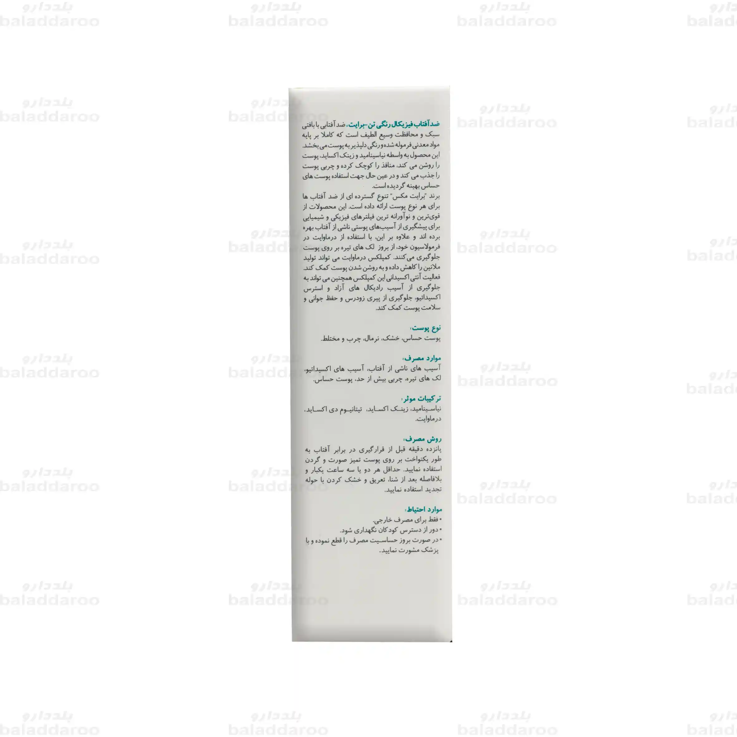 قیمت کرم ضد آفتاب فیزیکال رنگی تن برایت برایت مکس مانند تمام محصولات موجود در داروخانه آنلاین بلد دارو تحت نظارت سازمان غذا و دارو و طبق فاکتورهای رسمی شرکت های تولیدی و توزیعی تعیین می گردد.
