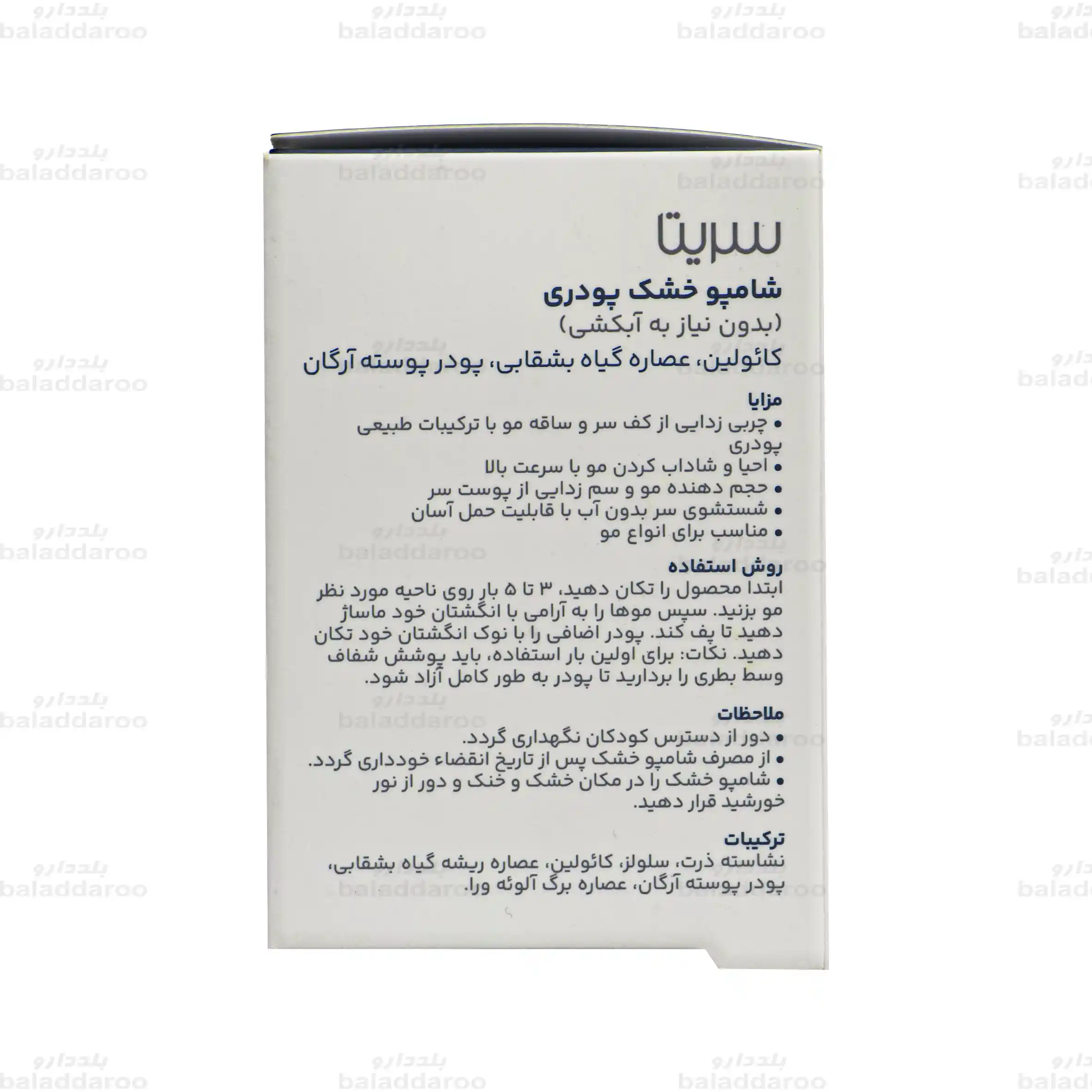 شامپو خشک پودری سریتا بدون نیاز به آب، چربی مو را جذب کرده و ظاهر مو ها را تمیز و حجیم نشان می دهد. این محصول با ترکیباتی طبیعی و فرمول ملایم، گزینه ای سریع و کاربردی است.