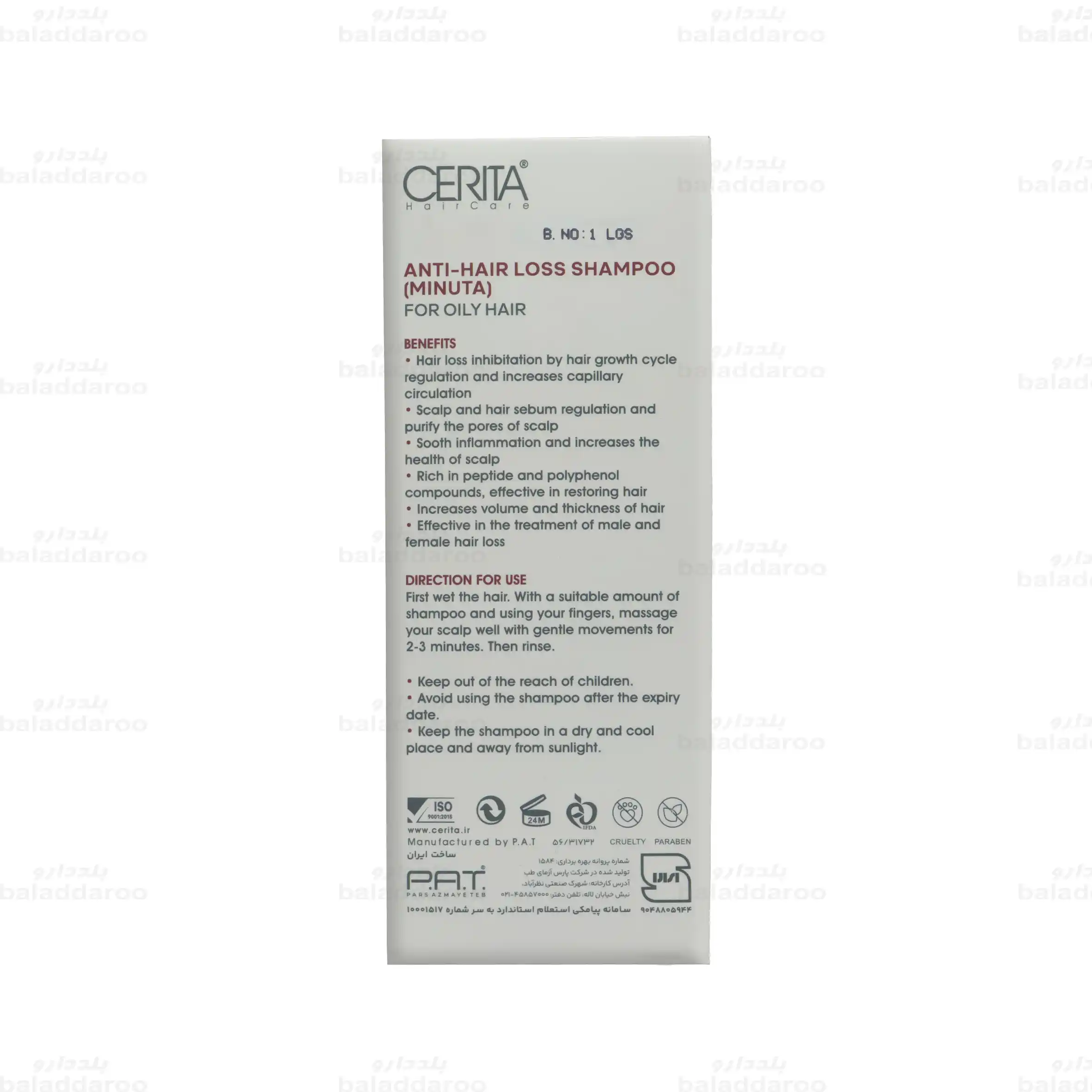 این محصول با افزایش گردش خون مویرگی و تنظیم ترشح چربی پوست سر و مو، به جلوگیری از ریزش مو و افزایش حجم و ضخامت موها کمک می کند. قیمت تمامی محصولات موجود در داروخانه آنلاین بلد دارو از جمله شامپو مینوتا سریتا برای موهای چرب بر اساس فاکتورهای رسمی شرکت های توزیعی و تحت نظارت سازمان غذا و دارو تعیین می گردد.