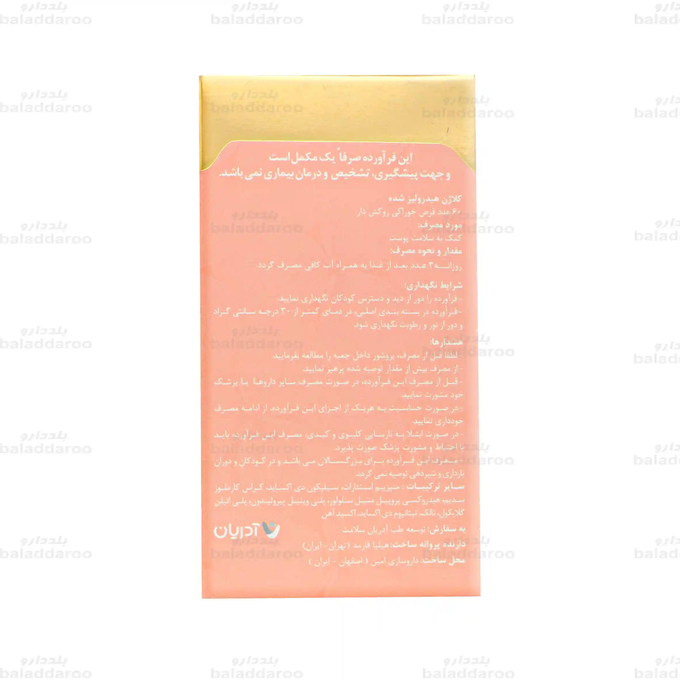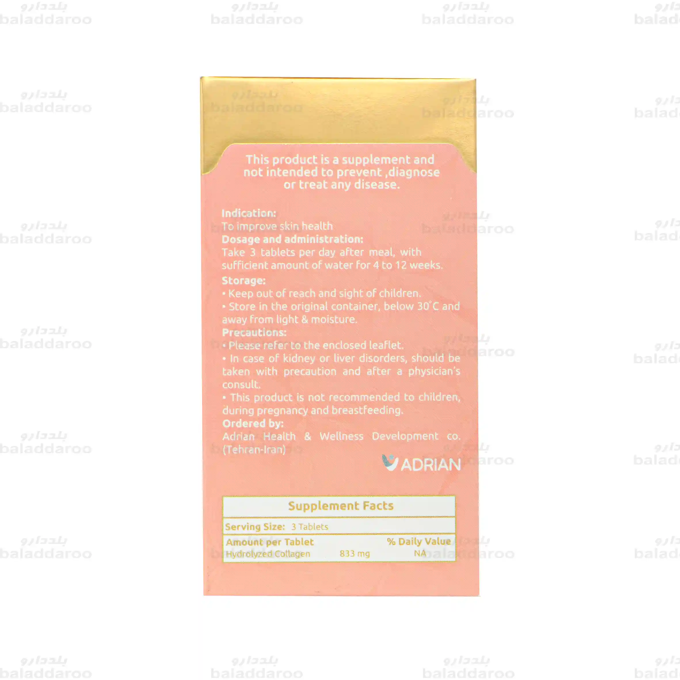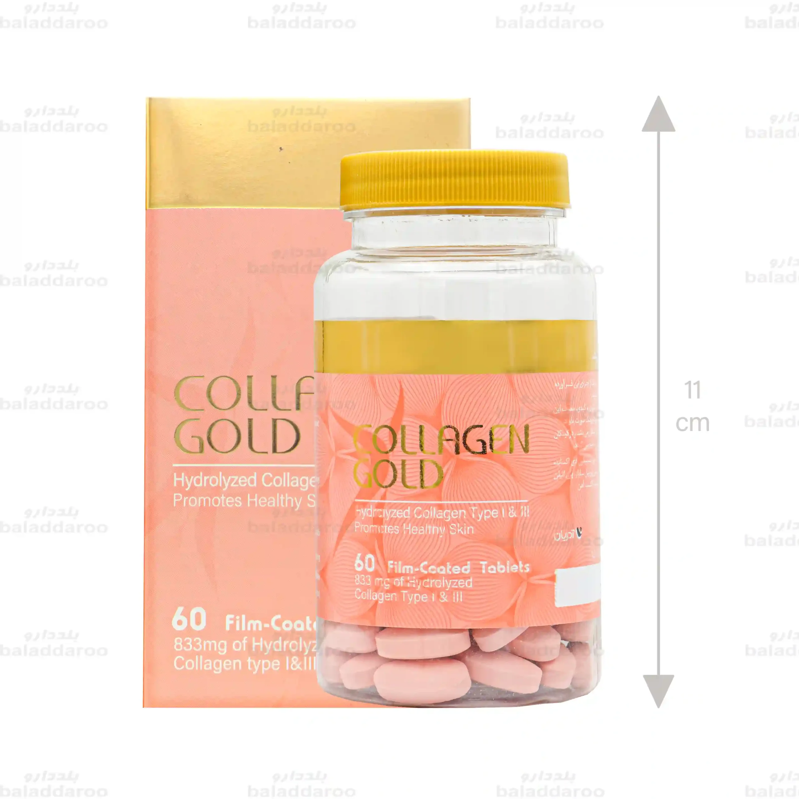 هر 3 قرص از این مکمل حاوی 833 میلی گرم کلاژن به فرم هیدرولیز شده است که به دلیل نقش آن بر سلامت پوست، از محبوبیت ویژه ای میان مصرف کنندگان برخوردار است. این فرآورده با تحریک کلاژن سازی، در بهبود سلامت پوست، افزایش آبرسانی، بهبود خاصیت ارتجاعی، افزایش استحکام، کاهش چین و چروک و جوانسازی پوست نقش مهمی ایفا می کند. قرص کلاژن گلد، در بسته های 60 عددی و به سفارش توسعه طب آدریان سلامت تهیه و تولید می شود.