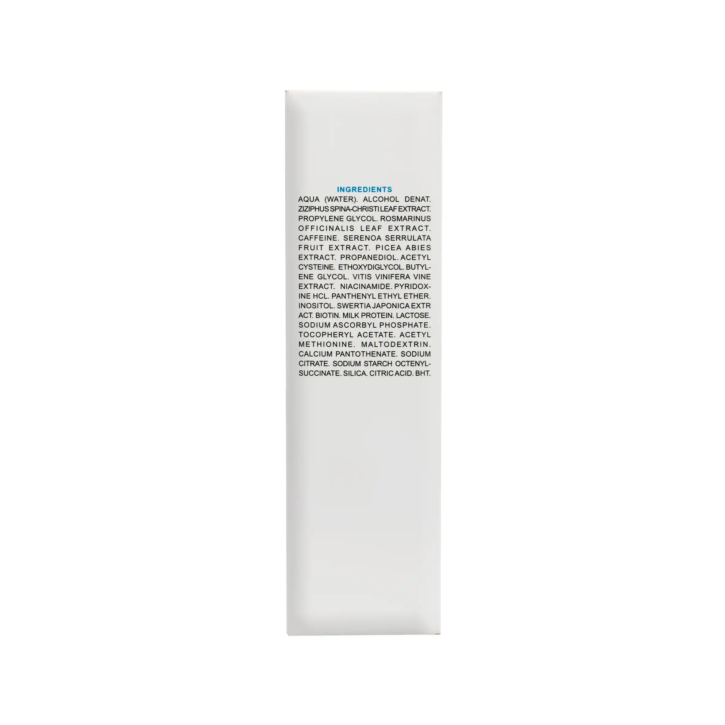 آکوا (آب)، الکل دنات، عصاره درخت کنار، پروپیلن گلیکول، عصاره برگ رزماری، کافئین، عصاره میوه نخل اره ای، عصاره میوه کاج نوئل، پروپاندیول، استیل سیستئین، اتیل دی گلیکول، بوتیلن گلیکول، عصاره انگور، نیاسینامید، پیریدوکسین HCL، پانتنیل اتیل اتر، اینوزیتول، عصاره Swertia Japonica، بیوتین، پروتئین شیر، لاکتوز، سدیم اسکوربیل فسفات، توکوفریل استات، استیل متیونین، مالتودکسترین، کلسیم پانتوتنات، سدیم سیترات، سدیم استارچ اکتنیل سوکسینات، سیلیکا، سیتریک اسید، BHT