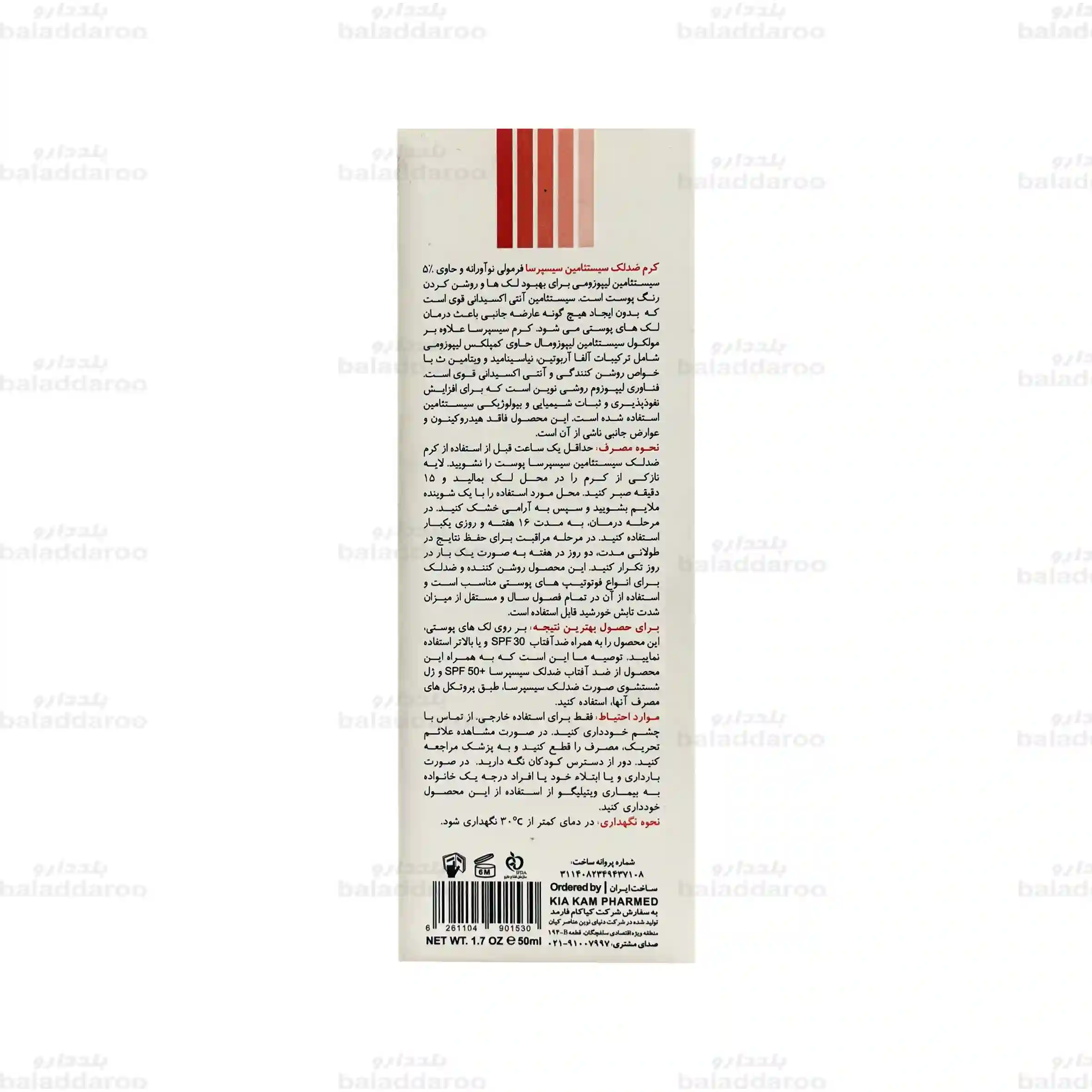 برای خرید کرم ضد لک سیسپرسا می توانید به وب سایت داروخانه آنلاین بلد دارو مراجعه نمایید و پس از کسب اطلاعات و بررسی نظرات کاربران، می توانید محصول را بر اساس نیازهای خود تهیه نمایید. تمامی محصولات با تضمین اصالت کالا و تاریخ انقضا معتبر، در کوتاه ترین زمان ممکن و با بسته بندی مناسب تحویل می گردد.