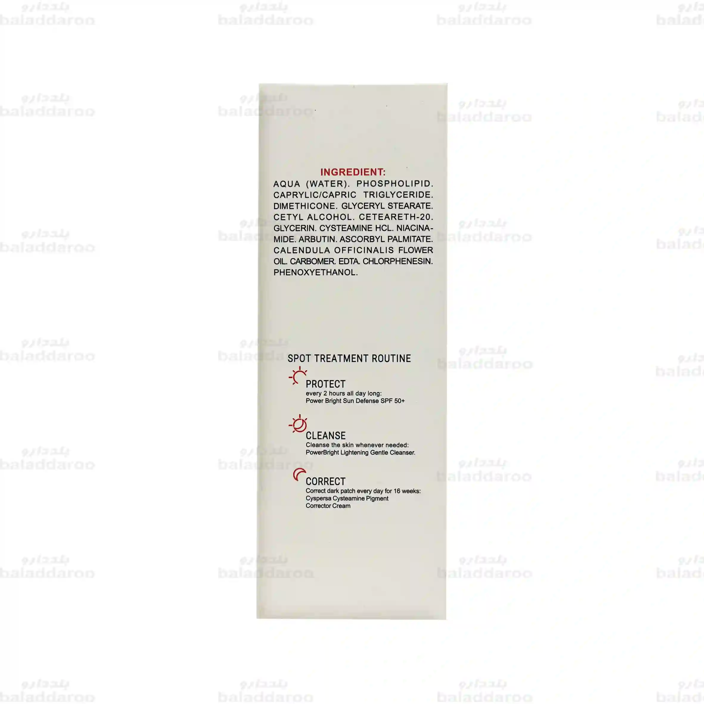 آکوا (آب)، فسفولیپید، کاپریلیک/ کاپریک تری گلیسرید، دایمتیکون، گلیسریل استئارات، ستیل الکل، ستئارات-20، گلیسرین، سیستئامین هیدروکلراید، نیاسینامید، آربوتین، اسکوربیل پالمیتات، روغن کالاندولا، کربومر، ا.د.ت.آ، کلروفنزین، فنوکسی اتانول