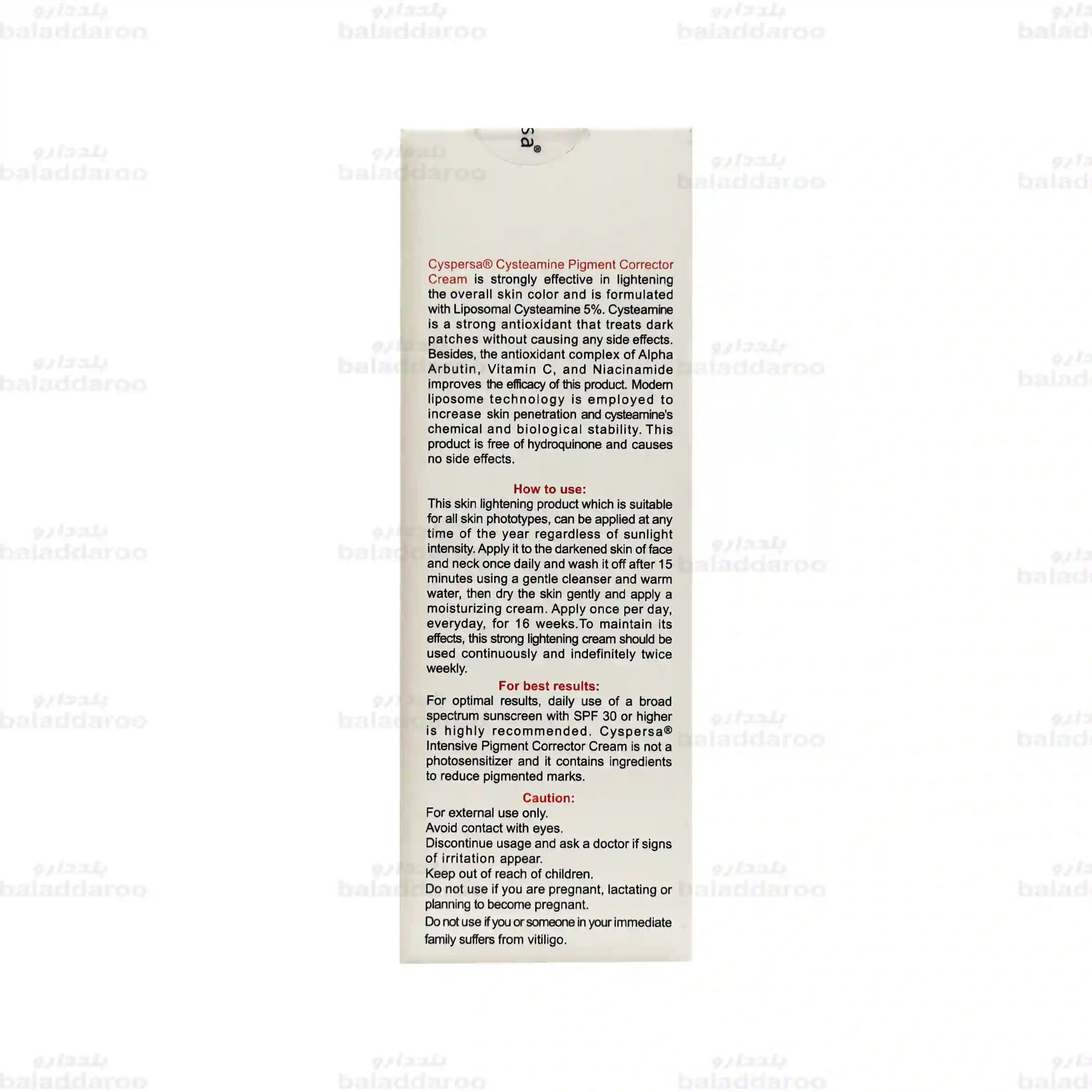 این محصول با فرمولاسیونی منحصر به فرد حاوی 5% سیستئامین لیپوزومی بوده که در بهبود لک ها و روشن کردن رنگ پوست نقش بسزایی دارد. فناوری لیپوزوم به کار رفته در این کرم، تکنولوژی ای جدید است که در افزایش نفوذپذیری و ثبات بیولوژیکی کاربرد دارد. همچنین با اثربخشی بالا و بدون هیچگونه عارضه ای مناسب برای آقایان و بانوان با هر نوع پوستی طراحی شده است.