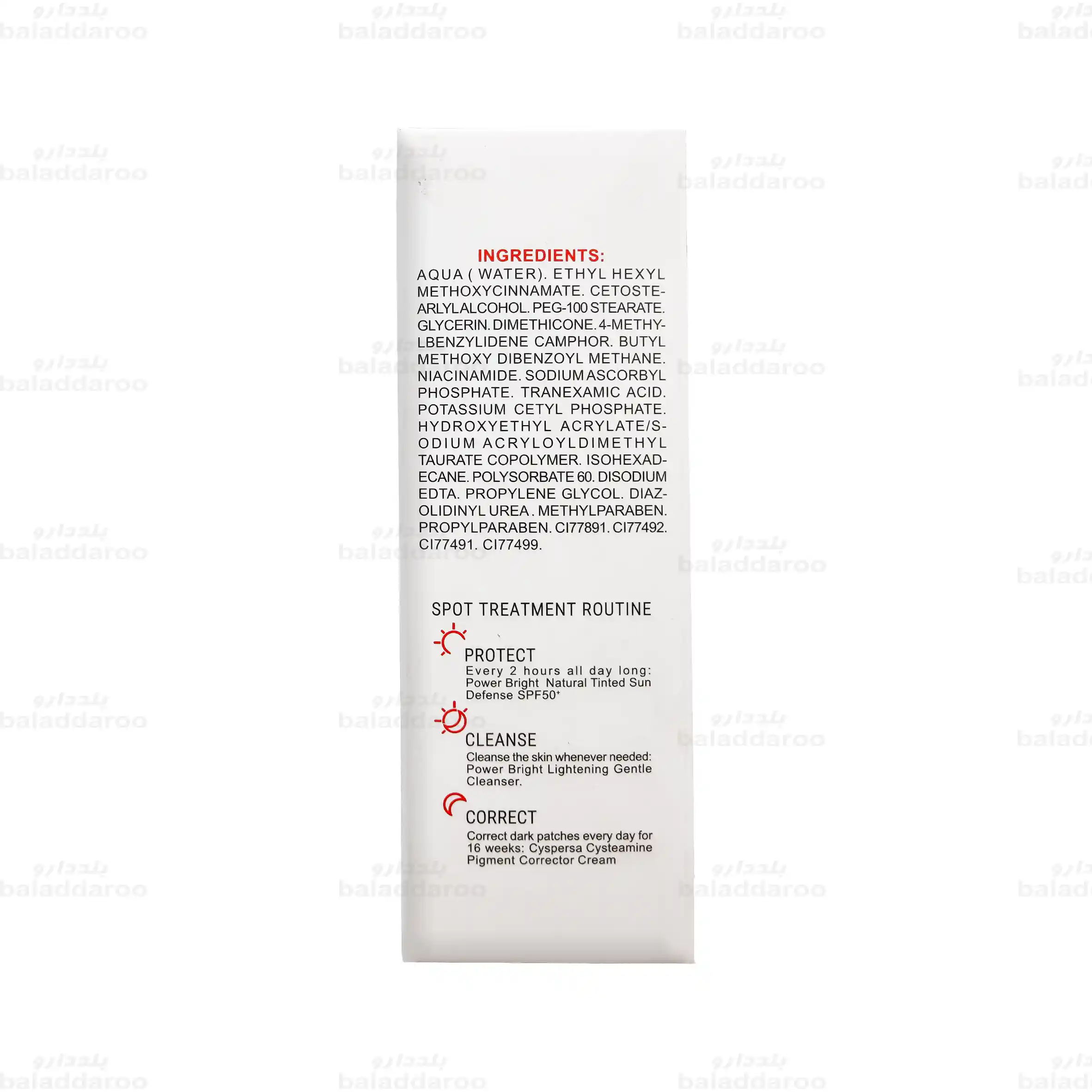 آکوا(آب)، اتیل هگزیل متوکسی سینامات، ستیل الکل، PEG-100 استئارات، گلیسرین، دایمتیکون، 4 متیل بنزیلیدین کامفور، بوتیل متوکسی دی بنزوئیل متان، نیاسینامید، سدیم آسکوربیل فسفات، ترانگزامیک اسید، پتاسیم ستیل فسفات، هیدروکسی اتیل آکریلات/ سدیم آکریلویل دی متیل تائورات کوپلیمر، ایزو هگزادکسان، پلی سوربات60، دی سدیم ا.د.ت.آ، پروپیلن گلیکول، دی آزولیدینیل اوره، متیل پارابن، پروپیل پارابن، C177891، C177492، C177491، C177499
