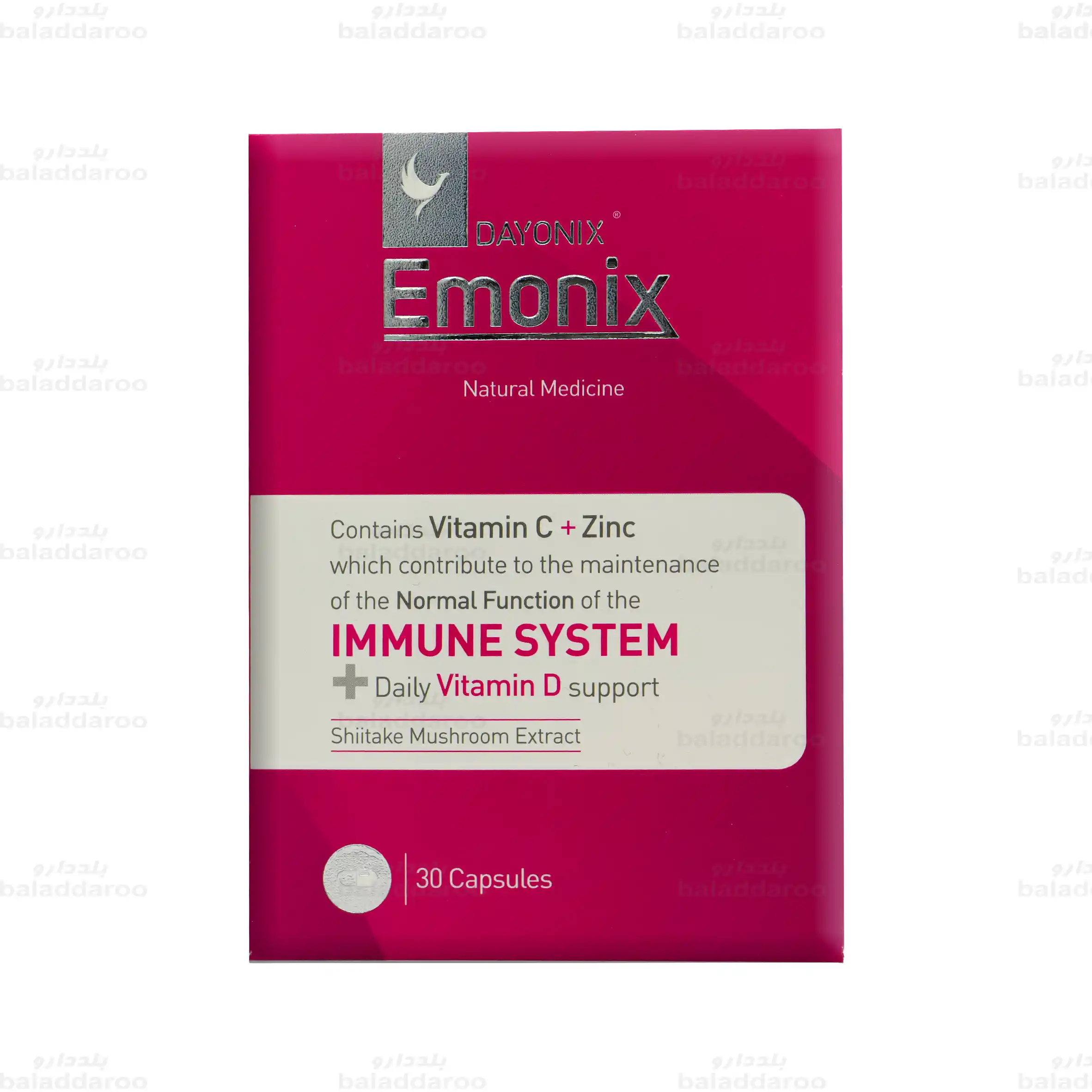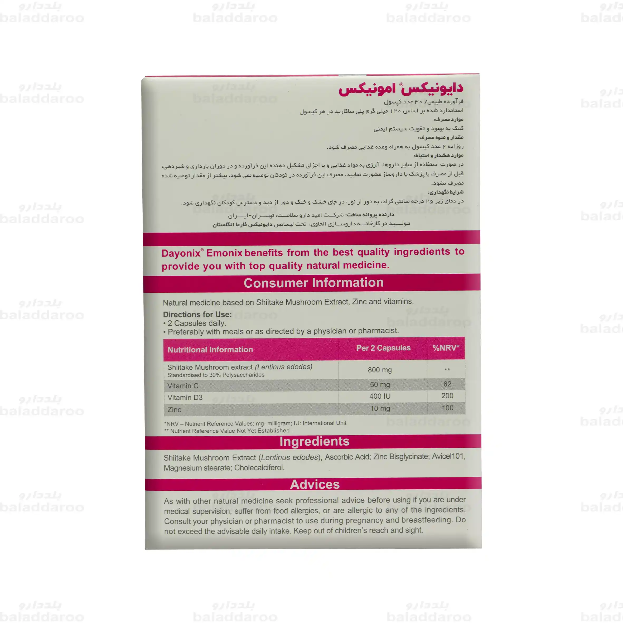 کپسول امونیکس دایونیکس حاوی عصاره قارچ شیتاکه، ویتامین C، D3 و زینک است که به تقویت سیستم ایمنی، کاهش احتمال ابتلا به بیماری های ویروسی و عفونی و کاهش طول مدت بیماری کمک می کند.