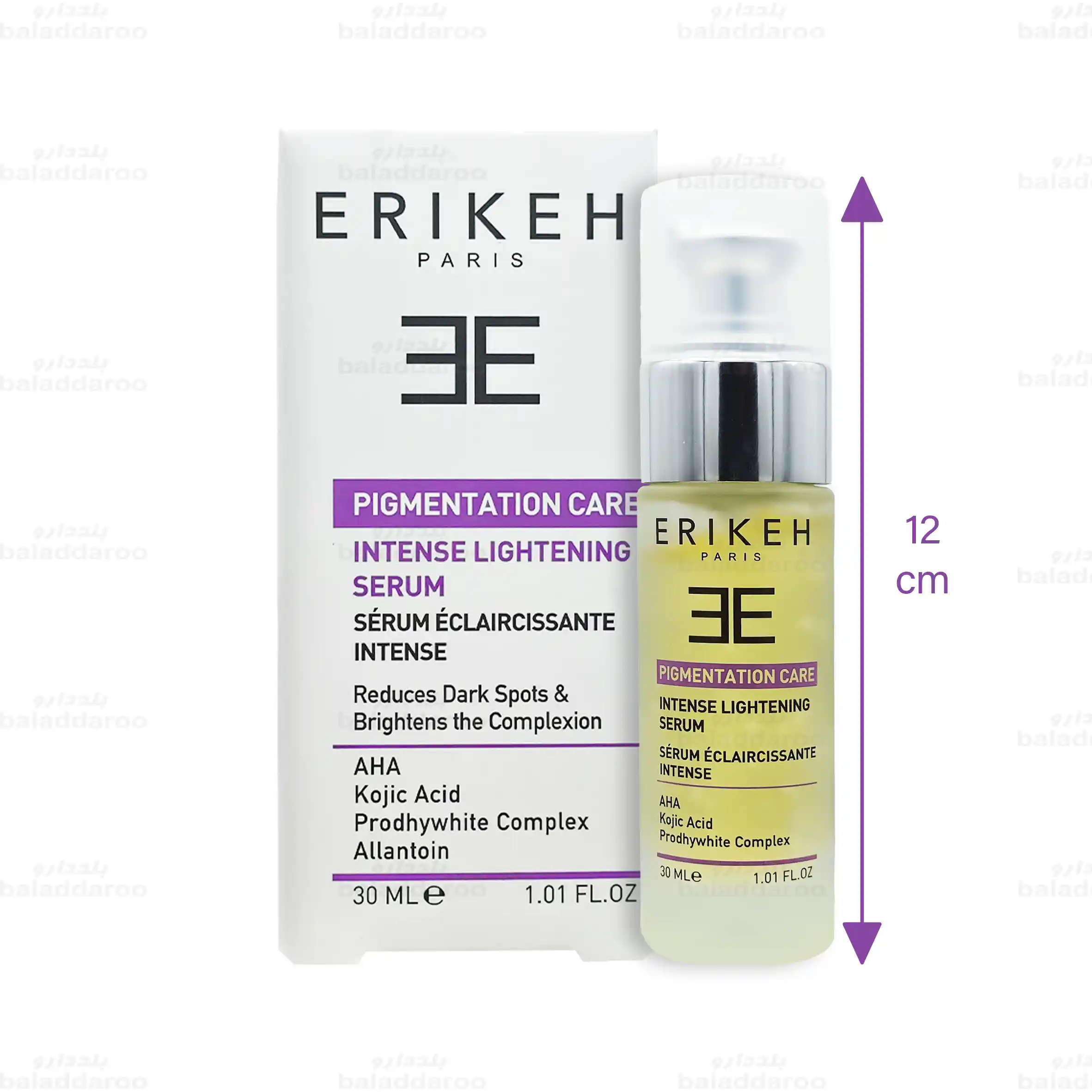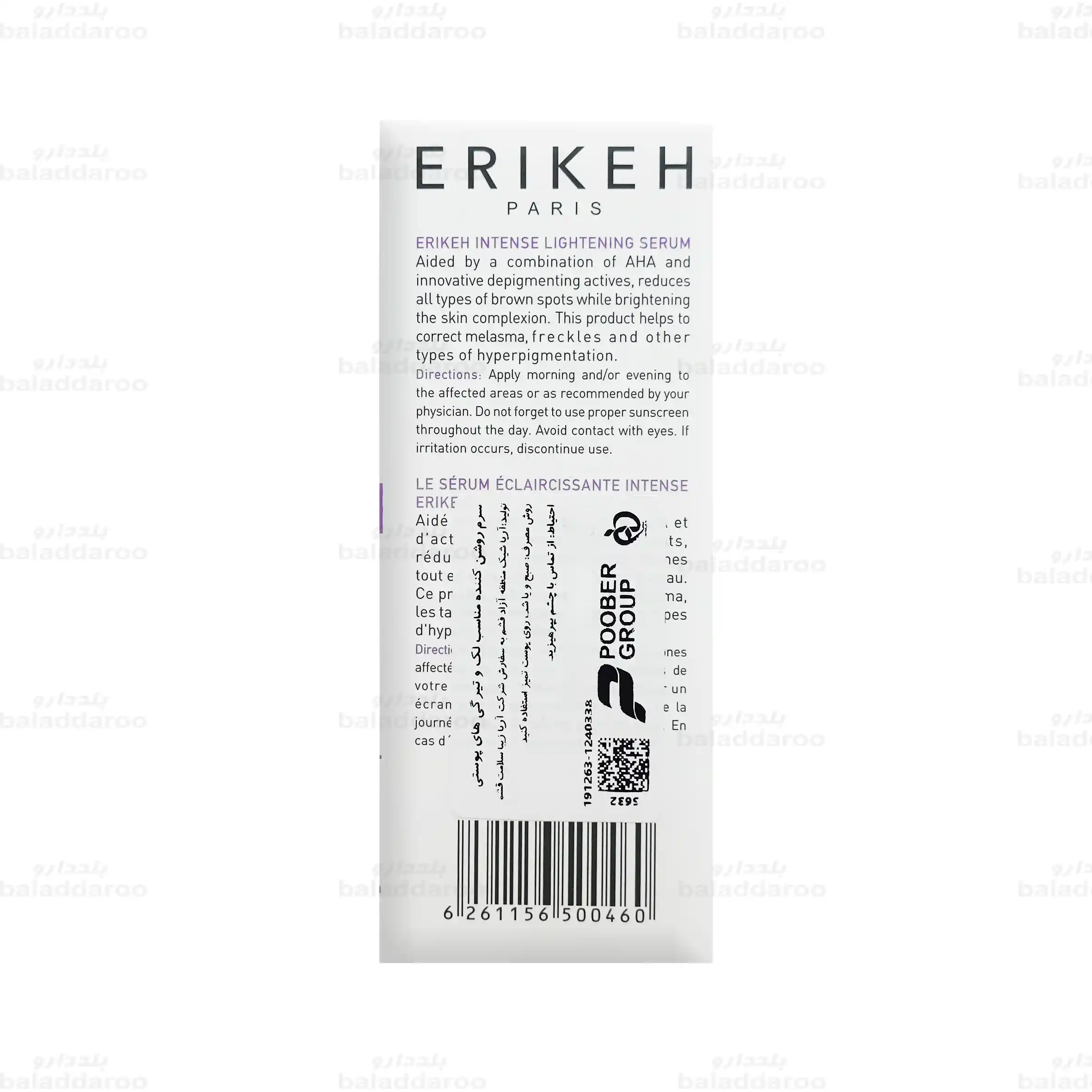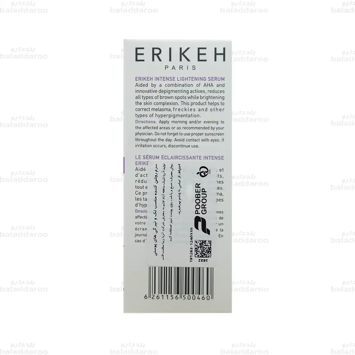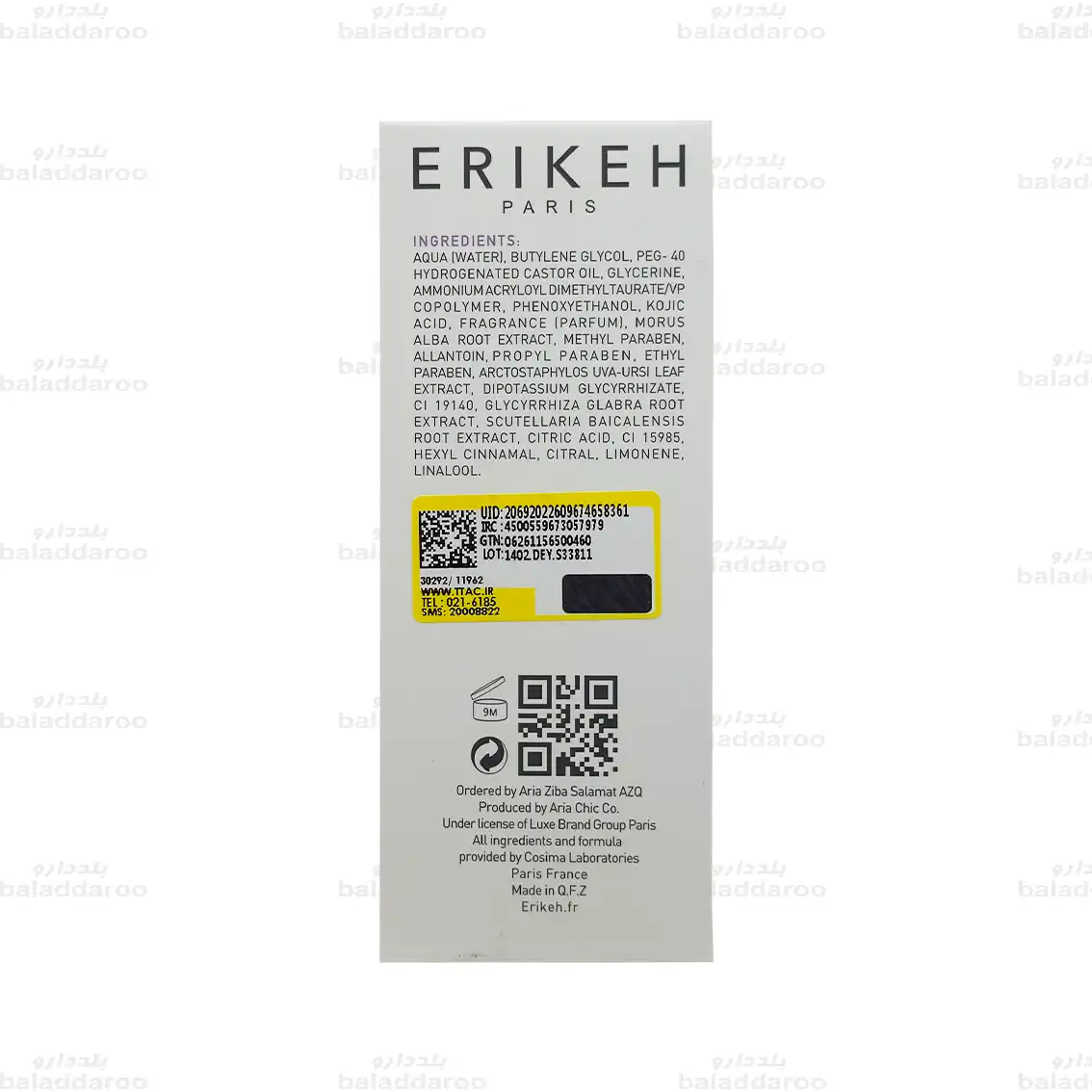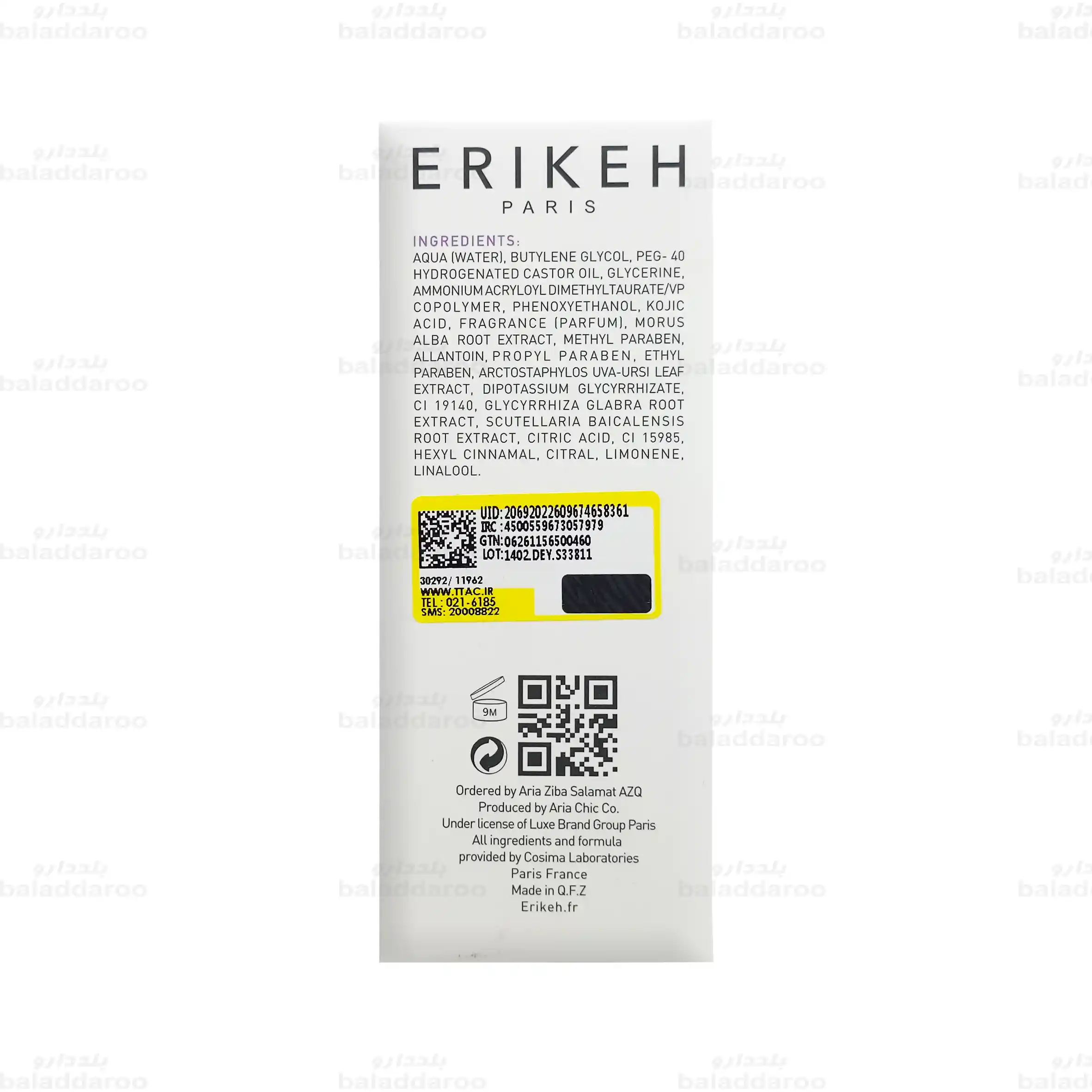 سرم روشن کننده اریکه فرآورده ای ایده آل و تخصصی جهت روشن شدن و رفع لک های سطح پوست می باشد. عصاره ریشه توت سفید، عصاره میوه شاتوت، عصاره شیرین بیان و کوجیک اسید از مواد موثر موجود در این محصول می باشند. تمامی این ترکیبات با مهار آنزیم تیروزیناز و کاهش تولید ملانین در سطح پوست، به روشن شدن و یکدست شدن رنگ آن کمک می کنند. لازم به ذکر است کوجیک اسید علاوه بر موارد ذکر شده از خاصیت ضد چین و چروکی برخوردار می باشد.