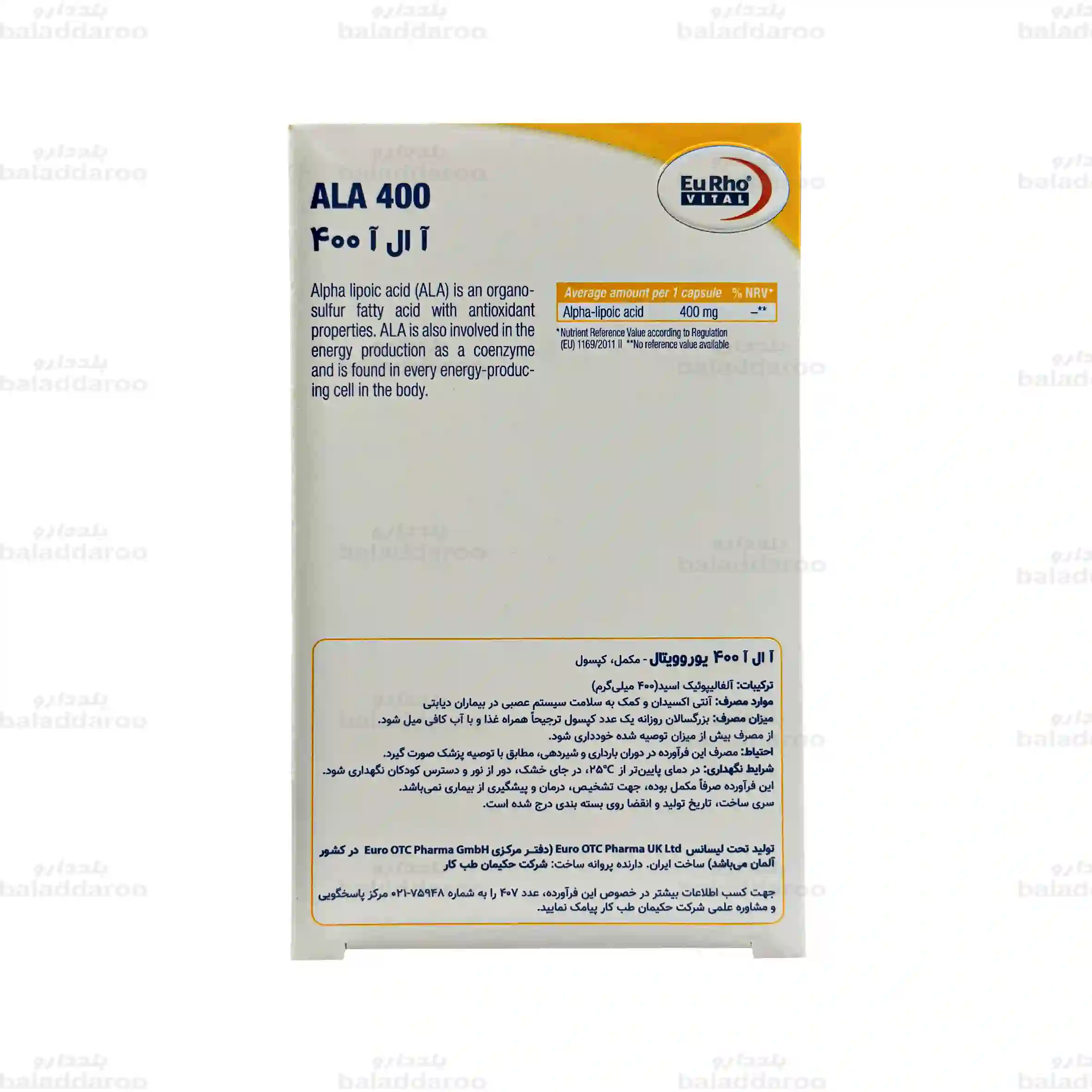 - حاوی ۴۰۰ میلی گرم اسید آلفا لیپوئیک خالص در هر کپسول