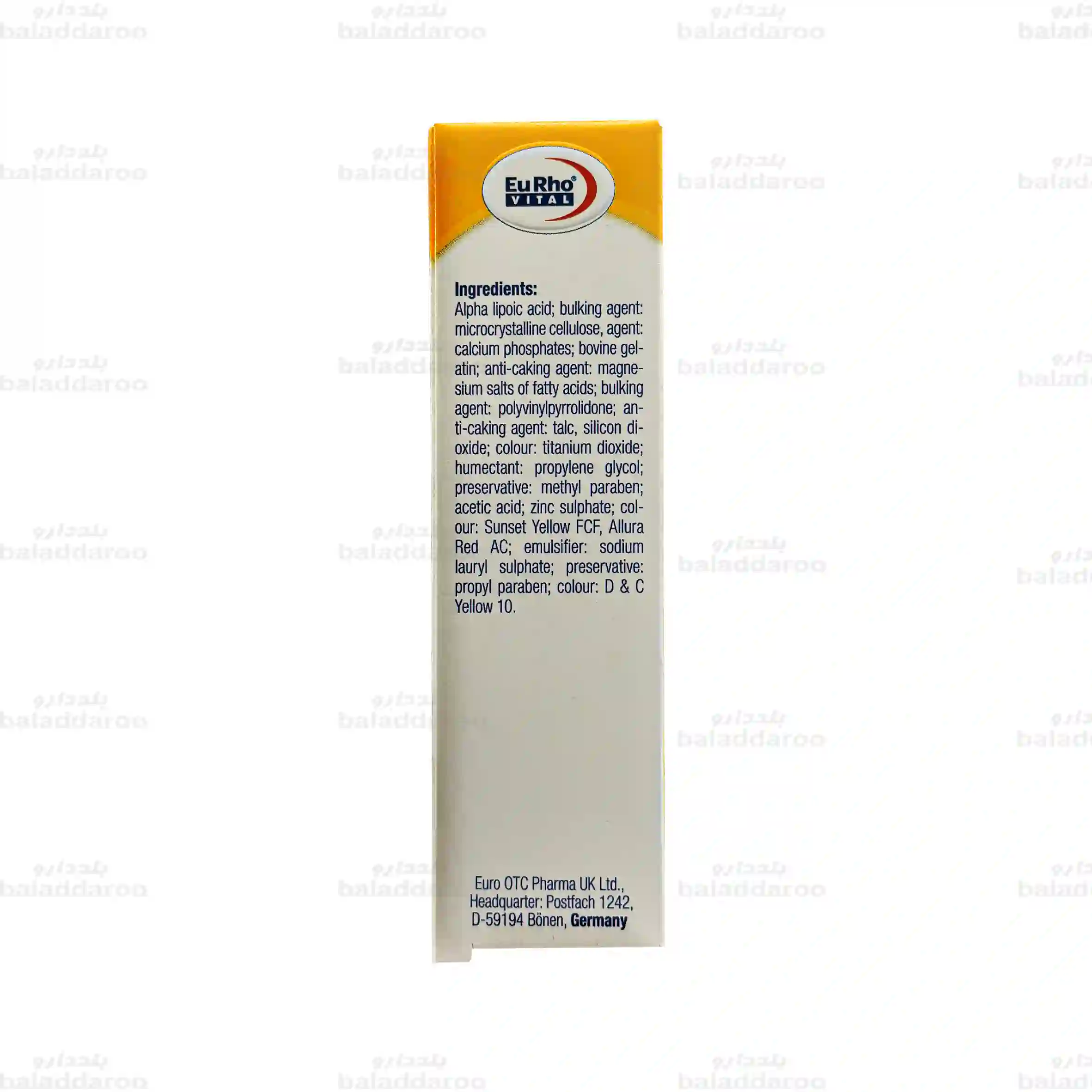 آلفا لیپوئیک اسید؛ عامل حجم دهنده: سلولز میکروکریستالی، عامل: فسفات کلسیم؛ ژل-آتین گاوی؛ عامل ضد کلوخه شدن: نمکهای منیزیم اسیدهای چرب؛ عامل حجم دهنده: پلی وینیل پیرولیدون؛ عامل ضد کلوخه شدن: تالک، دی اکسید سیلیکون؛ رنگ: دی اکسید تیتانیوم؛ مرطوب کننده: پروپیلن گلیکول؛ ماده نگهدارنده: متیل پارابن؛ اسید استیک؛ سولفات روی؛ رنگ: زرد غروب آفتاب FCF، قرمز آلورا AC؛ امولسیفایر: سدیم لوریل سولفات؛ ماده نگهدارنده: پروپیل پارابن؛ رنگ: D & C