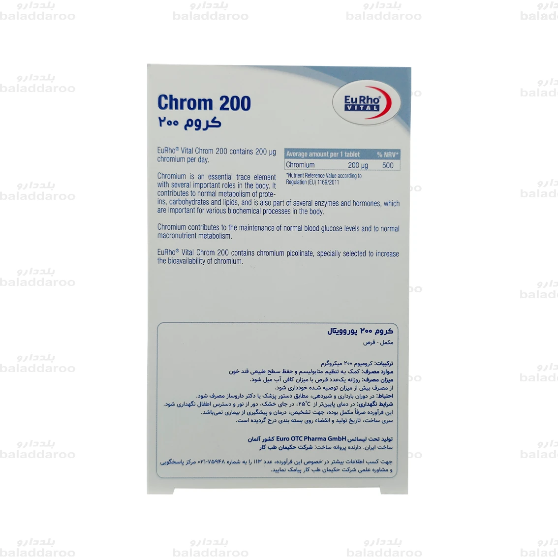 قیمت تمامی محصولات موجود در داروخانه آنلاین بلد دارو از جمله قیمت قرص کروم 200 یوروویتال طبق فاکتورهای رسمی شرکت پخش و تحت نظارت سازمان غذا و دارو تعیین می گردد.