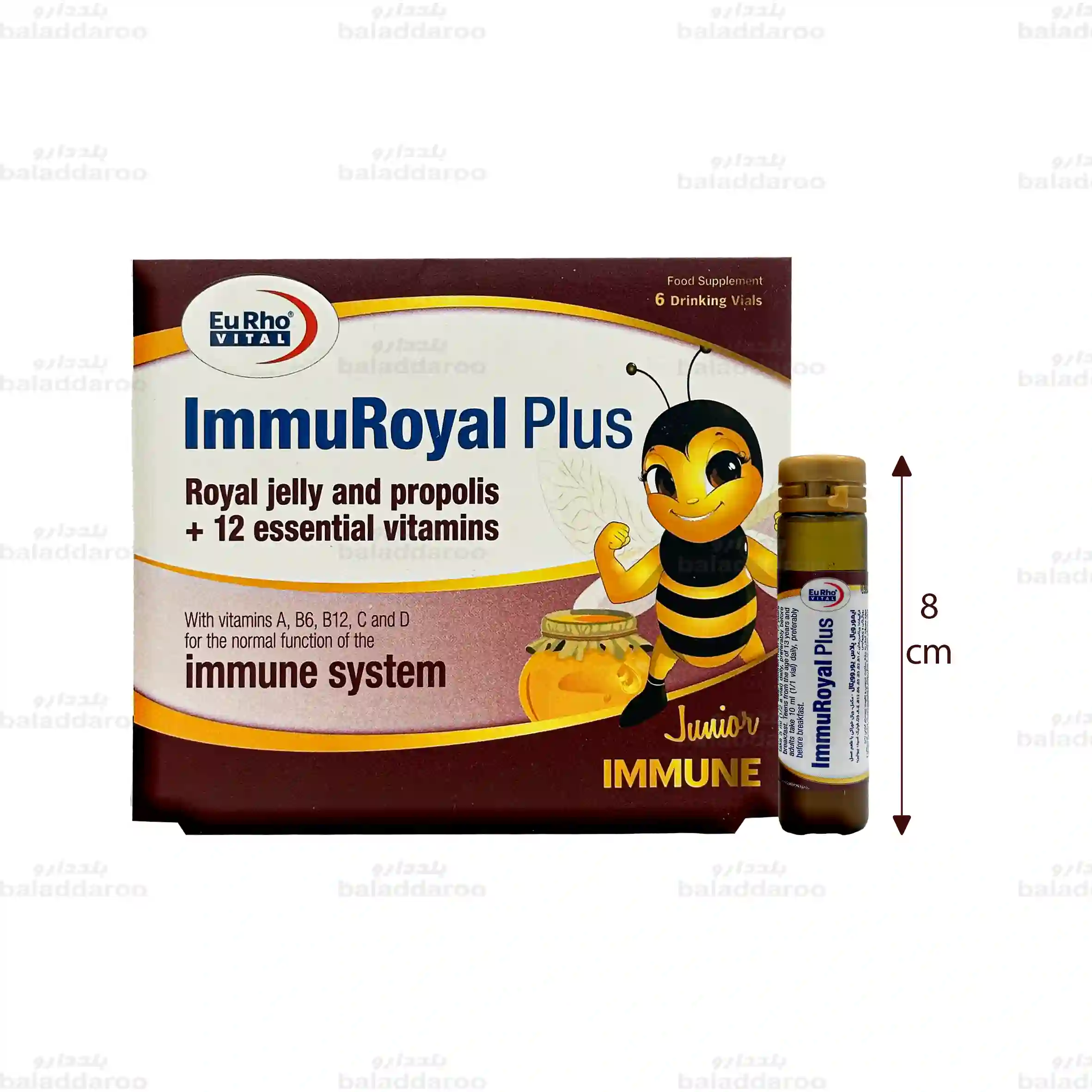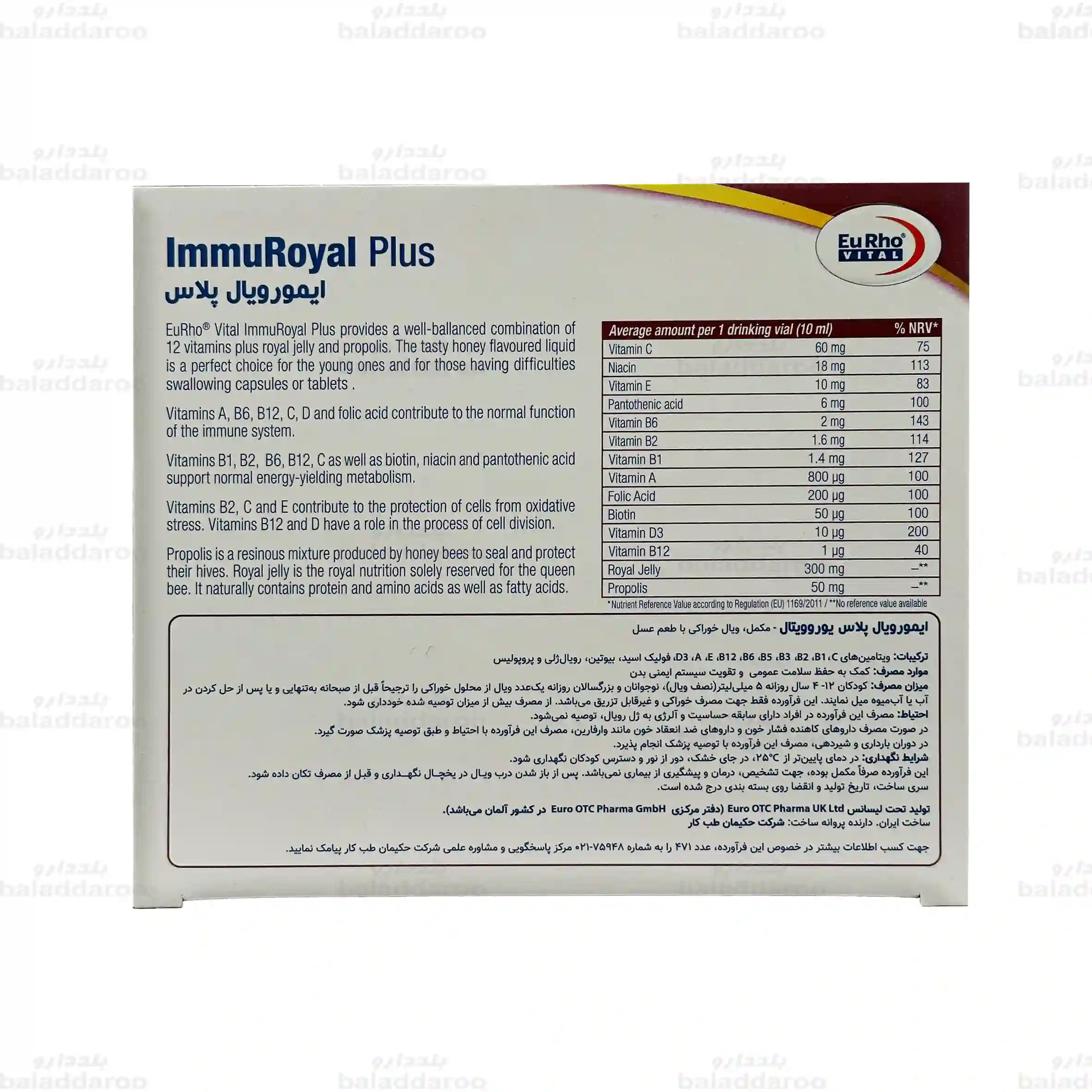 هر ویال ایمو رویال پلاس یوروویتال حاوی ۳۰۰ میلی‌ گرم ژل رویال و ۵۰ میلی‌ گرم پروپولیس است که هر دو دارای خواص آنتی ‌اکسیدانی و ضد التهابی بوده و در بهبود عملکرد سیستم ایمنی نقش موثری دارند و هر بسته از آن شامل شش عدد ویال خوراکی ۱۰ میلی ‌لیتری است. همچنین طعم دلپذیر عسل در فرمولاسیون این ویال باعث پذیرش بهتر آن به ‌ویژه در کودکان شده و تجربه‌ ای خوشایند از مصرف مکمل را فراهم می‌ کند. ایمورویال فاقد مواد نگهدارنده و رنگ مصنوعی بوده و با استفاده از عصاره‌ های خالص و استاندارد تهیه شده است.
