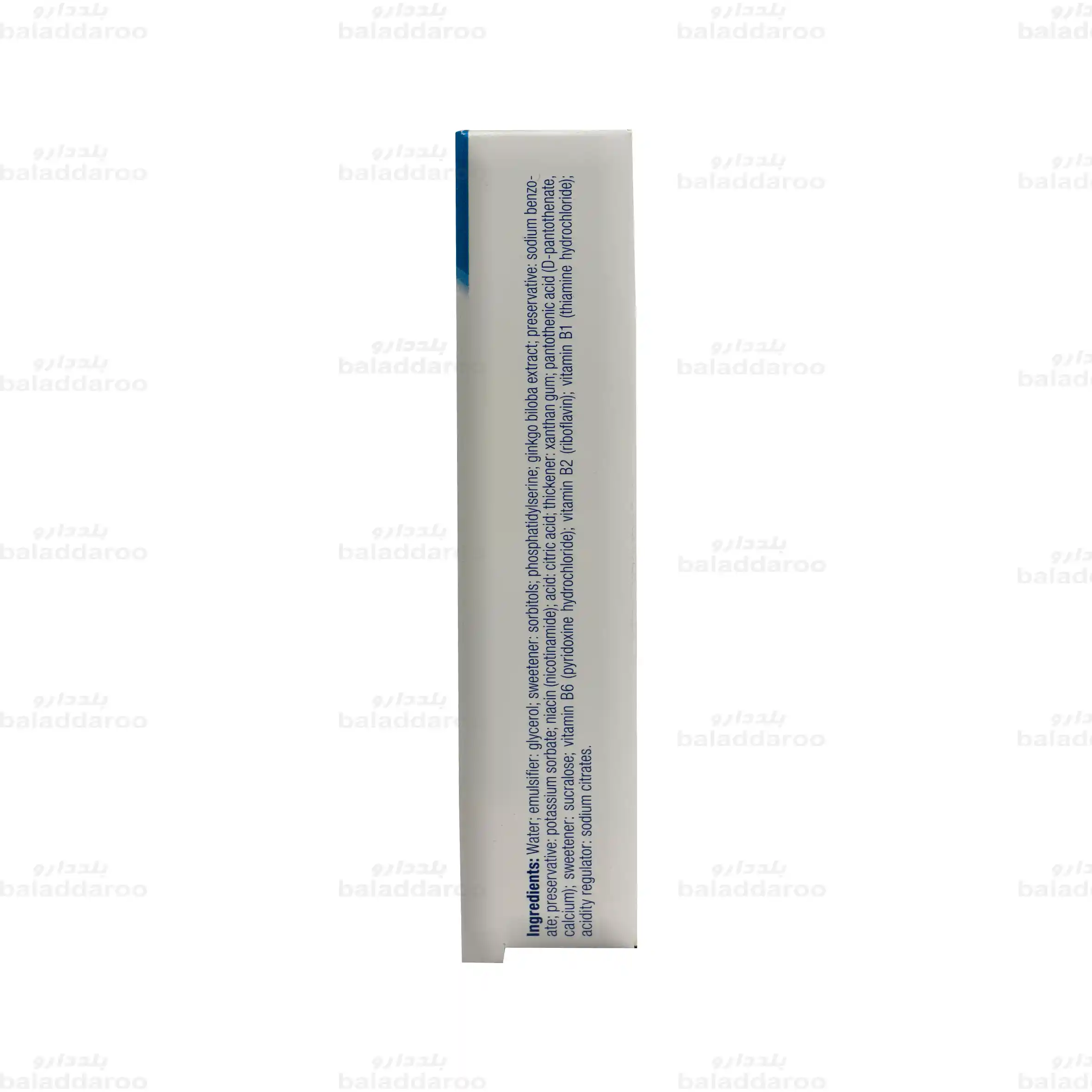 آب، گلیسرول، سوربیتول، فسفاتیدیل سرین، عصاره جینکوبیلوبا، سدیم بنزوات، پتاسیم سوربات، نیاسین، اسید سیتریک، صمغ زانتان، اسید پانتوتنیک( دی-پانتوتنات کلسیم)، سوکرالوز، ویتامین B6، ویتامین B2، ویتامین B1، سدیم سیترات