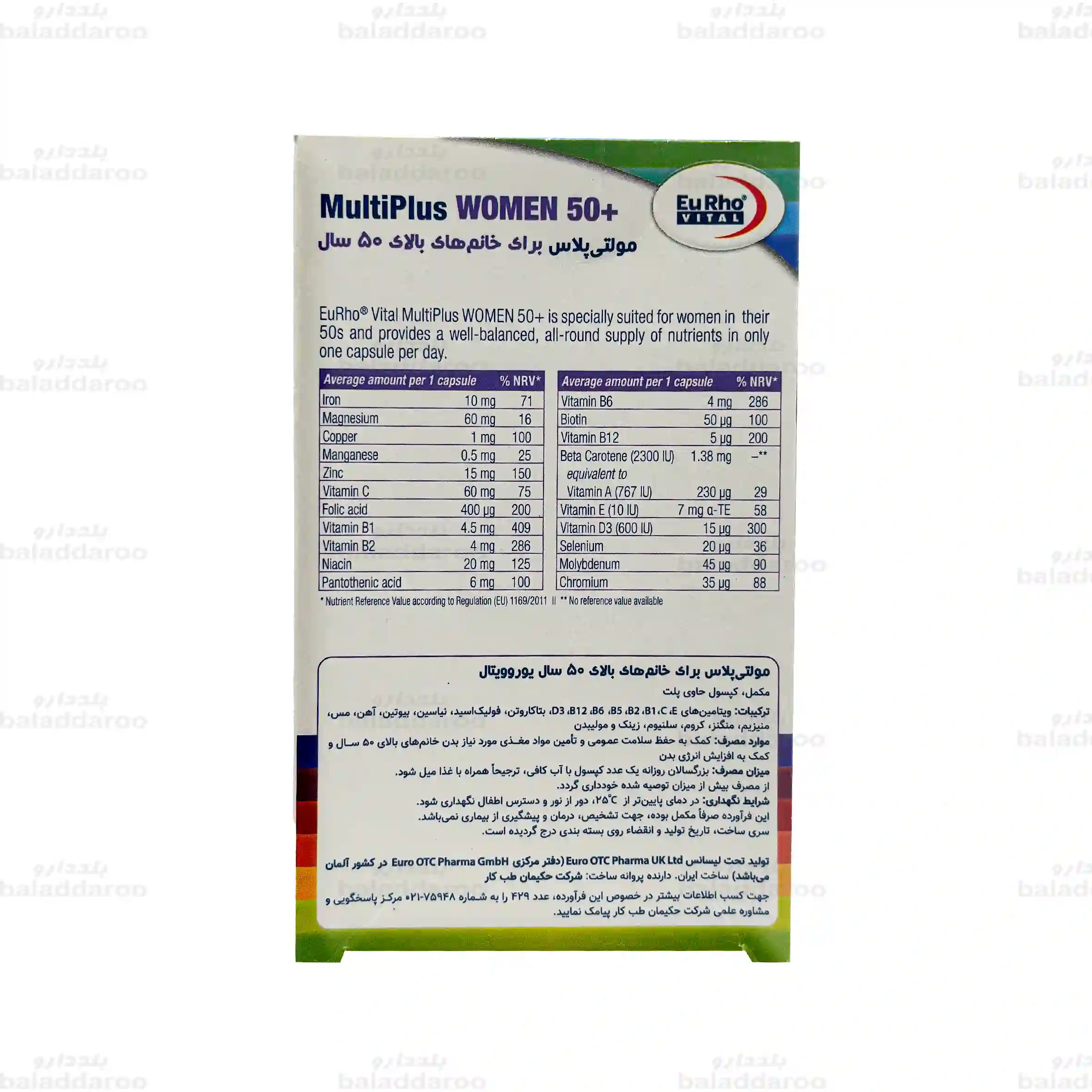 قیمت مولتی پلاس خانم های بالای 50 سال یوروویتال در بلد دارو بر اساس فاکتور رسمی شرکت های پخش تحت نظارت سازمان غذا و دارو تعیین شده است. شما می توانید با اطمینان خاطر این محصول را با قیمت رسمی از بلد دارو خریداری نمائید.