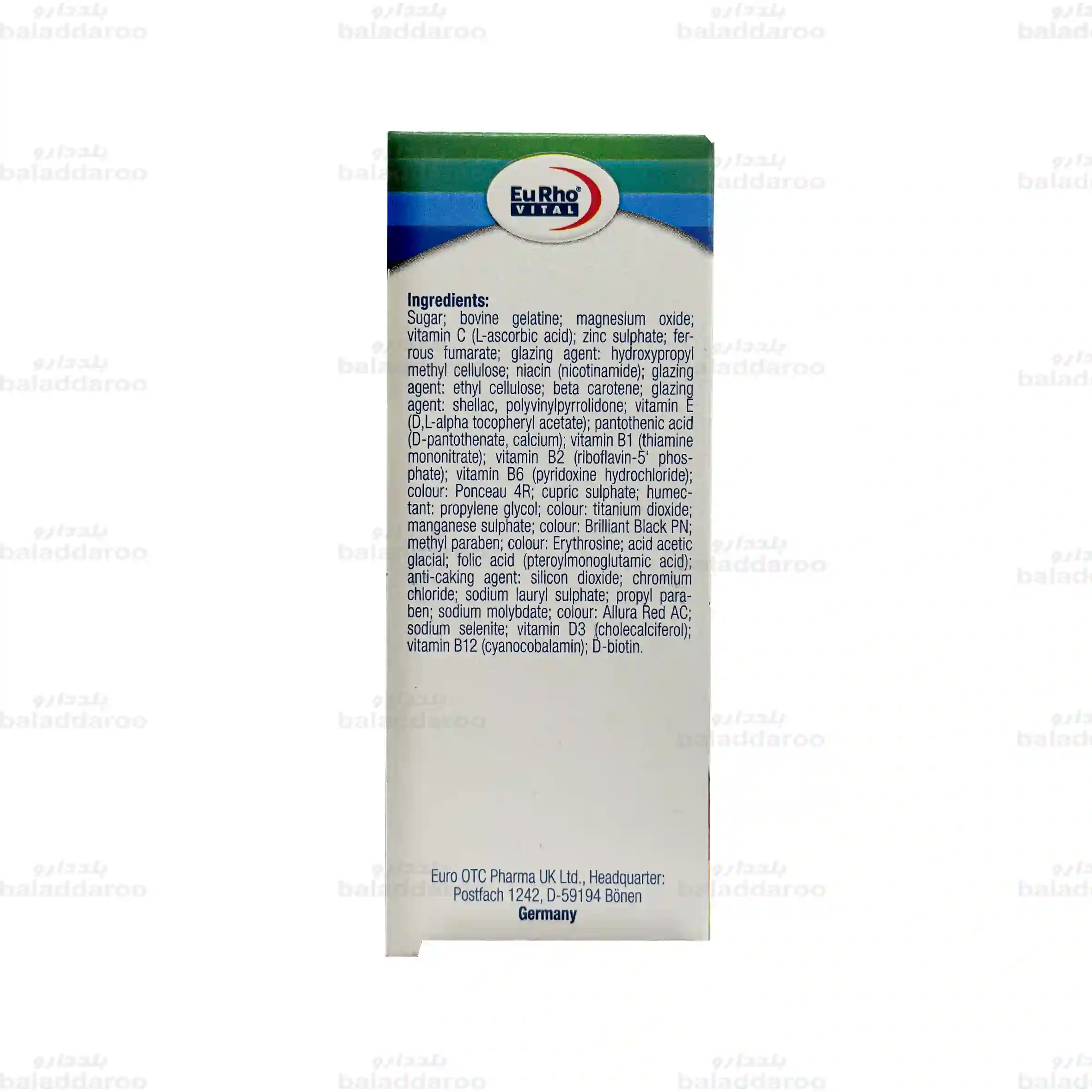 شكر، ژلاتين كاوى، منيزيم اكسايد، ويتامين C، زينك سولفات، فروس سولفات، هيدروكسى پروپيل متيل سلولز، ويتامين E، نياسين (نيكوتيناميد)، شلاك، پلى وينيل پيروليدون، پانتوتنيك اسيد، بتا كاروتن، سولفات مس، رنك پونسيو 4R، ويتامين B6، پروپيلن گليكول، ويتامين B2 (ريبوفلاوين)، تيتانيوم دى اكسايد، ويتامين B1، منگنز سولفات، رنگ برليانت مشكى PN، متیل پارابن، اريتروزين، استيك اسيد، فوليك اسيد، سيليكون دى اكسايد، پتاسيم يديد، كروميوم كلرايد، سديم لوريل سولفات، پروپيل پارابن، سديم موليبدات، آلورا رد AC، سديم سلنيت، دى-بيوتين، ويتامين D، ویتامین B12