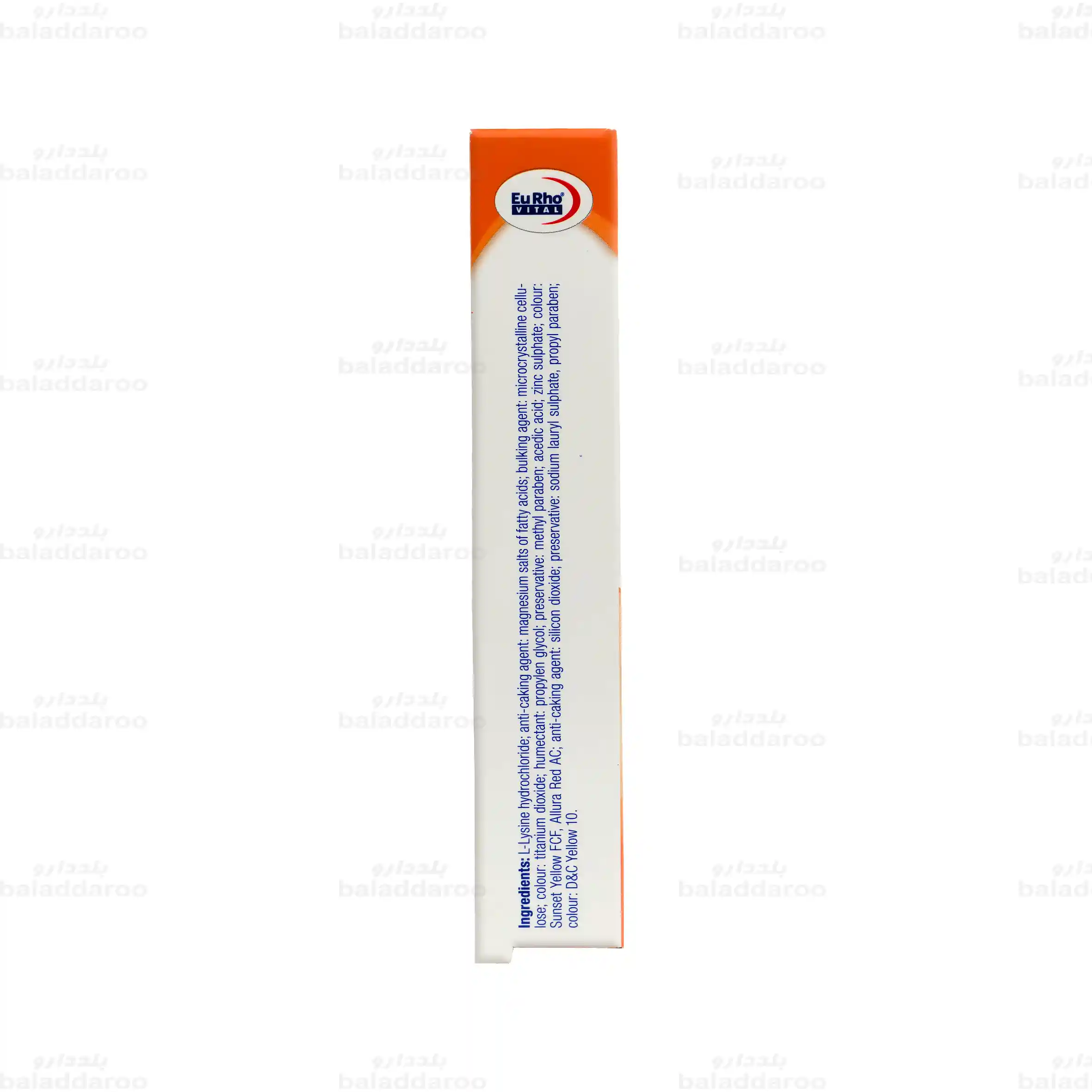 نمک های اسید چرب، منیزیم، میکروکریستالین سلولز، تیتانیوم دی اکساید، پروپیلن گلیکول، متیل پارابن، استیک اسید، زینک سولفات، رنگ سان ست یلو FCF، آلورا رد AC، سیلیکون دی اکساید، سدیم لوریل سولفات، پروپیل پارابن، رنگ زرد (D & C)