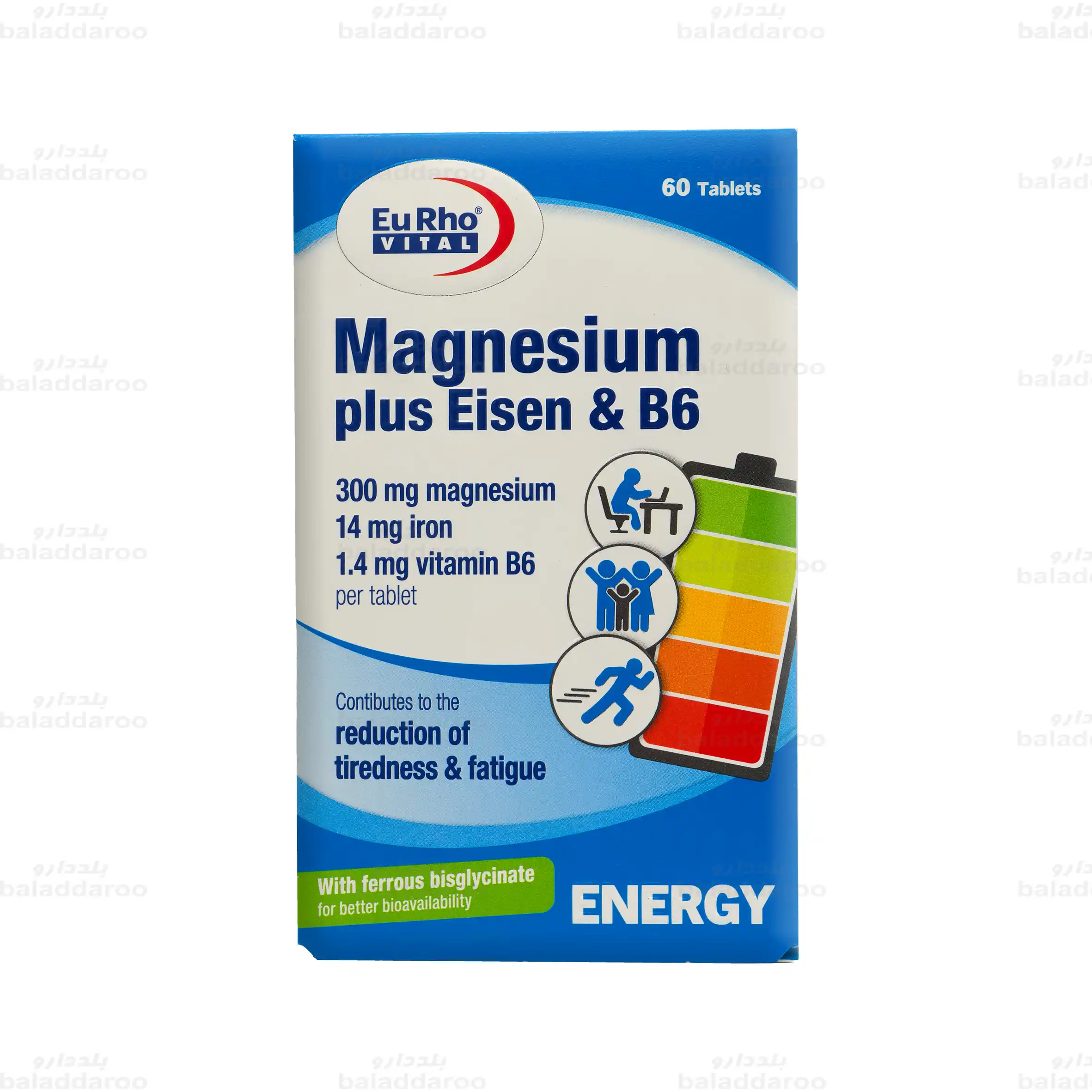 قرص منیزیم پلاس آیزن و ب6 یوروویتال حاوی منیزیم اکساید، آهن بیس گلایسینات و ویتامین ب6 است که به کاهش احساس خستگی و ضعف و افزایش انرژی کمک می کند.