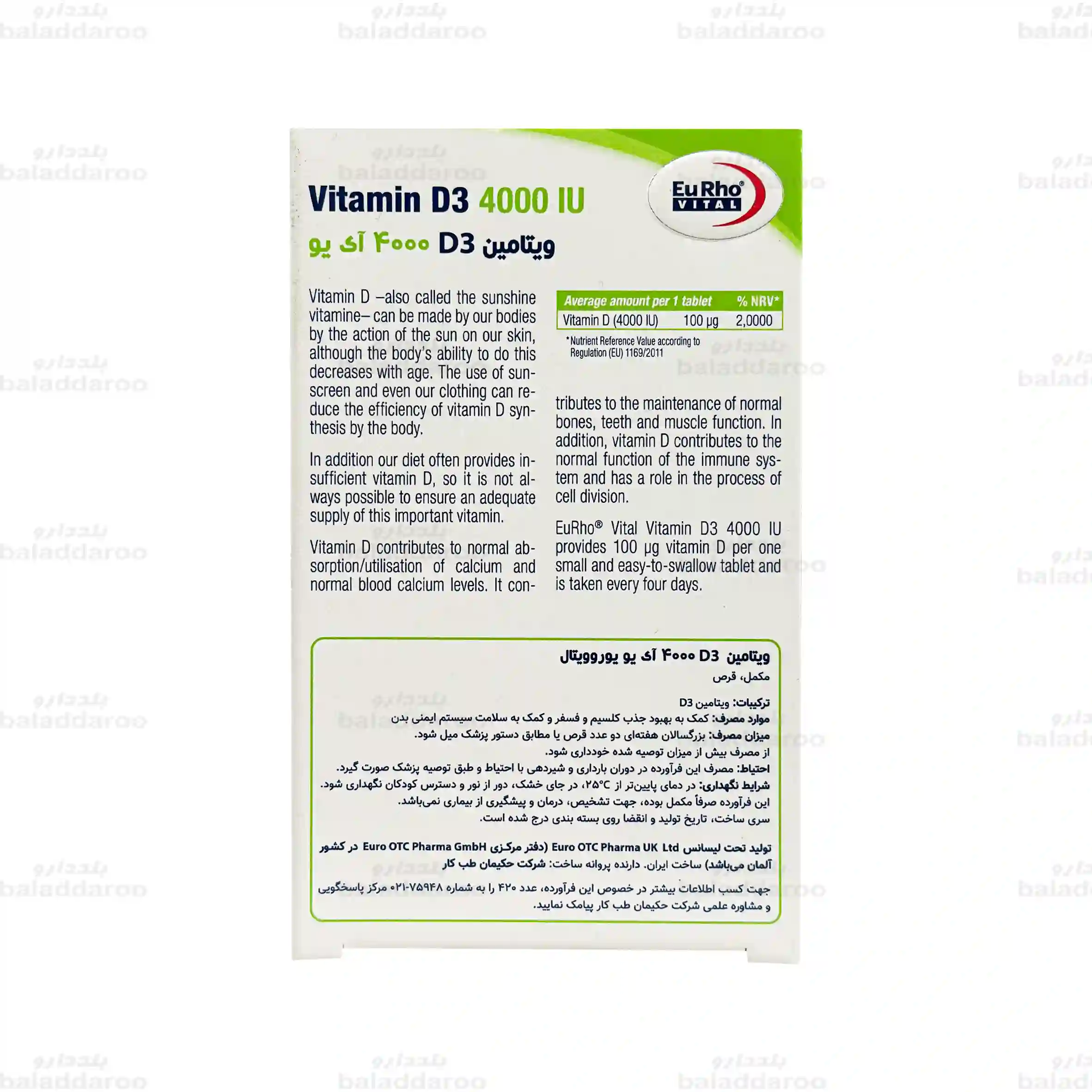 این مکمل در مکالمات رایج با نام قرص ویتامین d3 4000 واحد یوروویتال نیز گفته می شود؛ بنابراین در ادامه متن از هر دو شکل نگارشی برای سهولت خوانش استفاده خواهد شد.