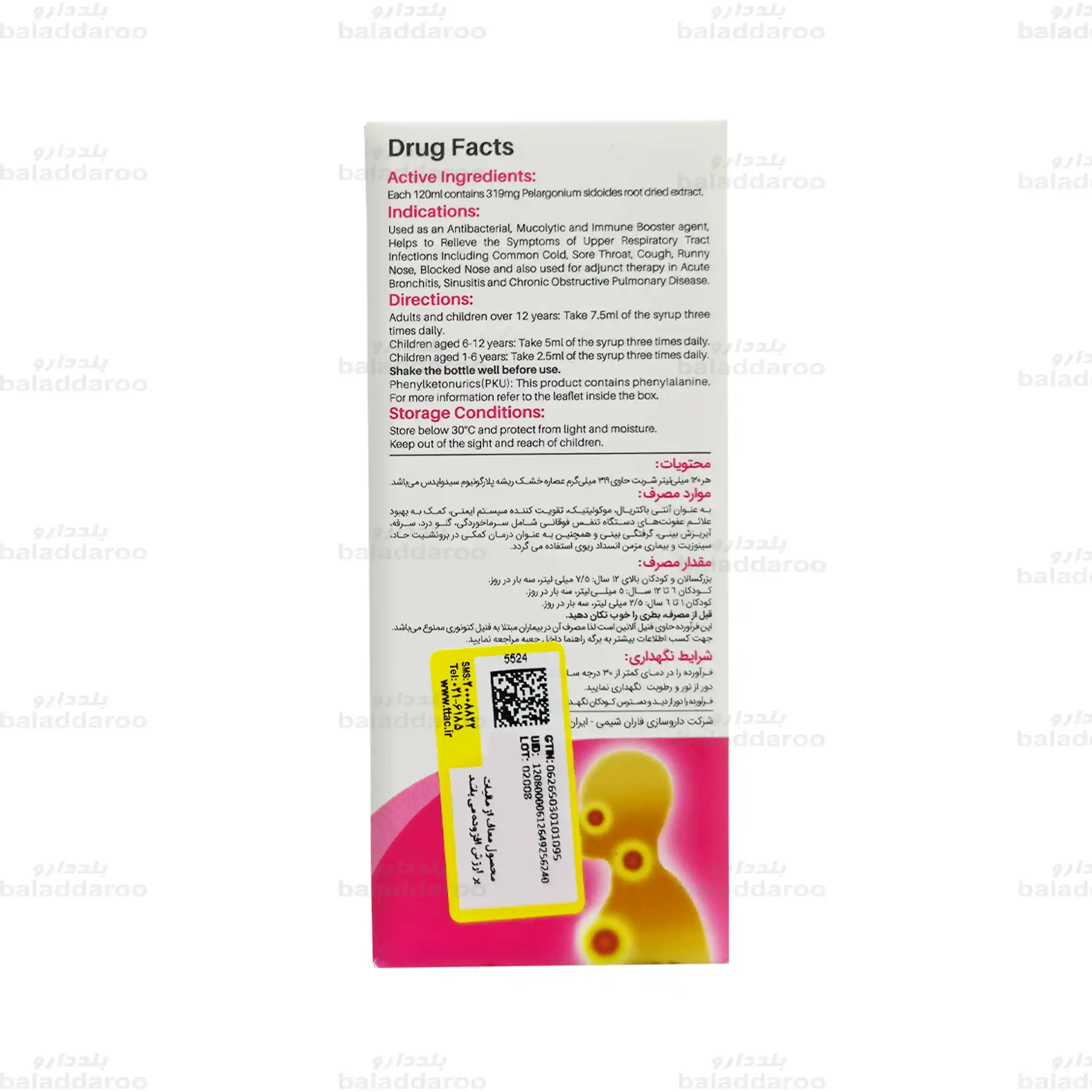 یکی از بیماری های شایع که بسیاری را در طول سال درگیر می کند، سرماخوردگی است. از بارزترین علائم آن گلودرد، سرفه، عطسه، آبریزش و یا گرفتگی بینی می باشد که می توان برای کنترل این موارد و تسریع روند درمان این بیماری از این فرآورده استفاده نمود. این محصول حاوی 319 میلی گرم عصاره خشک ریشه پلارگونیوم سیدوایس است و به بهبود سرماخوردگی، گلودرد، سرفه، آبریزش و گرفتگی بینی کمک می کند. این شربت ضد سرفه به عنوان یک مکمل کمک درمانی در برونشیت حاد، سینوزیت و بیماری های مزمن انسداد ریوی نیز مورد استفاده قرار می گیرد و همچنین با تقویت سیستم ایمنی، از ابتلا دوباره به سرماخوردگی جلوگیری می کند.