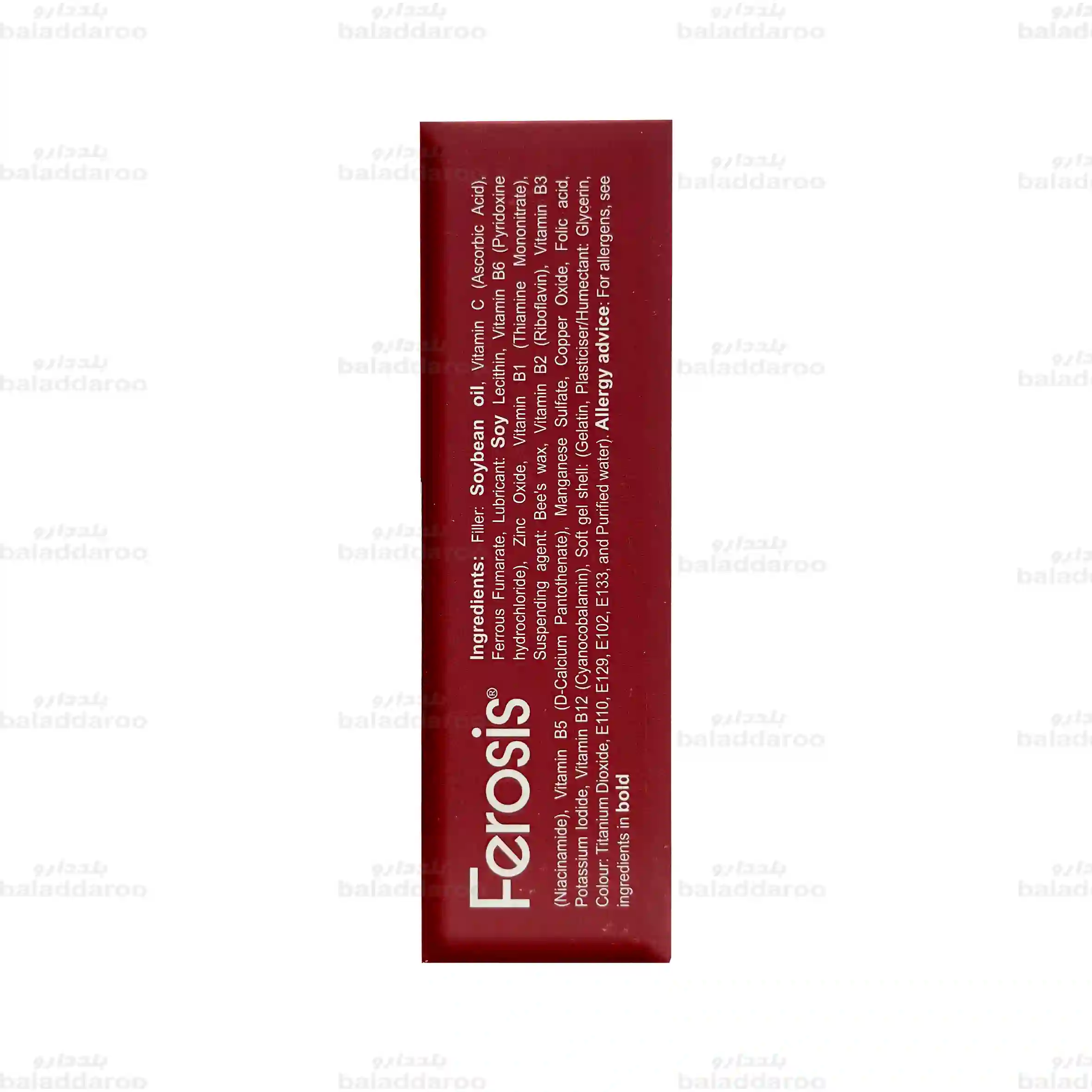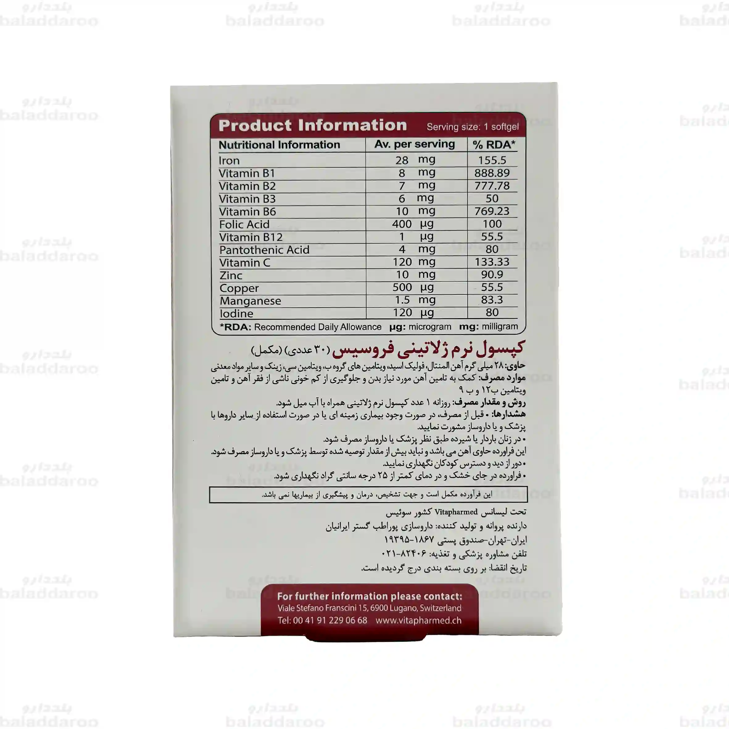 این مکمل حاوی 28 میلی گرم آهن المنتال، فولیک اسید، ویتامین های گروه ب، ویتامین ث، زینک و برخی مواد معدنی دیگر است که در جبران کمبودهای تغذیه ای و جلوگیری از ابتلا به کم خونی ناشی از فقر آهن نقش اساسی ایفا می کند. برای خرید کپسول فروسیس می توانید به سایت داروخانه آنلاین بلد دارو مراجعه نمایید و پس از کسب اطلاعات محصول و اطلاع از تاریخ انقضا آن، سفارش خود را ثبت نمایید. تمامی سفارشات در کوتاه ترین زمان ممکن و با بسته بندی مناسب به دست شما می رسد.