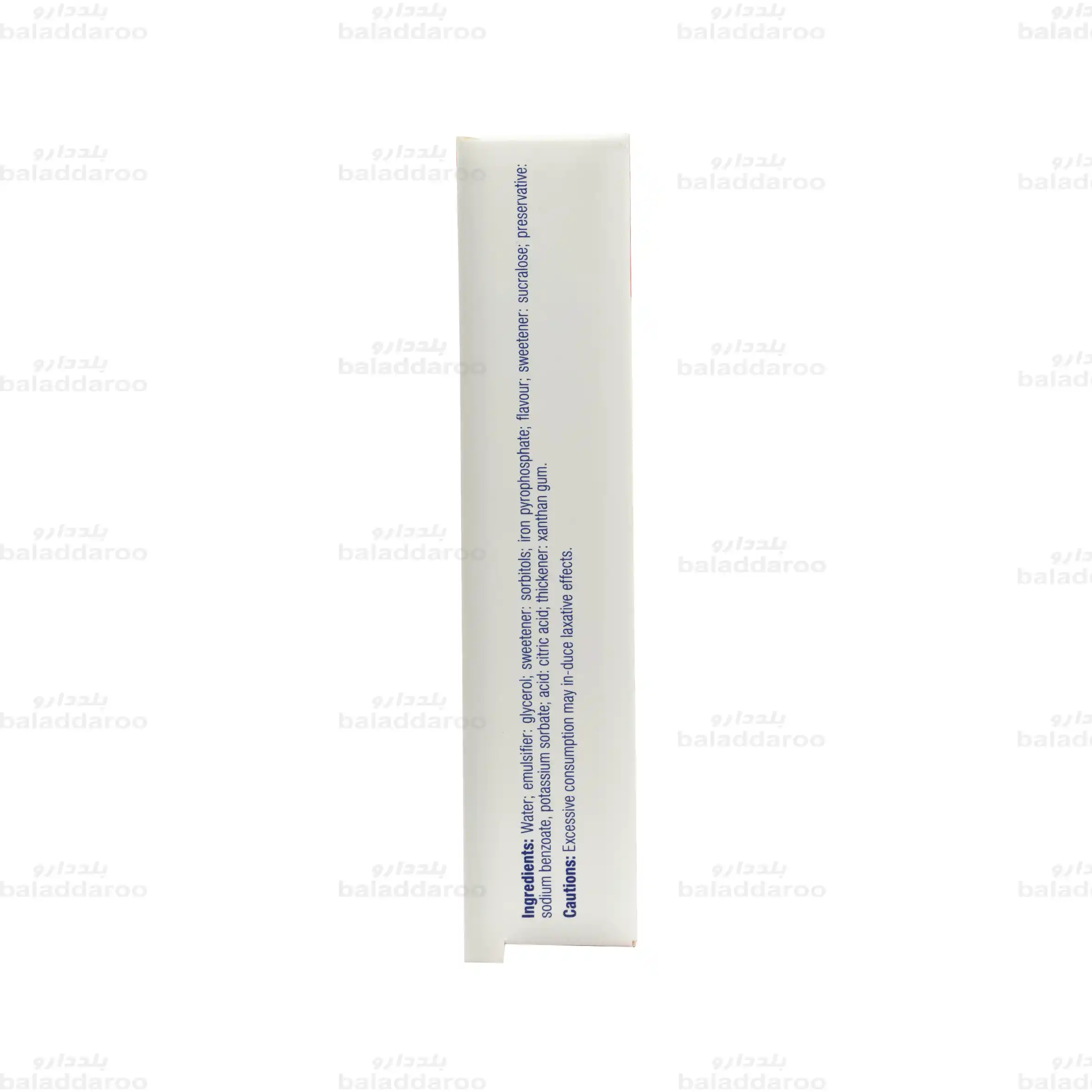 آب، امولسیفایر، گلیسرول؛ شیرینکننده، سوربیتول، پیروفسفات آهن، طعمدهنده، شیرینکننده، سوکرالوز، نگهدارنده، بنزوات سدیم، سوربات پتاسیم، اسید سیتریک، غلیظ کننده، صمغ زانتان