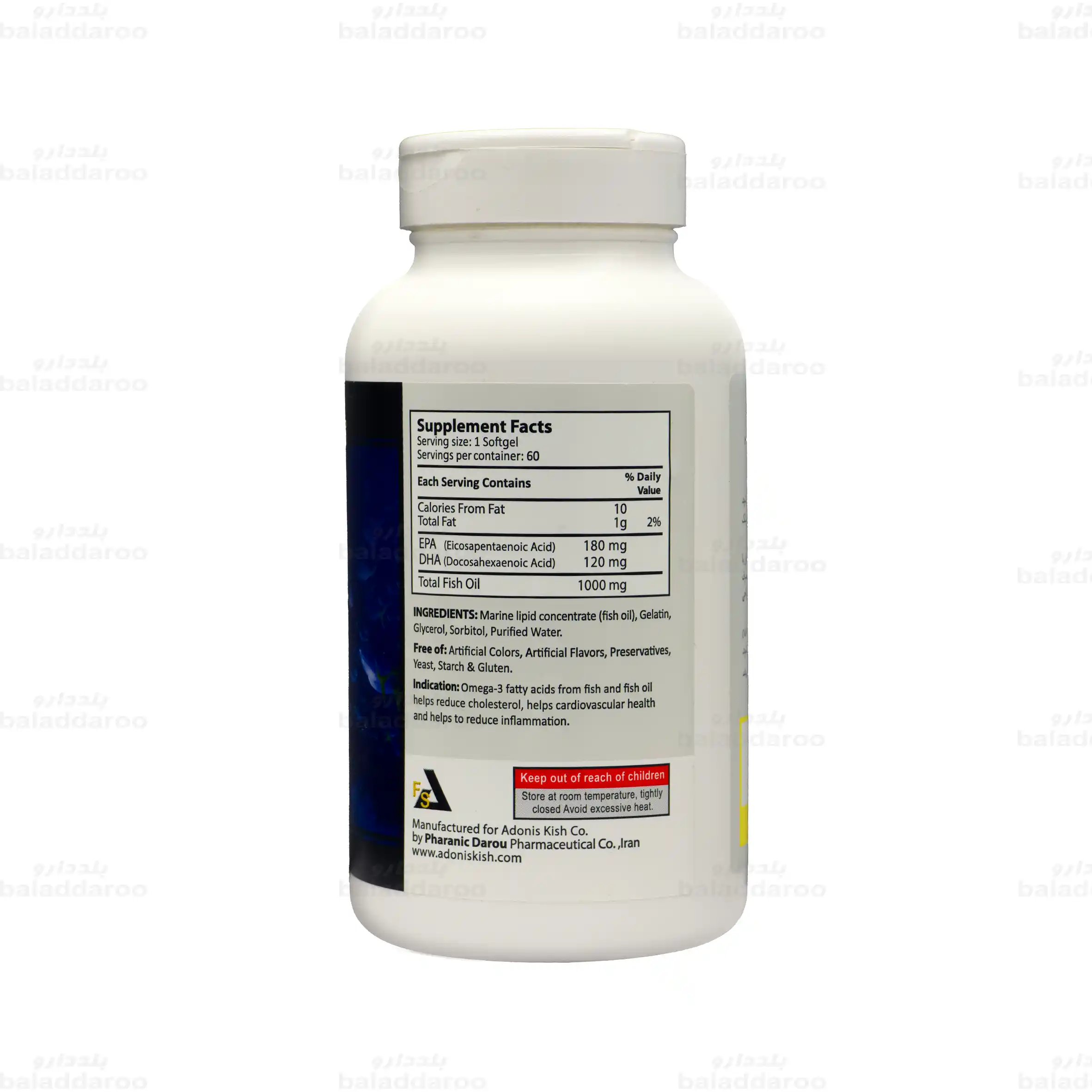 امگا 3 نوعی اسید چرب مفید است که در بدن تولید نمی شود و با مصرف مکمل های حاوی امگا 3 بدون جیوه و مواد غذایی حاوی این ماده می توان آن را تامین کرد. امگا 3 حاوی اسیدهای چرب EPA و DHA است. مصرف این ماده مغذی علاوه بر حفظ سلامت قلب و عروق، به کنترل علائم PMS (دوران پیش از قاعدگی) و کاهش کلسترول خون کمک می کند. این مکمل بدون جیوه است و توسط شرکت آدونیس کیش تولید شده است. هر 1000 میلی گرم امگا 3 حاوی 180 میلی گرم EPA و 120 میلی گرم DHA است که در عملکرد قلب، رگ های خونی، ریه و سیستم ایمنی نقش دارد.