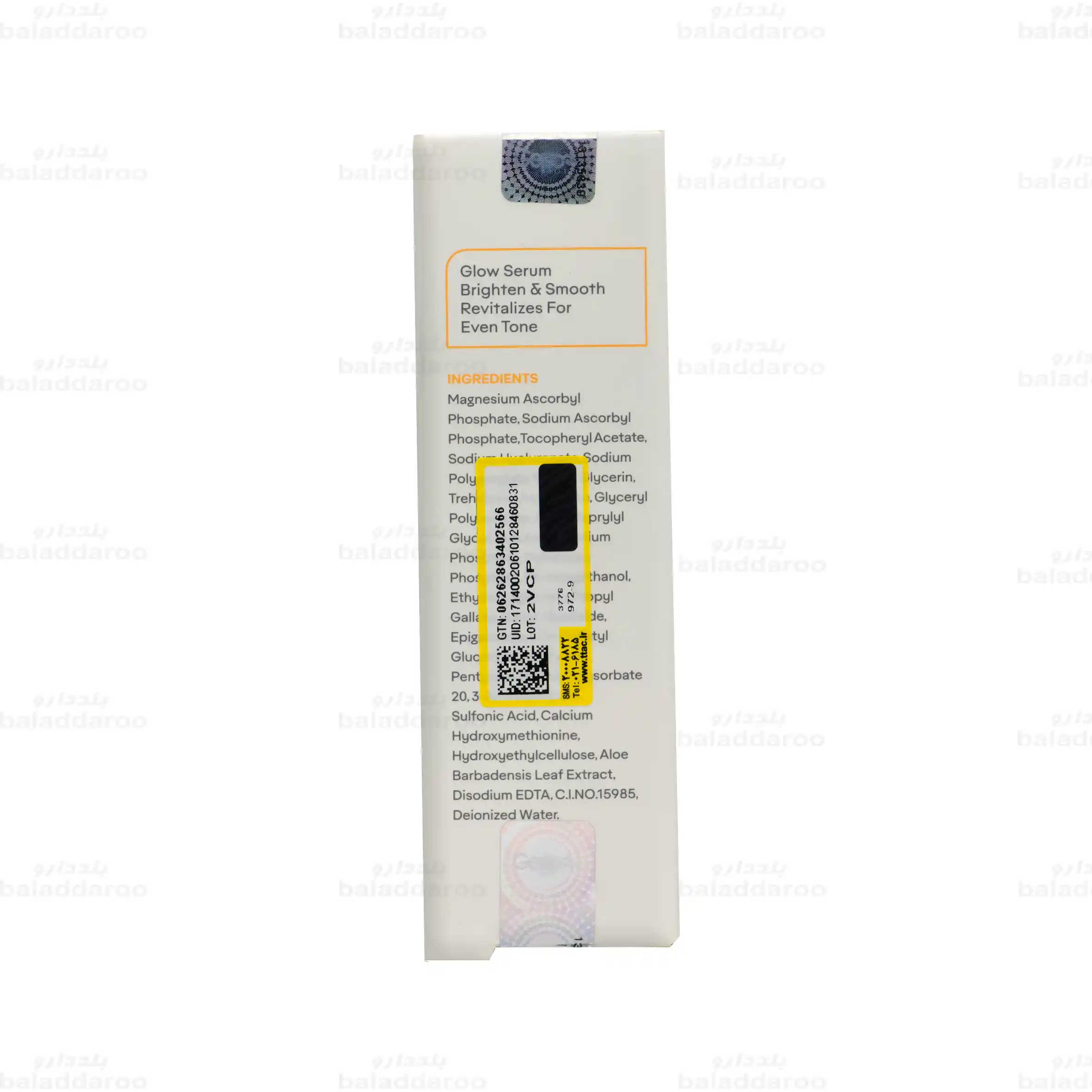 منیزیم آسکوربیل فسفات، سدیم آسکوربیل فسفات، توکوفریل استات، سدیم هیالورونات، نشاسته سدیم پلی آکریلات، گلیسیرین، ترهالوز، اوره سرین، گلیسریل پلی آکریلات، آلژین، کاپریلیل گلایکول، پولولان، دی سدیم فسفات، پتاسیم فسفات، فنوکسی اتانول، اتیل هگزیل گلیسیرین، پروپیل گالات، گالیل گلوکوزاید، اپی گالوکاتچین گالاتیل گلوکوزاید، پانتنول، پنتلینگلایکول، پلی سوربات 20، 3- آمینوپروپان سولفونیک اسید، کلسیم هیدروکسی متیونین، هیدروکسی اتیل سلولز، عصاره آلوئه ورا، دی سدیم ا.د.ت.ا، رنگ کد 15985، آب دیونیزه