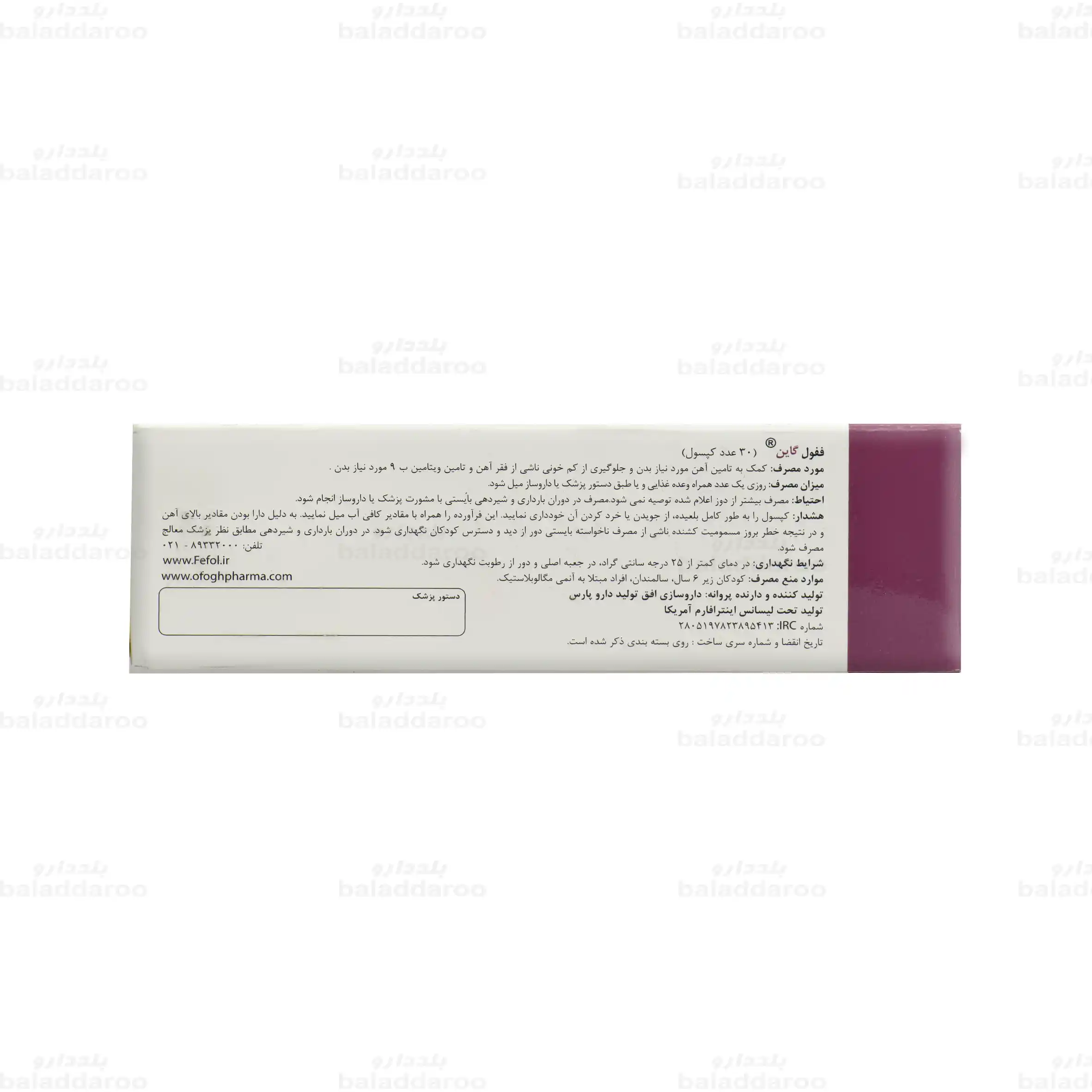 ففول گاین، محصول شرکت اینترافارم تحت لیسانس آمریکا، یک مکمل غذایی و دارویی است که برای پیشگیری و درمان کم خونی ناشی از فقر آهن و کمبود ویتامین B9 فولات یا اسید فولیک طراحی شده است. این مکمل شامل 80 میلی گرم آهن به فرم بیس گلیسینات، ویتامین های B6 و B12، فولیک اسید و ویتامین C است که به جذب بهتر آهن و تقویت تولید گلبول های قرمز خون کمک می کنند.