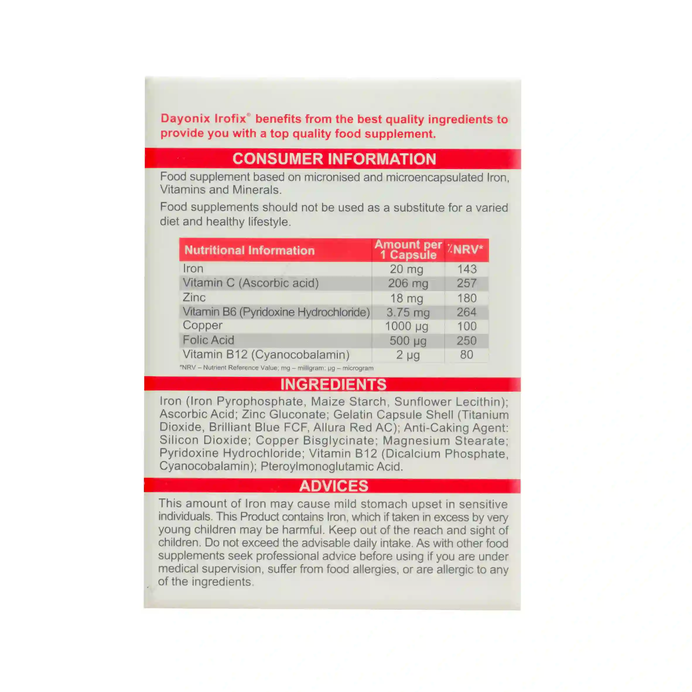 • دوز آهن موجود در این محصول در افراد حساس ممکن است باعث درد شکمی شود.