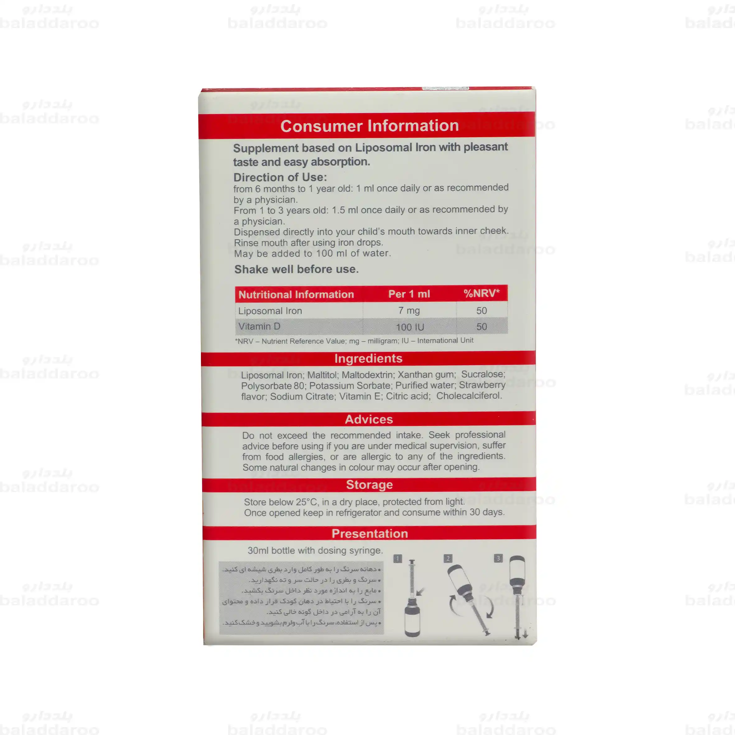 - حاوی 7 میلی گرم آهن پیروفسفات لیپوزومال و 100 IU ویتامین د3