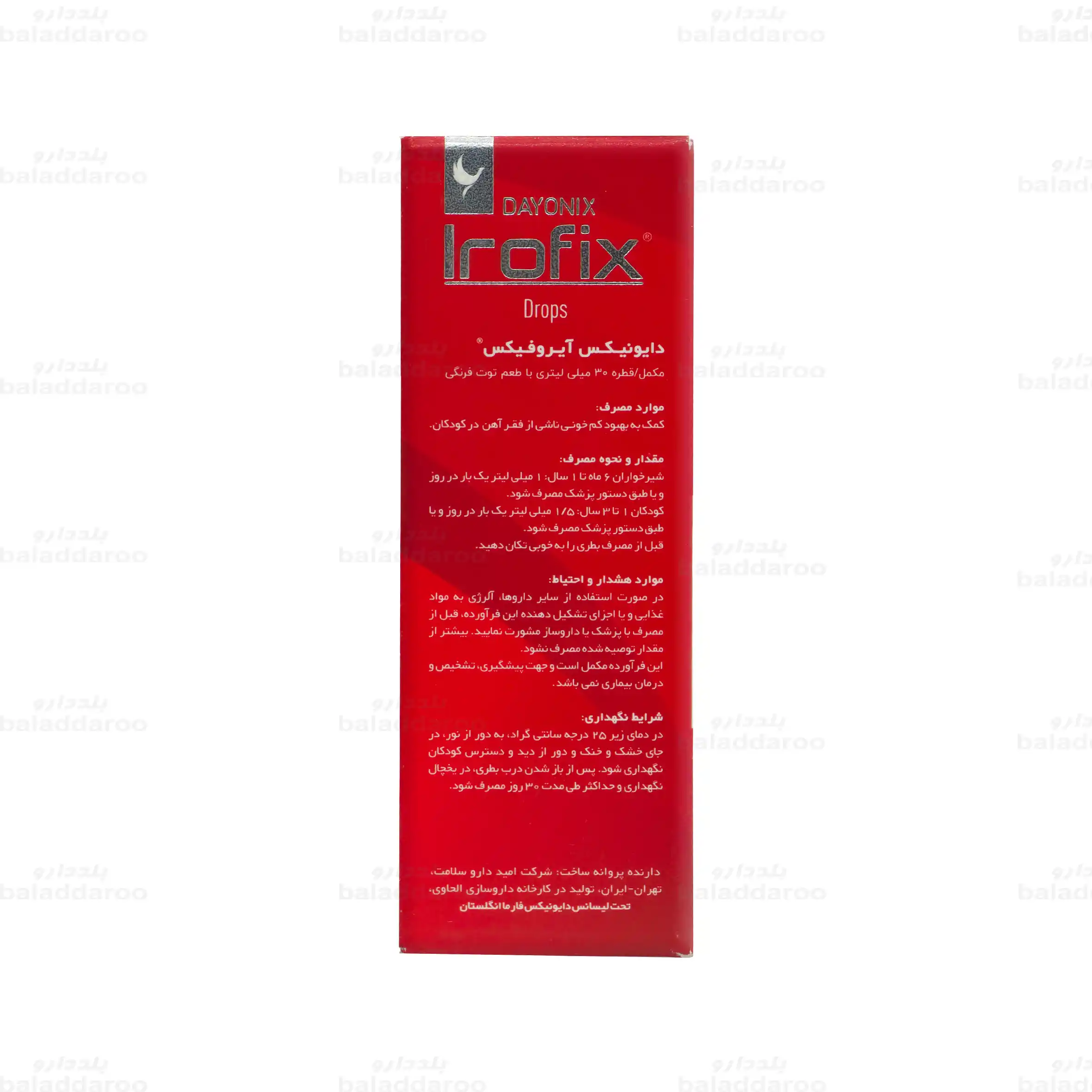 این قطره حاوی آهن پیروفسفات لیپوزومال و ویتامی D3 است که علاوه بر تامین آهن مورد نیاز کودکان در بازه سنی 6 ماه تا 3 سال، به بهبود کم خونی ناشی از فقر آهن کمک می کند. این محصول عوارض گوارشی را کاهش داده و از سیاه شدن دندان ها نیز جلوگیری می کند. این محصول به سفارش شرکت امید دارو سلامت تحت لیسانس دایونیکس فارما انگلستان با حجم 30 میلی لیتر به همراه یک سرنگ مدرج در کارخانه داروسازی الحاوی تولید می شود.
