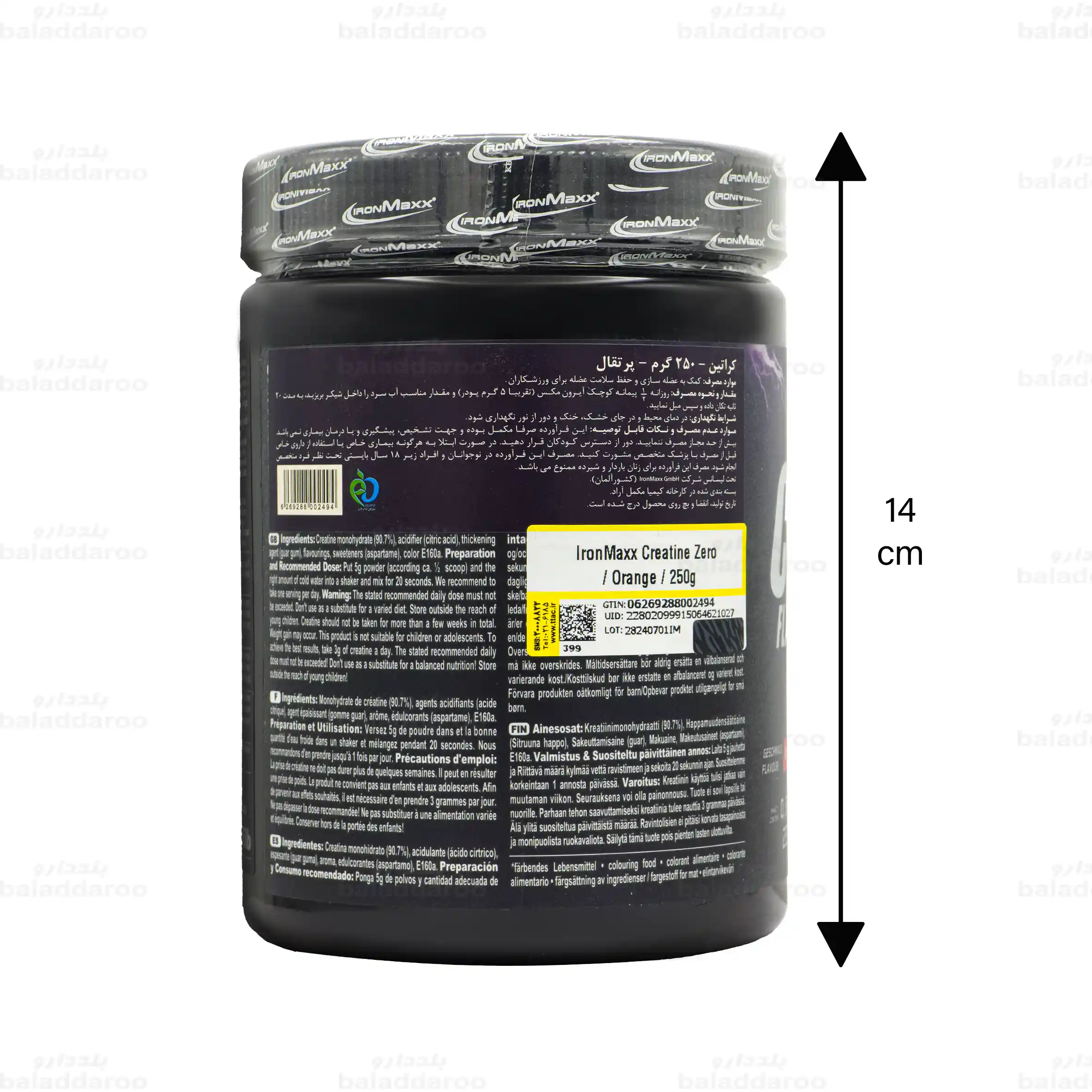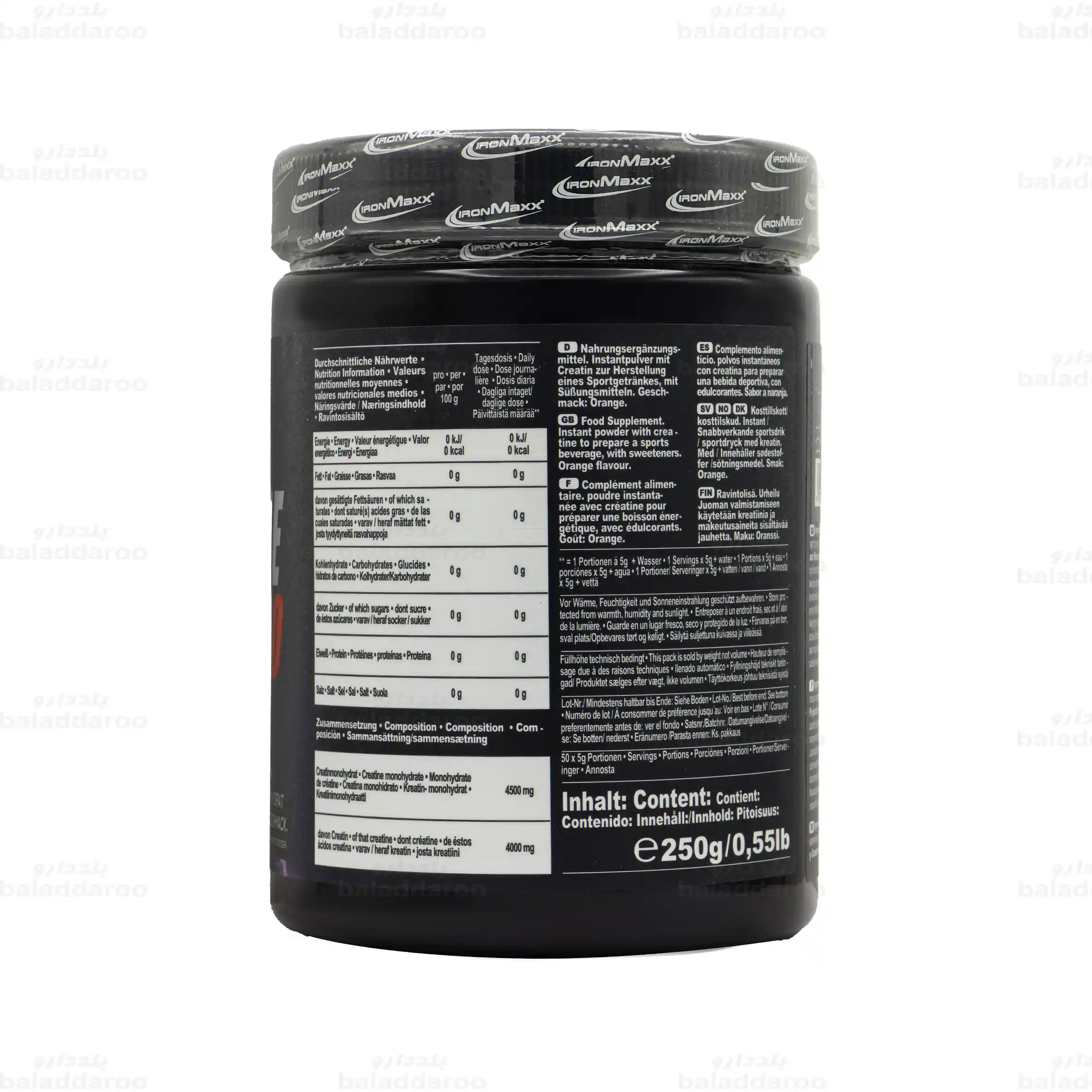 یکی از مکمل های محبوب میان ورزشکاران و بدنسازان است که حاوی 100 درصد کراتین مونوهیدرات است. این محصول در عضله سازی و حفظ سلامت عضلات در ورزشکاران نقش داشته و به افزایش قدرت و توان جسمانی حین انجام تمرینات استقامتی و قدرتی کمک شایانی می کند. این مکمل فاقد لاکتوز، شکر، گلوتن و چربی می باشد و در وزن 250 گرم و با طعم پرتقال تحت لیسانس شرکت آیرون مکس آلمان تولید می شود.