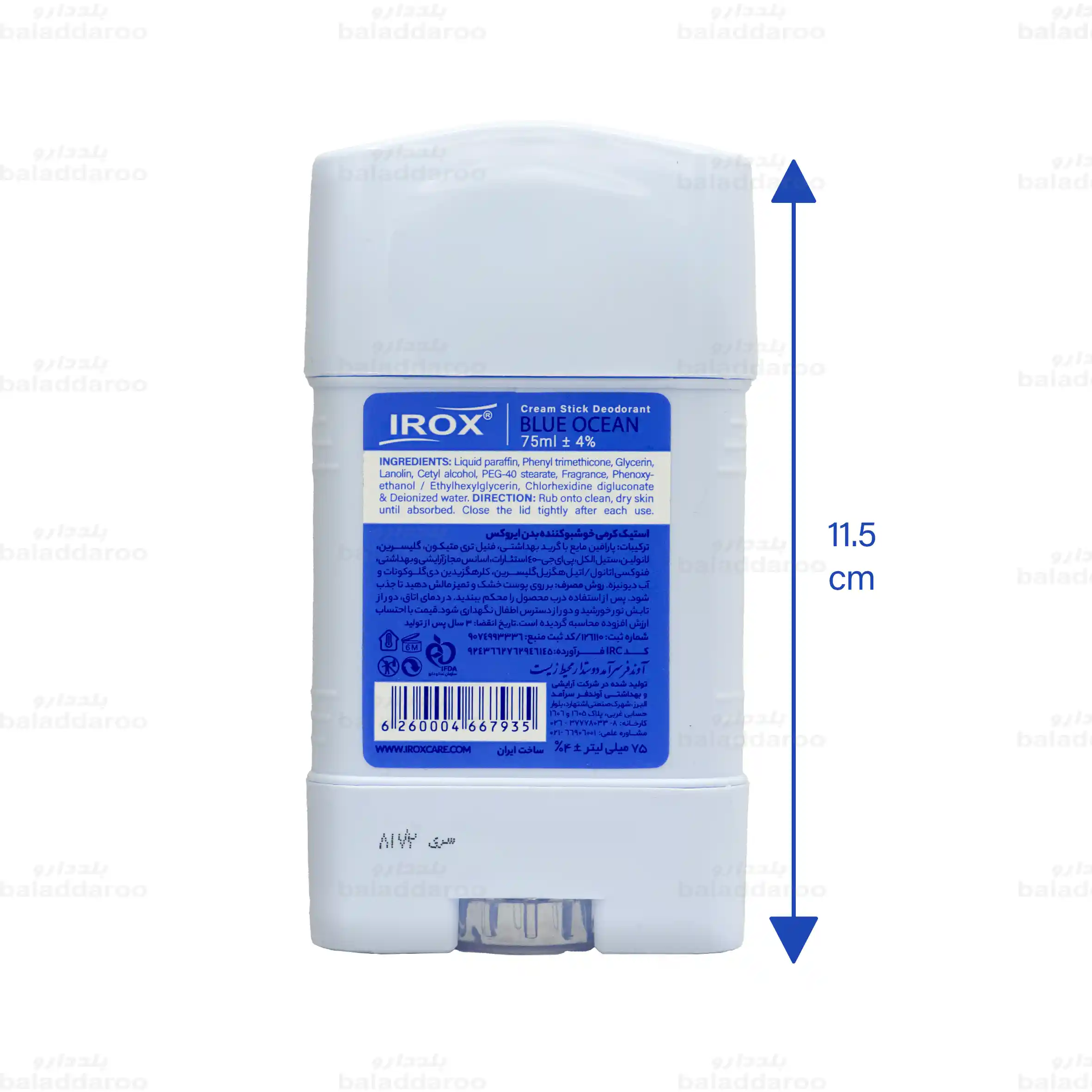 این فراورده یک ضد تعریق با ماندگاری بالا 48 ساعته و رایحه ای خنک و اقیانوسی طراحی شده است. استیک کرمی خوشبو کننده بدن زنانه بلو اوشن ایروکس با کنترل موثر تعریق و جلوگیری از بوی نا مطبوع، حس تازگی و طراوت را به پوست می بخشد. رایحه ملایم آن حس خنکی و تازگی اقیانوس را تداعی می کند و فرمولاسیون ایمن آن که فاقد الکل، پارابن و آلومینیوم است، برای پوست های حساس نیز مناسب می باشد. استفاده از این محصول باعث ایجاد لکه یا سفیدک روی لباس نمی شود و بسته بندی مدرن و کاربردی آن، استفاده روزانه را آسان می سازد.