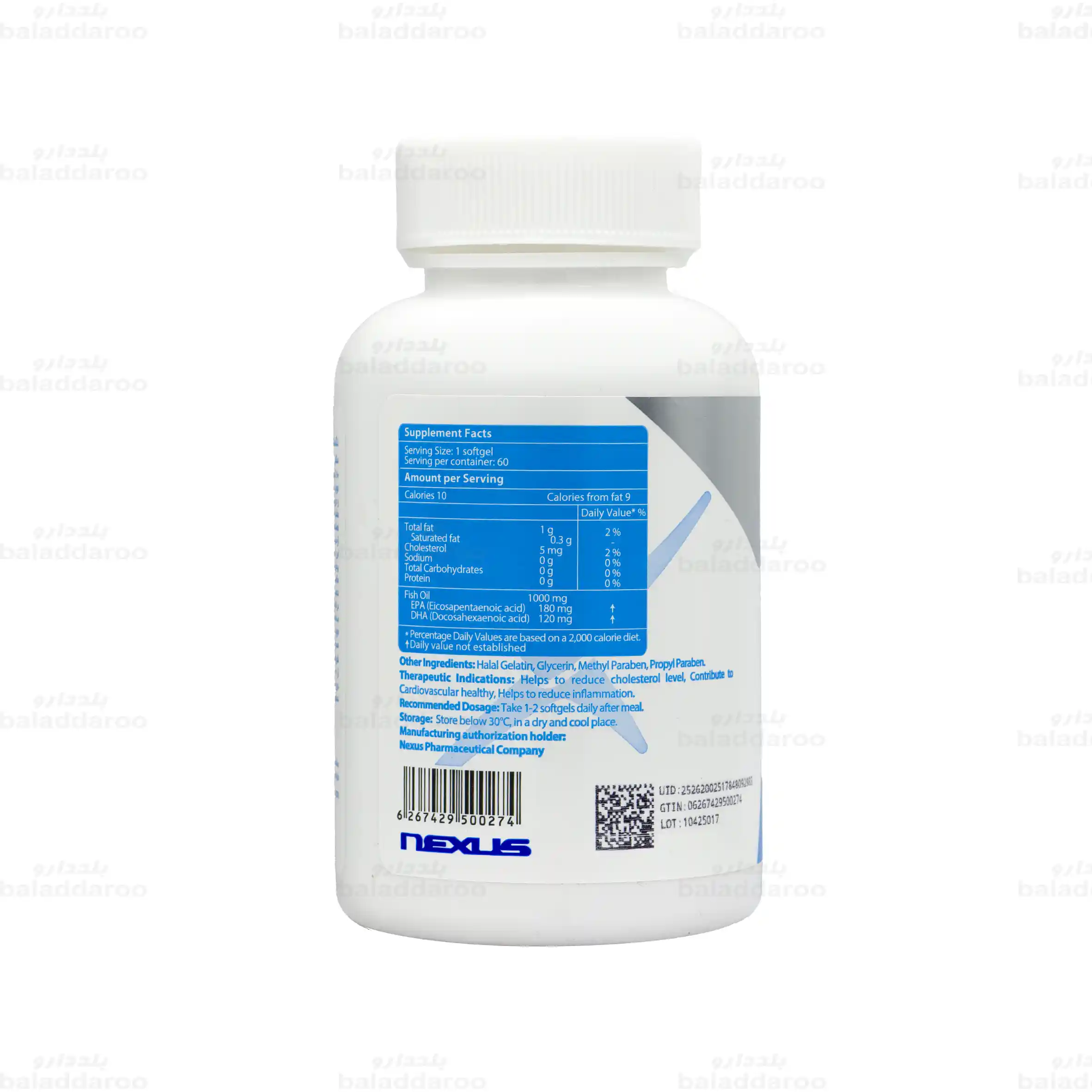 این فرآورده حاوی اسیدهای چرب امگا 3 است که در بهبود عملکرد بسیاری از بخش های بدن از جمله قلب، رگ های خونی، سیستم ایمنی، ریه و … نقش اساسی دارد. هر کپسول این مکمل حاوی 180 میلی گرم EPA و 120 میلی گرم DHA است که با خواص ضد التهابی خود، به کاهش کلسترول، تری گلیسیرید و سلامت قلب و عروق کمک شایانی می کند. همچنین می تواند در کنترل علائم سندروم پیش از قاعدگی و کاهش دردهای دوران قاعدگی موثر واقع شود. این محصول در بسته های 60 عددی به صورت کپسول ژله ای در شرکت دارویی نکسوس بسته بندی می گردد.