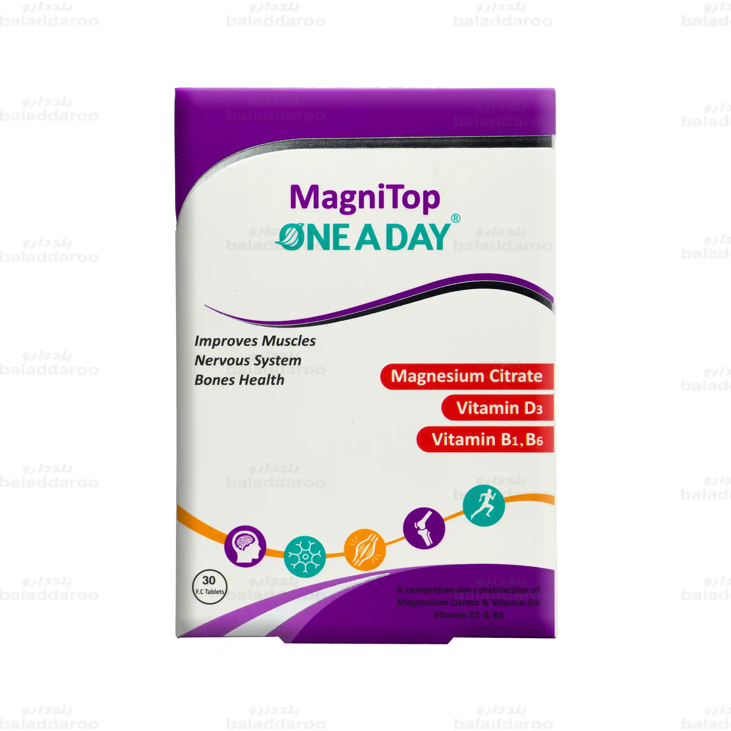 قرص مگنی تاپ وان ا دی حاوی منیزیم و ویتامین های گروه B و D است که سلامت عضلات، اعصاب و استخوان ها را بهبود می بخشد. این محصول به کاهش خستگی، گرفتگی عضلات و بهبود عملکرد سیستم عصبی کمک می کند.