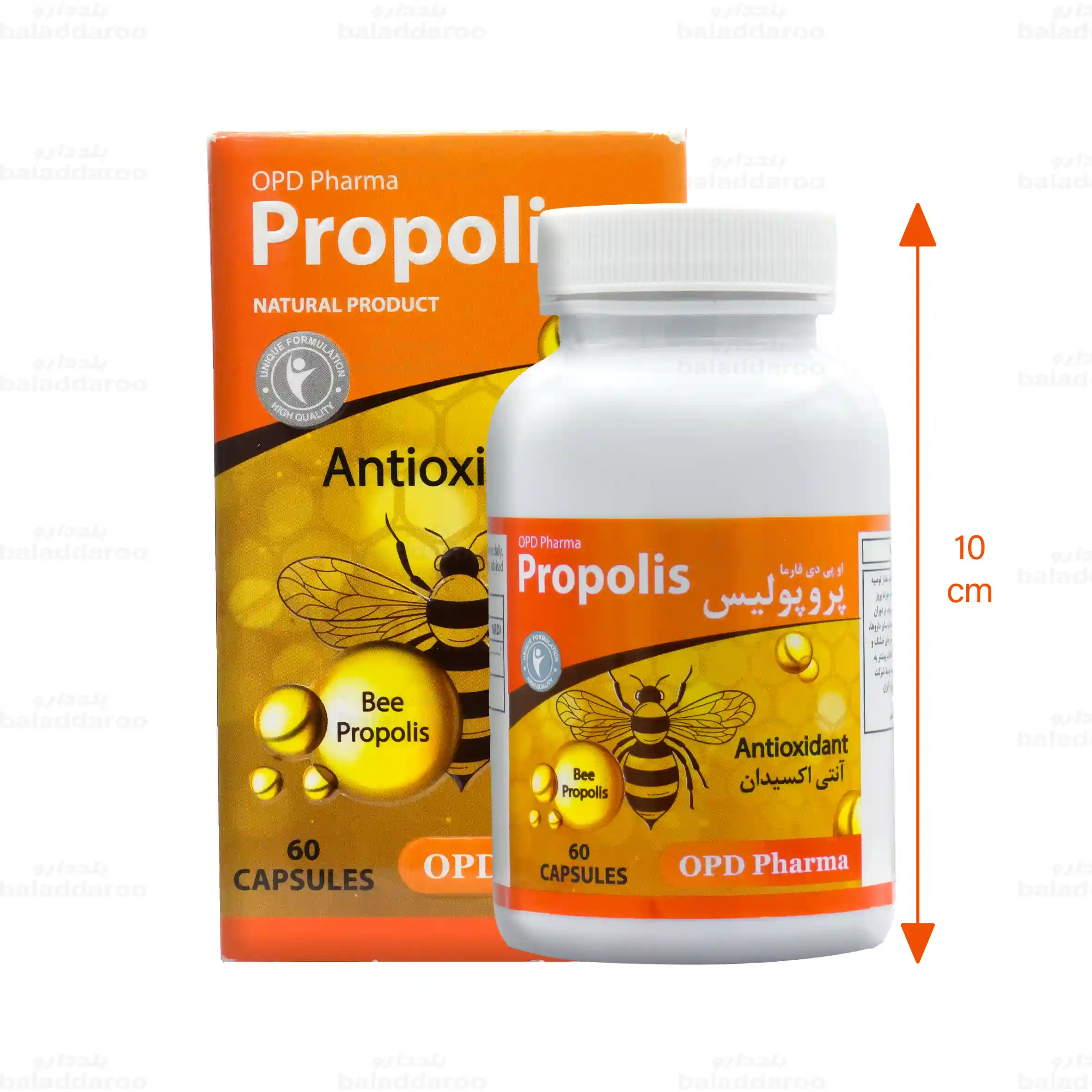 این مکمل، فرآورده ای متشکل از 500 میلی گرم عصاره برم موم یا همان پروپولیس است. این فرآورده خواص آنتی اکسیدانی، ضد باکتری، ضد ویروسی و ضد التهابی داشته و علاوه بر محافظت از سلول ها در برابر رادیکال های آزاد، در تقویت سیستم ایمنی نیز نقش موثری ایفا می کند. پروپولیس او پی دی فارما در بسته های 60 عددی توسط شرکت امید پارسینا دماوند تولید می شود.