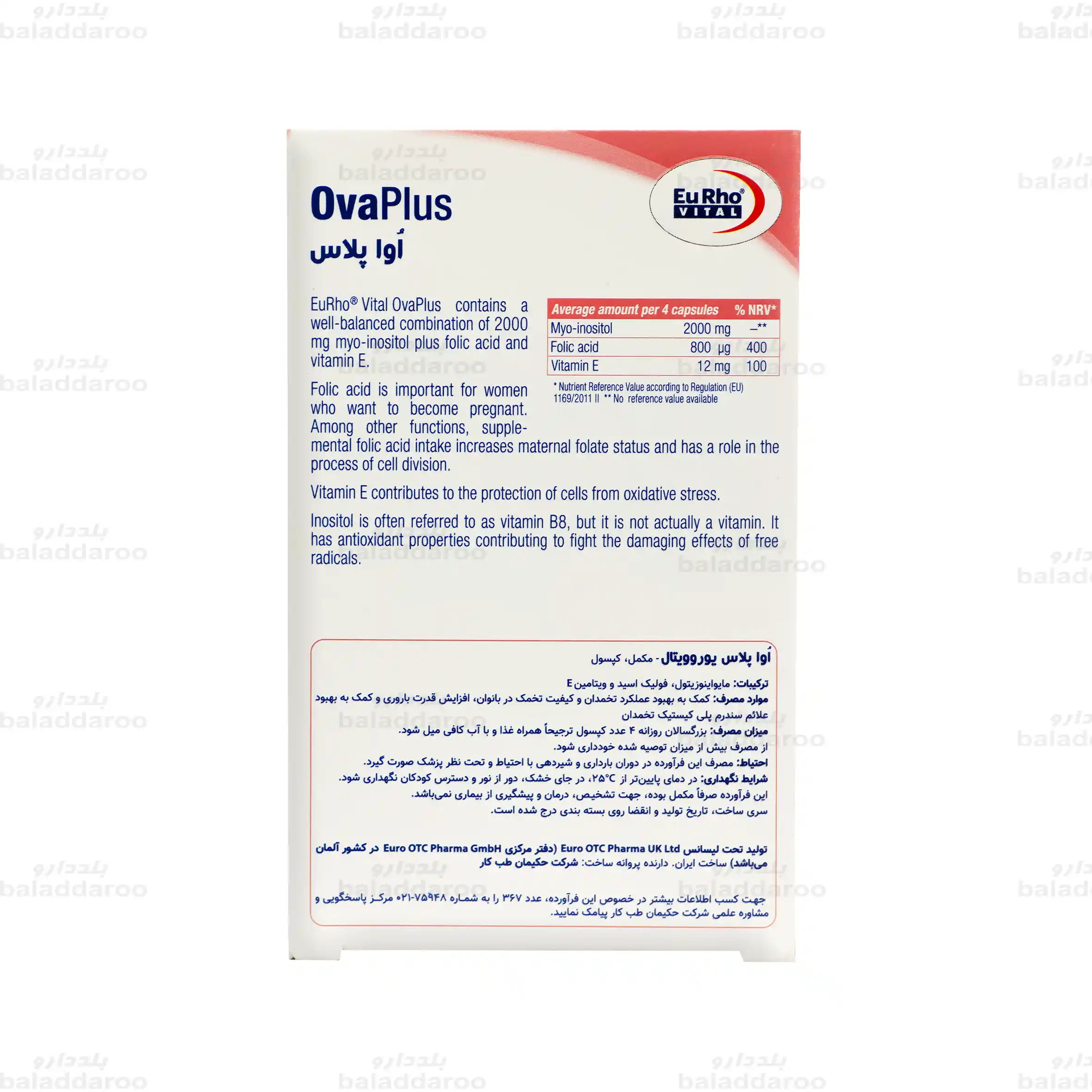 کپسول اوا پلاس یوروویتال حاوی مقادیر قابل توجهی مایواینوزیتول، ویتامین E و فولیک اسید می باشد که با کمک به بهبود عملکرد تخمدان و کیفیت تخمک منجر به افزایش قدرت باروری می شود. همچنین در بهبود علائم سندروم پلی کیستیک تخمدان نیز نقش دارد.