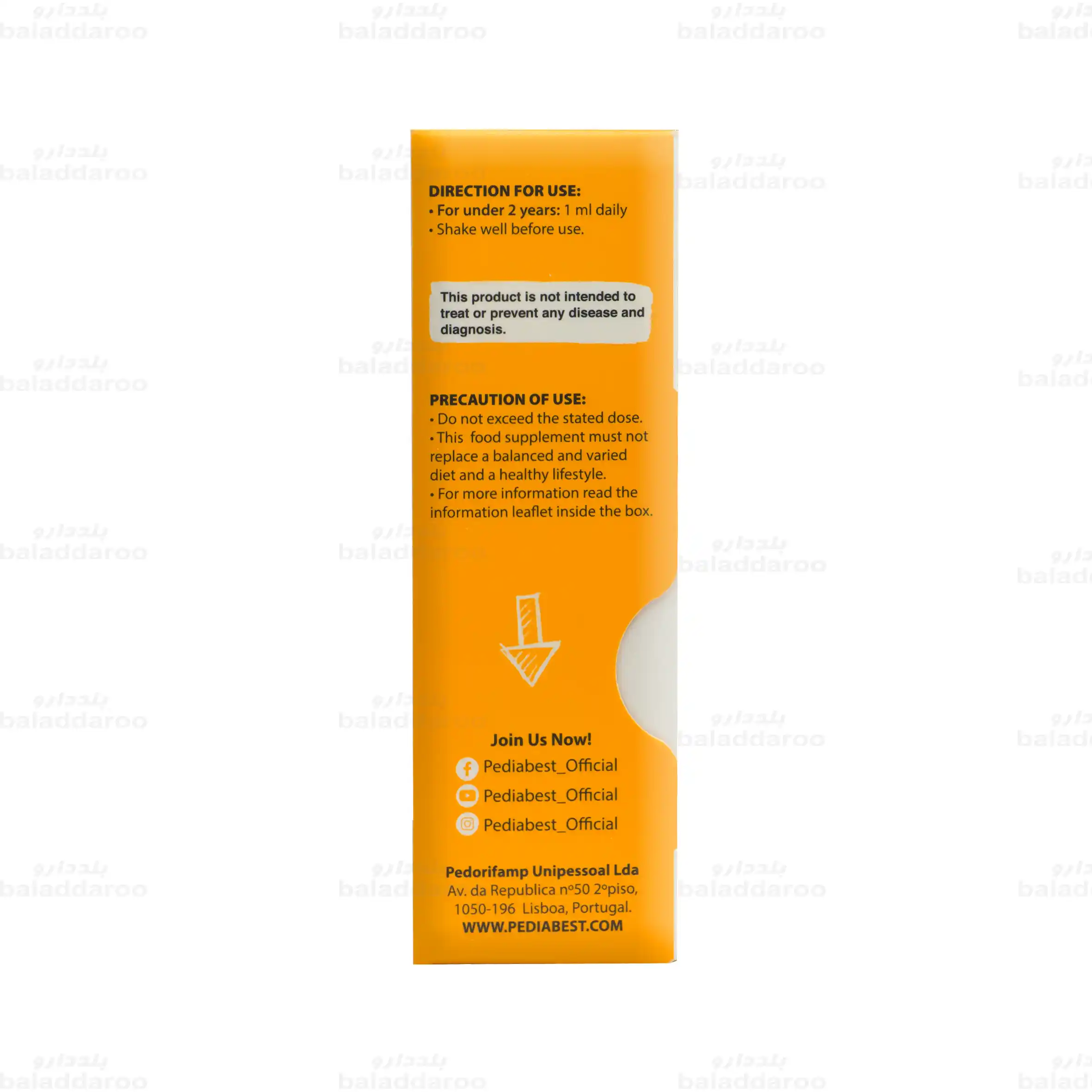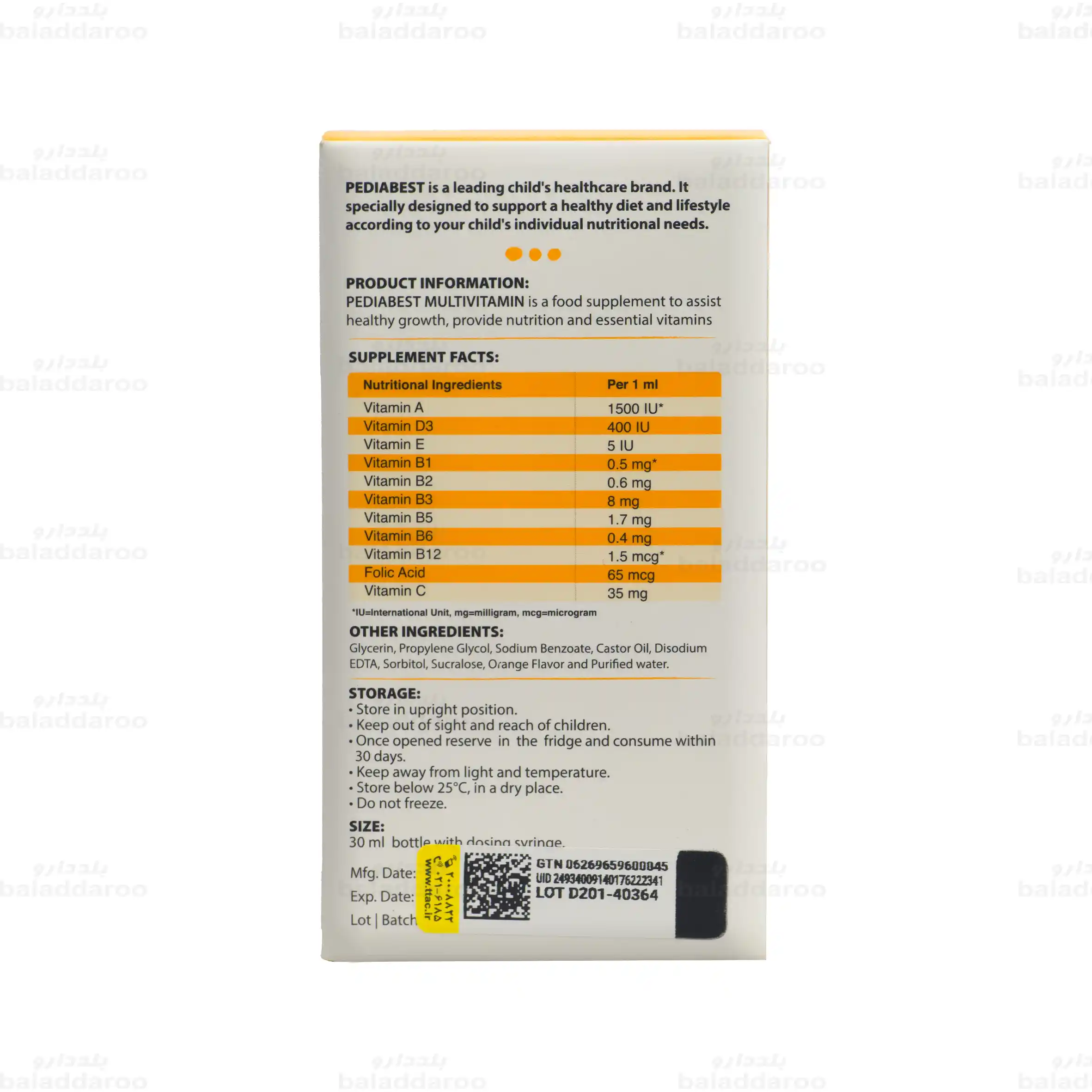 قطره مولتی ویتامین پدیابست یک مکمل تغذیه ای مناسب برای نوزادان و کودکان زیر دو سال است که به تامین ویتامین های ضروری برای رشد سالم آن ها کمک می کند. این محصول با طعم پرتقال و بسته بندی ۳۰ میلی لیتری تولید شده و تحت لیسانس کشور پرتغال عرضه می شود.