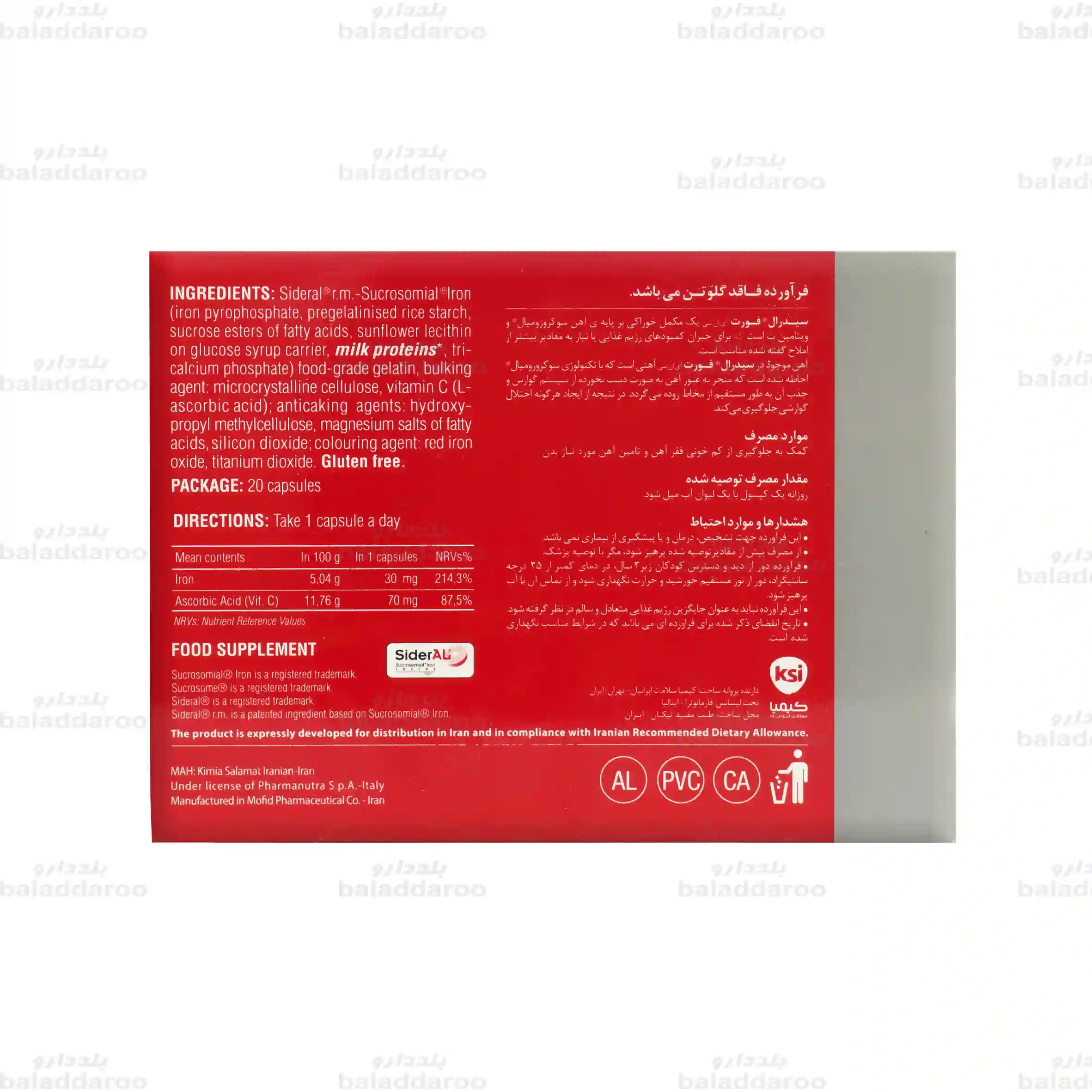 هر کپسول این مکمل حاوی 30 میلی گرم آهن به فرم سوکروزومیال و 70 میلی گرم ویتامین ث می باشد و در درمان کم خونی های ناشی از فقر آهن مورد استفاده قرار می گیرد. قیمت سیدرال فورت نیز مانند سایر محصولات موجود در داروخانه آنلاین بلد دارو، طبق فاکتورهای رسمی از سوی شرکت های پخش و تحت نظر سازمان غذا و دارو تعیین می گردد.