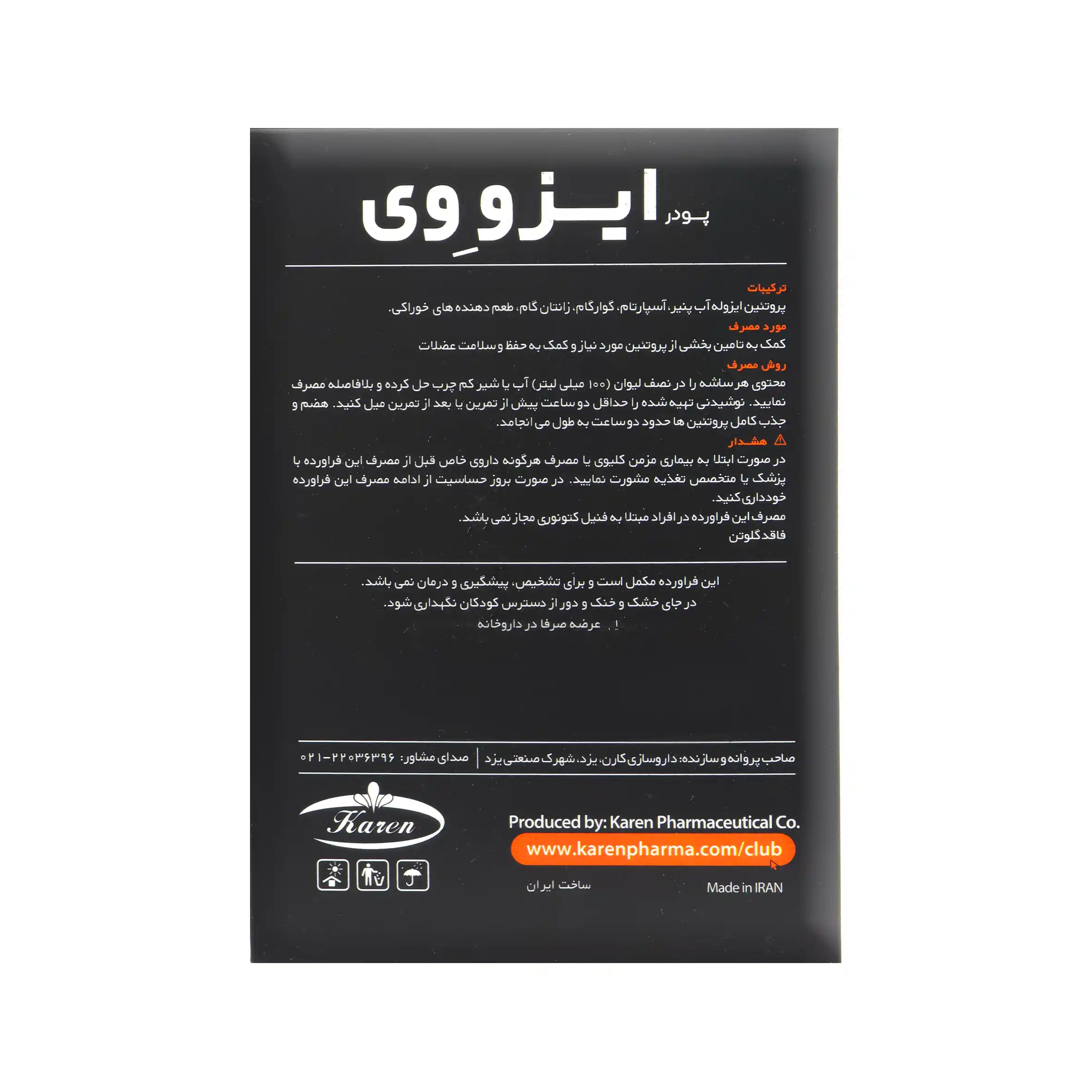 این مکمل حاوی پروتئین وی ایزوله است که به عضله سازی و جلوگیری از تحلیل عضلانی کمک شایانی می کند. قیمت ساشه ایزو وی کارن مانند سایر محصولات موجود در داروخانه آنلاین بلد دارو طبق فاکتور رسمی شرکت پخش و تحت نظارت سازمان غذا و دارو تعیین می گردد.