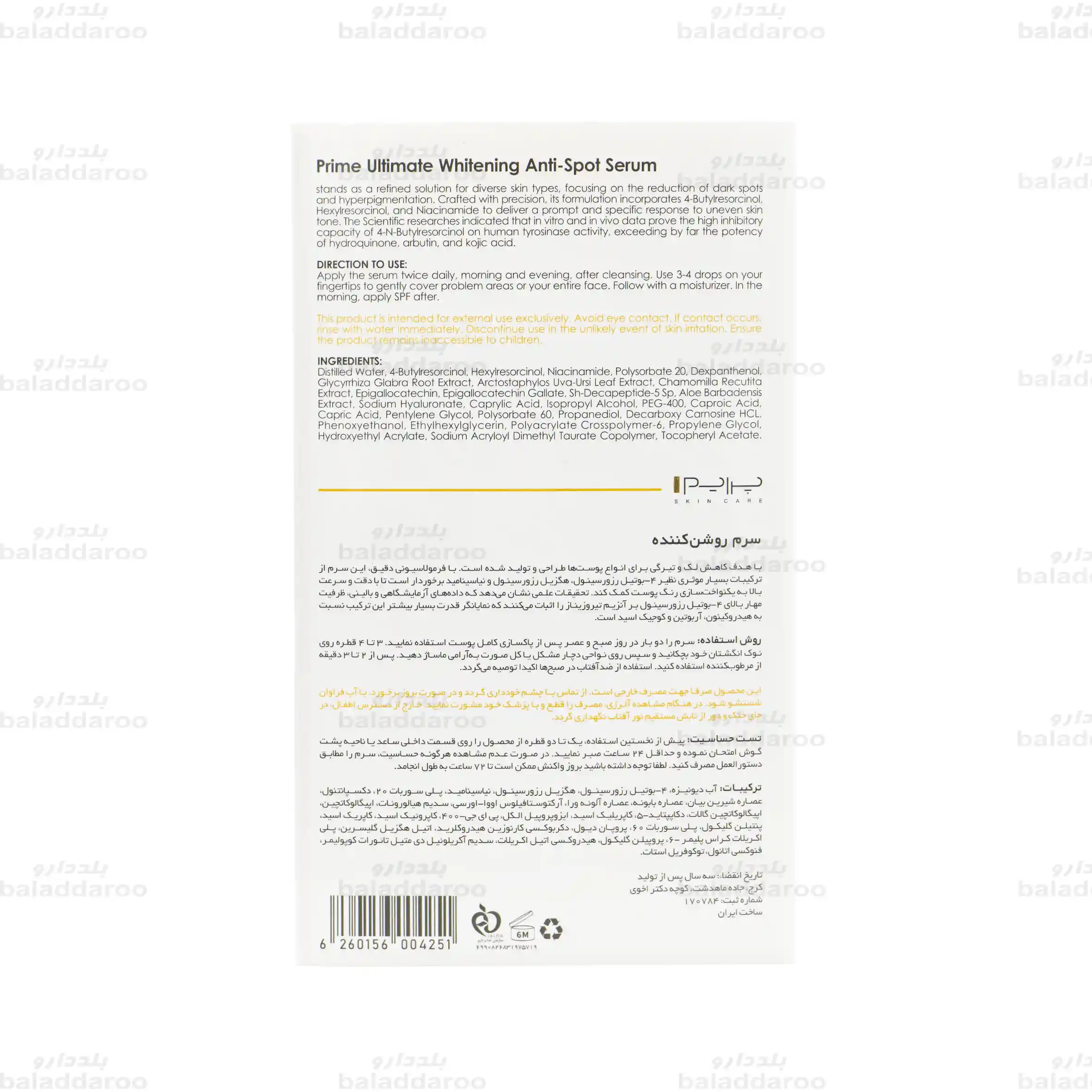 قیمت تمامی محصولات موجود در داروخانه آنلاین بلد دارو از جمله قیمت سرم روشن کننده و ضد لک پریم تحت نظارت سازمان غذا و دارو و بر اساس فاکتورهای رسمی تعیین می گردد.