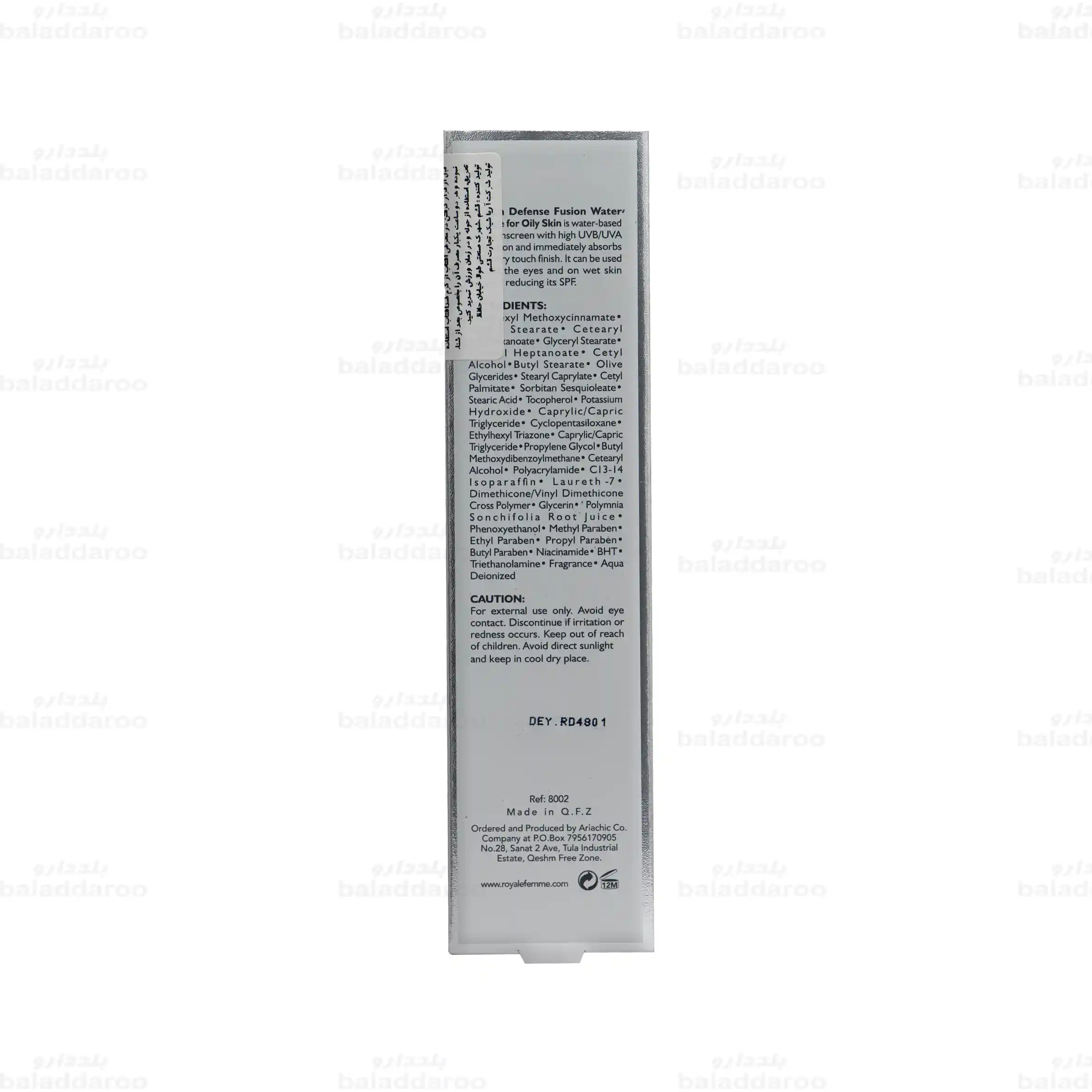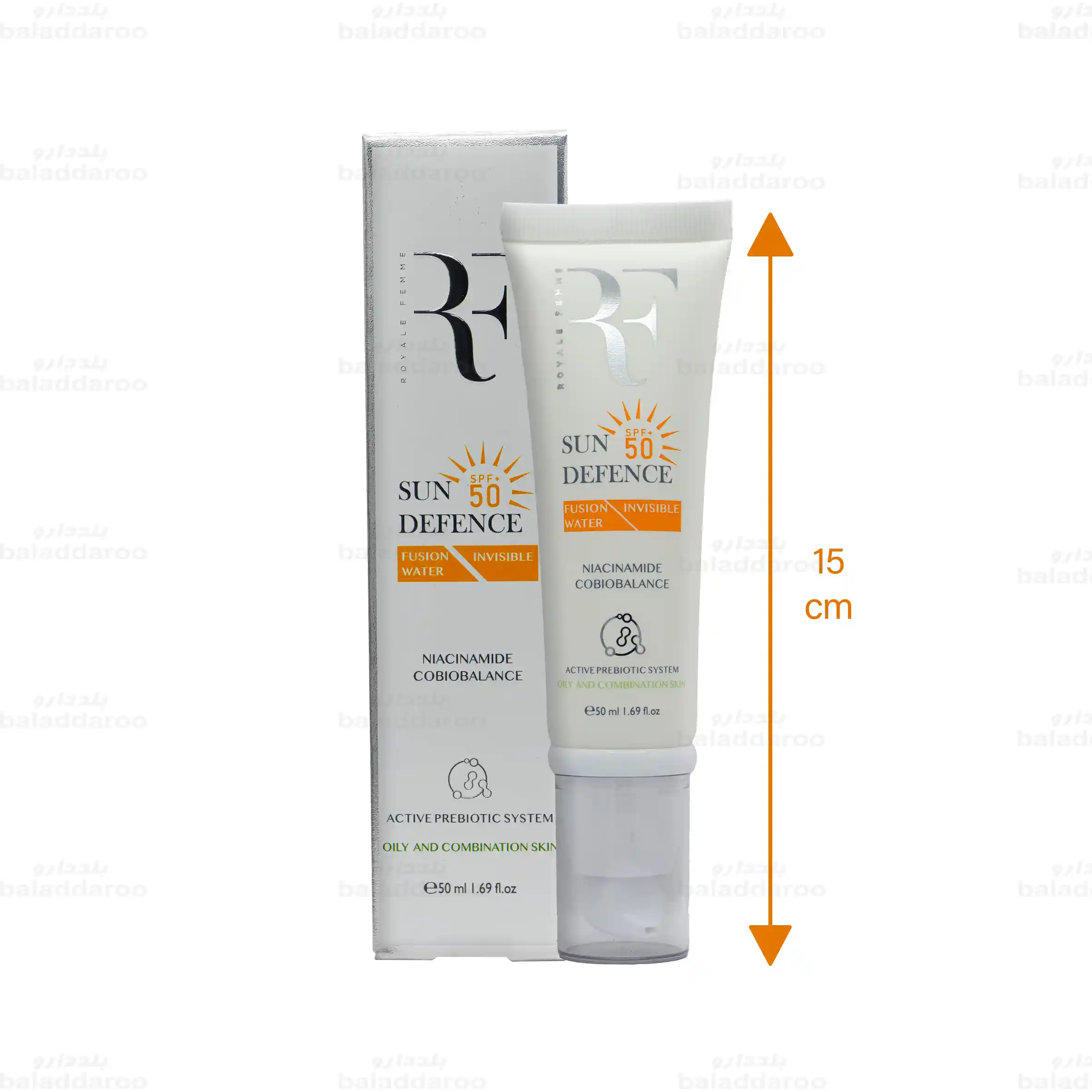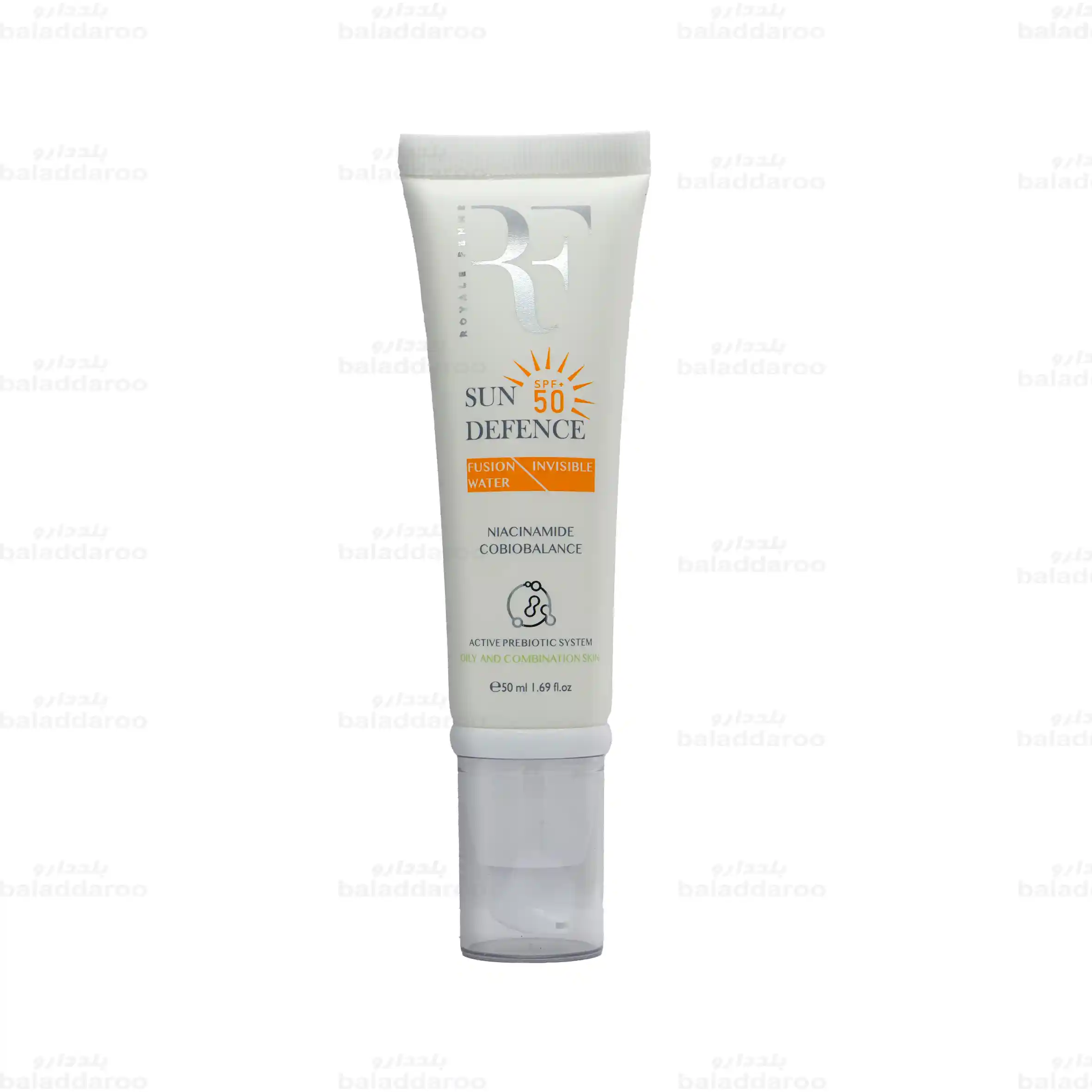 کرم ضد آفتاب فیوژن واتر بی رنگ پوست چرب SPF50 آر اف بر پایه آب، بافت بسیار سبک و جذب سریعی داشته که بدون اثر سفیدی و چسبندگی، از پوست در برابر آسیب اشعه های مضر خورشید محافظت می کند. همچنین حاوی ترکیباتی با خواص کنترل کننده ترشح چربی است و برای استفاده تمام قسمت های صورت حتی دور چشم مناسب است. ضد آفتاب بی رنگ پوست چرب رویال فم در برابر آب و تعریق مقاوم است و در حجم 50 میلی لیتر در شرکت آریا شیک تجارت قشم تولید می شود.